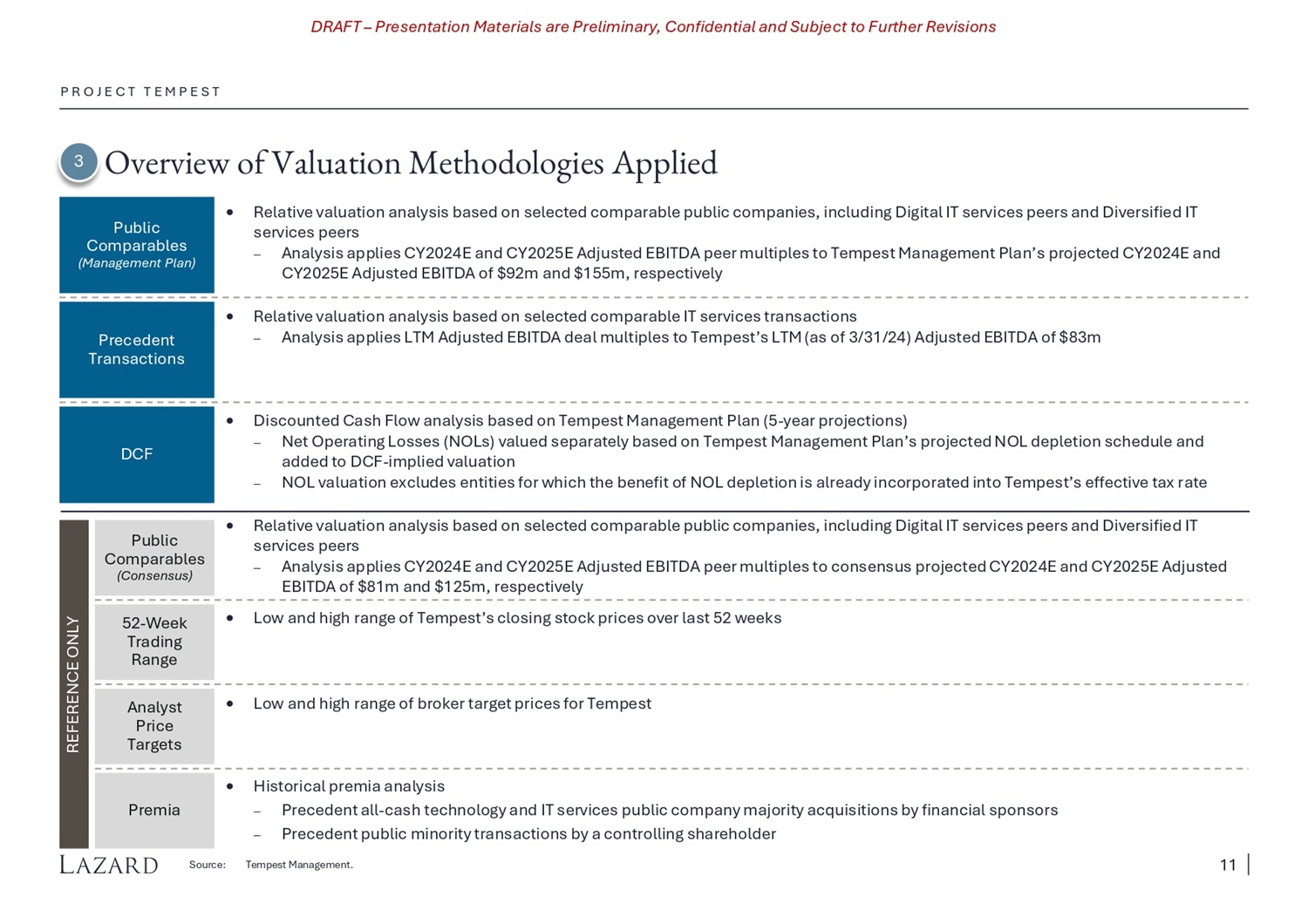 DRAFT – Presentation Materials are Preliminary, Confidential and Subject to Further Revisions Overview of Valuation Methodologies Applied P R O J E C T T E M P E S T 52 - Week Trading Range Analyst Price Targets DCF Discounted Cash Flow analysis based on Tempest Management Plan (5 - year projections) Net Operating Losses (NOLs) valued separately based on Tempest Management Plan’s projected NOL depletion schedule and added to DCF - implied valuation NOL valuation excludes entities for which the benefit of NOL depletion is already incorporated into Tempest’s effective tax rate Public Comparables (Management Plan) Relative valuation analysis based on selected comparable public companies, including Digital IT services peers and Diversified IT services peers Analysis applies CY2024E and CY2025E Adjusted EBITDA peer multiples to Tempest Management Plan’s projected CY2024E and CY2025E Adjusted EBITDA of $92m and $155m, respectively Relative valuation analysis based on selected comparable IT services transactions Analysis applies LTM Adjusted EBITDA deal multiples to Tempest’s LTM (as of 3/31/24) Adjusted EBITDA of $83m Precedent Transactions Low and high range of Tempest’s closing stock prices over last 52 weeks Low and high range of broker target prices for Tempest REFERENCE ONLY Premia Source: Historical premia analysis Precedent all - cash technology and IT services public company majority acquisitions by financial sponsors Precedent public minority transactions by a controlling shareholder Tempest Management. 3 Public Comparables (Consensus) Relative valuation analysis based on selected comparable public companies, including Digital IT services peers and Diversified IT services peers Analysis applies CY2024E and CY2025E Adjusted EBITDA peer multiples to consensus projected CY2024E and CY2025E Adjusted EBITDA of $81m and $125m, respectively 11