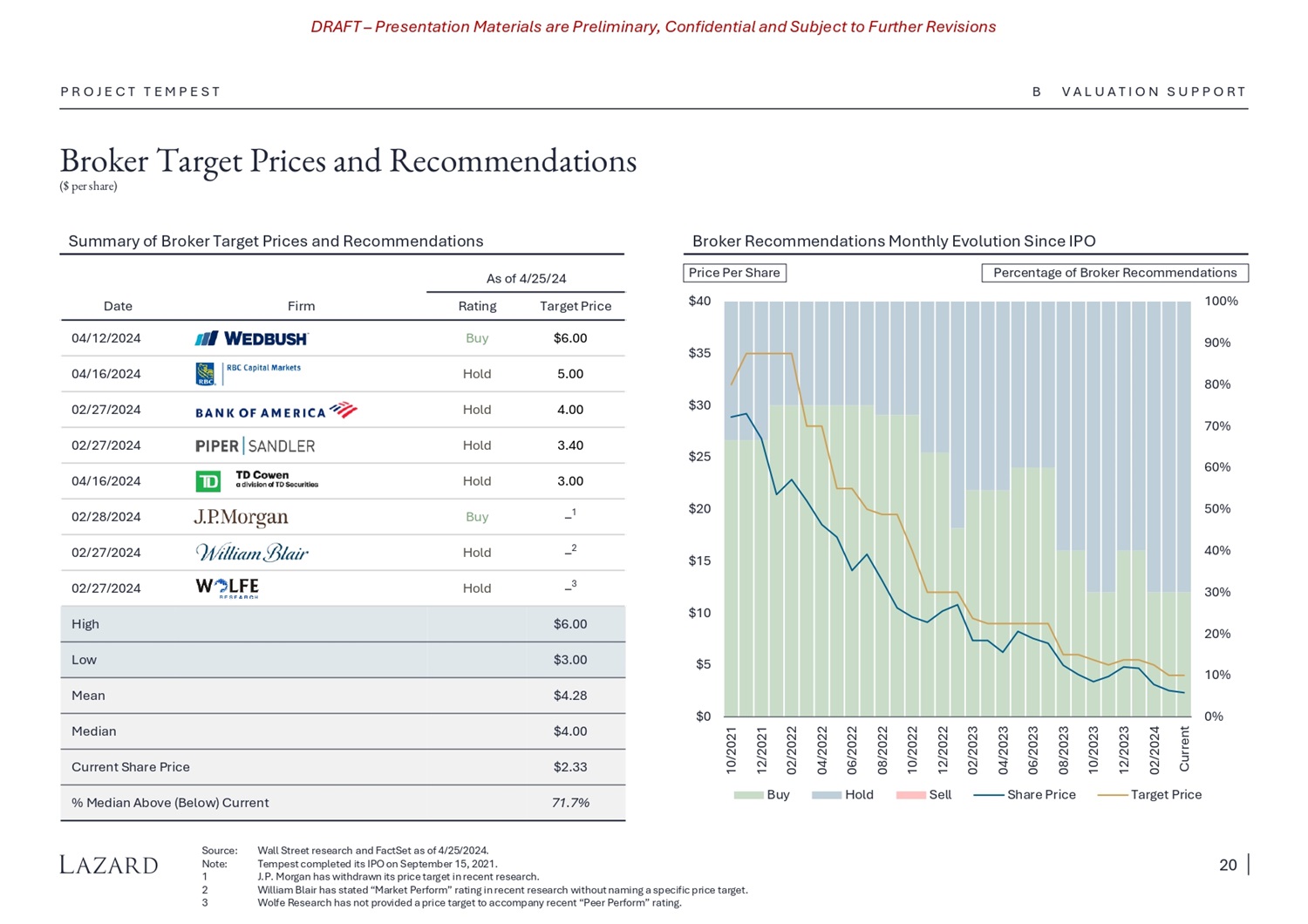 DRAFT – Presentation Materials are Preliminary, Confidential and Subject to Further Revisions P R O J E C T T E M P E S T Source: Wall Street research and FactSet as of 4/25/2024. Note: Tempest completed its IPO on September 15, 2021. 1 J.P. Morgan has withdrawn its price target in recent research. 2 William Blair has stated “Market Perform” rating in recent research without naming a specific price target. 3 Wolfe Research has not provided a price target to accompany recent “Peer Perform” rating. 0% 10% 20% 30% 40% 50% 60% 70% 80% 90% 100% $0 $5 $10 $15 $20 $25 $30 $35 $40 10/2021 12/2021 02/2022 04/2022 06/2022 08/2022 10/2022 12/2022 02/2023 04/2023 06/2023 08/2023 10/2023 12/2023 02/2024 Current Buy Hold Sell Share Price Target Price Price Per Share Percentage of Broker Recommendations Target Price Rating Firm Date $6.00 Buy 04/12/2024 5.00 Hold 04/16/2024 4.00 Hold 02/27/2024 3.40 Hold 02/27/2024 3.00 Hold 04/16/2024 – 1 Buy 02/28/2024 – 2 Hold 02/27/2024 – 3 Hold 02/27/2024 $6.00 High $3.00 Low $4.28 Mean $4.00 Median $2.33 Current Share Price 71.7% % Median Above (Below) Current As of 4/25/24 Broker Target Prices and Recommendations ($ per share) Summary of Broker Target Prices and Recommendations Broker Recommendations Monthly Evolution Since IPO B V A L U A T I O N S U P P O R T 20