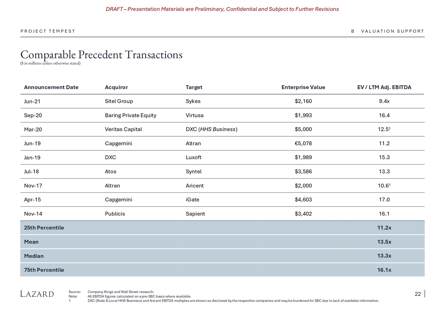DRAFT – Presentation Materials are Preliminary, Confidential and Subject to Further Revisions Comparable Companies Analysis ($ in billions) Enterprise Value / P R O J E C T T E M P E S T Source: Company filings, Wall Street research and FactSet as of 4/25/2024. Note: Years refer to calendar years. 1 All EBITDA figures shown are Adjusted EBITDA presented on a like - for - like basis excluding stock - based compensation. 2 Organic revenue growth figures are shown where available. B V A L U A T I O N S U P P O R T '24 – '25 '23 – '24 '22 – '23 25E 24E 23A/E 25E 24E 23A/E 25E 24E 23A/E 25E 24E 23A/E Value Value High Low Company Digital IT Services 10% 3% (3%) 18% 17% 18% 33% 31% 31% 13.0x 14.9x 14.5x 2.29x 2.52x 2.58x $12.1 $14.2 (25%) 17% EPAM Systems 19% 16% 11% 21% 20% 21% 38% 38% 38% 13.1 16.1 18.6 2.76 3.29 3.83 8.0 8.0 (28%) 31% Globant 16% (1%) 5% 22% 19% 19% 35% 32% 33% 6.1 8.4 8.0 1.36 1.60 1.54 1.5 1.7 (64%) 0% Endava 13% 1% 1% 19% 18% 19% 34% 31% 32% 9.5x 11.7x 11.2x 1.82x 2.06x 2.06x 25th Percentile 15% 6% 4% 20% 19% 19% 35% 34% 34% 10.7 13.2 13.7 2.14 2.47 2.65 Mean 16% 3% 5% 21% 19% 19% 35% 32% 33% 13.0 14.9 14.5 2.29 2.52 2.58 Median 18% 9% 8% 22% 20% 20% 37% 35% 36% 13.1 15.5 16.5 2.53 2.90 3.21 75th Percentile Diversified IT Services 7% 3% 3% 22% 22% 22% 33% 33% 33% 12.4x 13.3x 13.9x 2.77x 2.96x 3.05x $197.2 $199.2 (20%) 17% Accenture 7% 2% 4% 16% 16% 16% 27% 27% 27% 9.5 10.3 10.6 1.55 1.65 1.68 40.5 38.3 (11%) 32% Capgemini 5% 0% (1%) 20% 19% 19% 35% 35% 35% 7.9 8.5 8.8 1.56 1.64 1.64 31.8 33.6 (16%) 14% Cognizant Tech 6% 1% 1% 18% 18% 17% 30% 30% 30% 8.7x 9.4x 9.7x 1.56x 1.65x 1.66x 25th Percentile 6% 2% 2% 20% 19% 19% 31% 32% 31% 9.9 10.7 11.1 1.96 2.09 2.12 Mean 7% 2% 3% 20% 19% 19% 33% 33% 33% 9.5 10.3 10.6 1.56 1.65 1.68 Median 7% 2% 4% 21% 21% 20% 34% 34% 34% 10.9 11.8 12.2 2.17 2.31 2.37 75th Percentile 7% 1% (0%) 18% 17% 18% 33% 31% 31% 8.3x 9.0x 9.2x 1.56x 1.64x 1.65x Global 25th Perc. 11% 4% 3% 20% 19% 19% 33% 33% 33% 10.3 11.9 12.4 2.05 2.28 2.39 Global Mean 8% 2% 4% 20% 19% 19% 34% 32% 33% 10.9 11.8 12.2 1.93 2.09 2.13 Global Median 14% 3% 5% 22% 20% 20% 35% 34% 34% 12.9 14.5 14.4 2.64 2.85 2.94 Global 75th Perc. % Ch. 52 Wk. Equity Enterprise Revenue Adj. EBITDA 1 Gross Margin Adj. EBITDA Margin 1 Revenue Growth 2 21