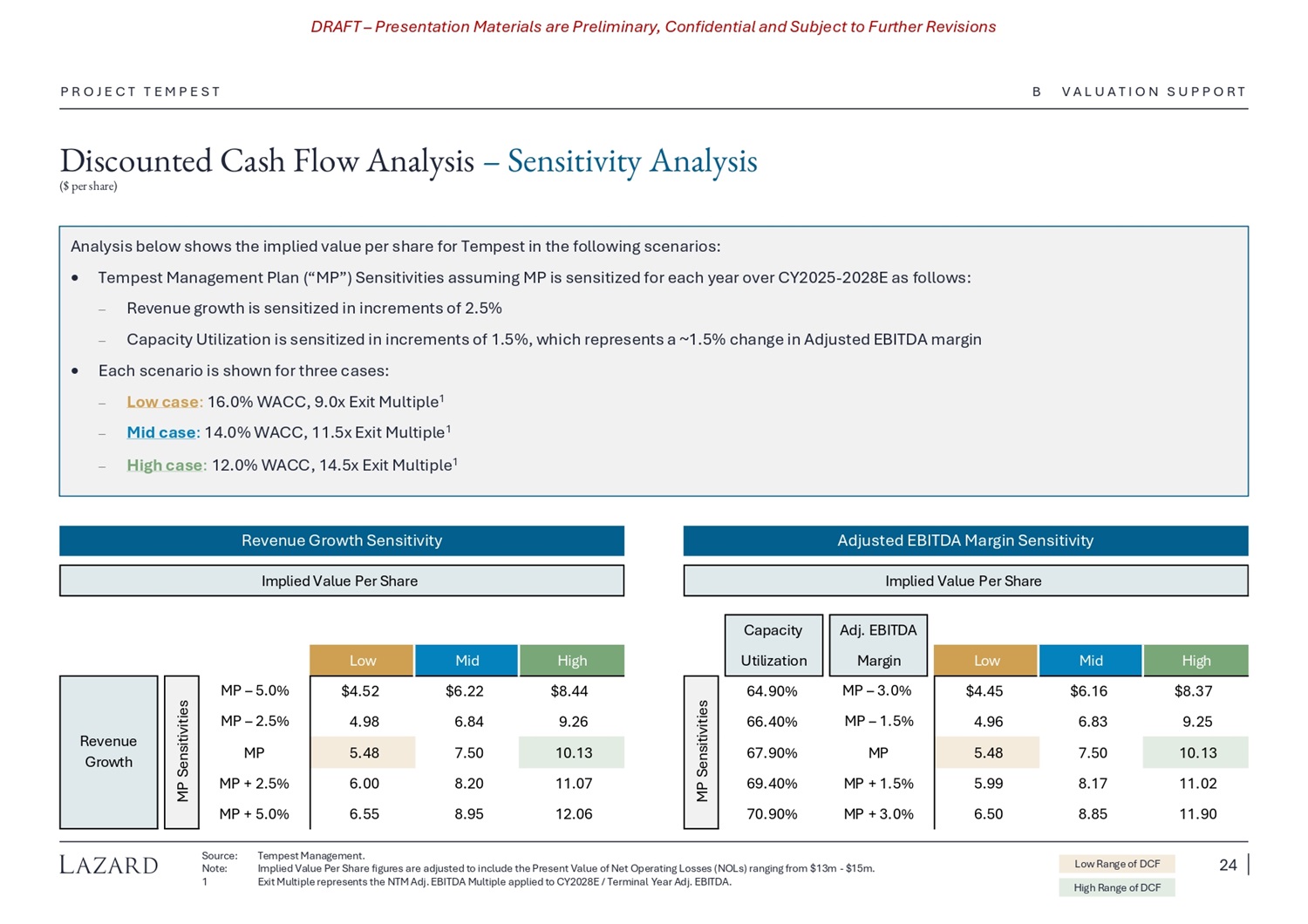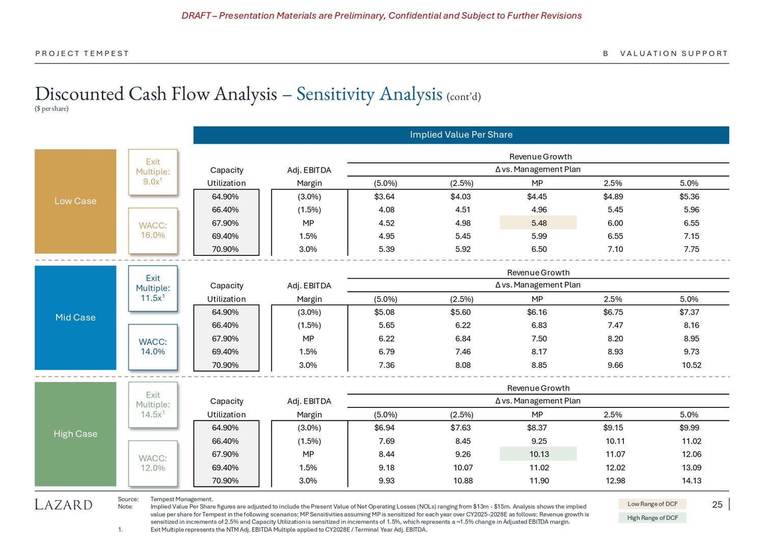 DRAFT – Presentation Materials are Preliminary, Confidential and Subject to Further Revisions Discounted Cash Flow Analysis – Sensitivity Analysis ($ per share) P R O J E C T T E M P E S T Analysis below shows the implied value per share for Tempest in the following scenarios: Tempest Management Plan (“MP”) Sensitivities assuming MP is sensitized for each year over CY2025 - 2028E as follows: Revenue growth is sensitized in increments of 2.5% Capacity Utilization is sensitized in increments of 1.5%, which represents a ~1.5% change in Adjusted EBITDA margin Each scenario is shown for three cases: Low case : 16.0% WACC, 9.0x Exit Multiple 1 Mid case : 14.0% WACC, 11.5x Exit Multiple 1 High case : 12.0% WACC, 14.5x Exit Multiple 1 Revenue Growth Sensitivity Adjusted EBITDA Margin Sensitivity Source: Note: 1 Tempest Management. Implied Value Per Share figures are adjusted to include the Present Value of Net Operating Losses (NOLs) ranging from $13m - $15m. Exit Multiple represents the NTM Adj. EBITDA Multiple applied to CY2028E / Terminal Year Adj. EBITDA. High Range of DCF Low Range of DCF High Mid Low $8.44 9.26 $6.22 6.84 $4.52 4.98 10.13 7.50 5.48 11.07 12.06 8.20 8.95 6.00 6.55 MP Sensitivities Revenue Growth Adj. EBITDA Capacity High Mid Low Margin Utilization $8.37 $6.16 $4.45 MP – 3.0% 64.90% s MP – 5.0% 9.25 6.83 4.96 MP – 1.5% 66.40% ivit ie MP – 2.5% 10.13 7.50 5.48 MP 67.90% ens it MP 11.02 8.17 5.99 MP + 1.5% 69.40% MP S MP + 2.5% 11.90 8.85 6.50 MP + 3.0% 70.90% MP + 5.0% Implied Value Per Share Implied Value Per Share B V A L U A T I O N S U P P O R T 24