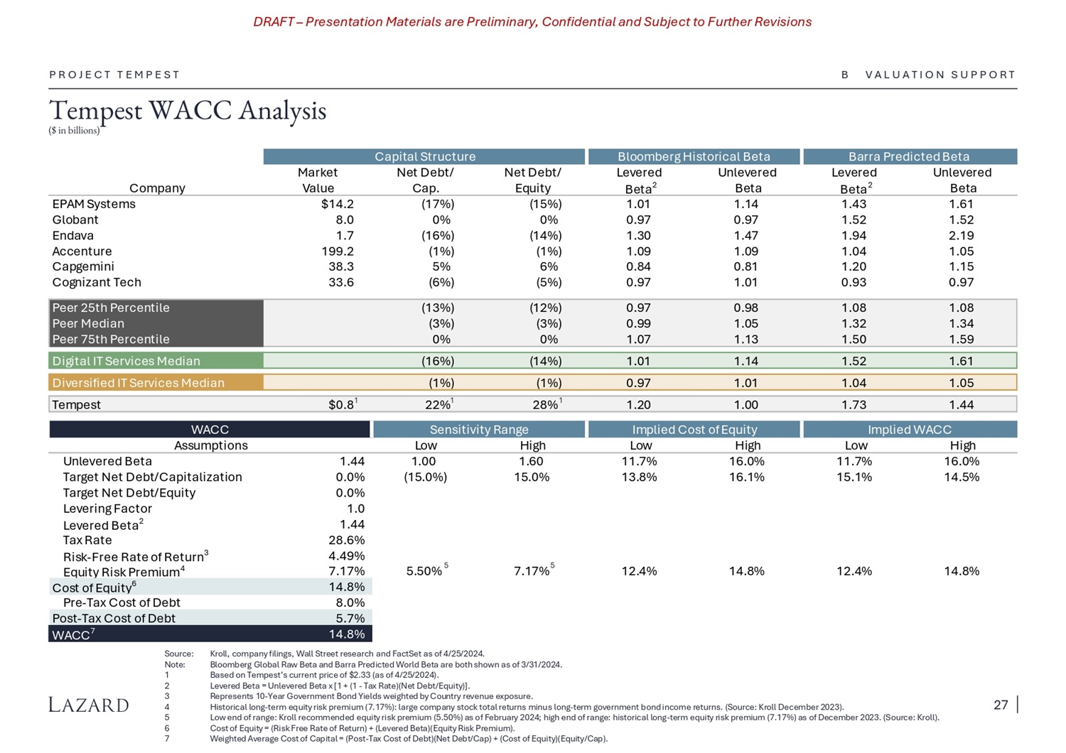 DRAFT – Presentation Materials are Preliminary, Confidential and Subject to Further Revisions Tempest WACC Analysis ($ in billions) P R O J E C T T E M P E S T Source: Kroll, company filings, Wall Street research and FactSet as of 4/25/2024. Note: Bloomberg Global Raw Beta and Barra Predicted World Beta are both shown as of 3/31/2024. 1 Based on Tempest’s current price of $2.33 (as of 4/25/2024). 2 Levered Beta = Unlevered Beta x [1 + (1 - Tax Rate)(Net Debt/Equity)]. 3 Represents 10 - Year Government Bond Yields weighted by Country revenue exposure. 4 Historical long - term equity risk premium (7.17%): large company stock total returns minus long - term government bond income returns. (Source: Kroll December 2023). 5 Low end of range: Kroll recommended equity risk premium (5.50%) as of February 2024; high end of range: historical long - term equity risk premium (7.17%) as of December 2023. (Source: Kroll). 6 Cost of Equity = (Risk Free Rate of Return) + (Levered Beta)(Equity Risk Premium). 7 Weighted Average Cost of Capital = (Post - Tax Cost of Debt)(Net Debt/Cap) + (Cost of Equity)(Equity/Cap). Pre - Tax Cost of Debt 8.0% Post - Tax Cost of Debt 5.7% WACC 7 14.8% Barra Predicted Beta Bloomberg Historical Beta Capital Structure Unlevered Levered Unlevered Levered Net Debt/ Net Debt/ Market Beta Beta 2 Beta Beta 2 Equity Cap. Value Company 1.61 1.43 1.14 1.01 (15%) (17%) $14.2 EPAM Systems 1.52 1.52 0.97 0.97 0% 0% 8.0 Globant 2.19 1.94 1.47 1.30 (14%) (16%) 1.7 Endava 1.05 1.04 1.09 1.09 (1%) (1%) 199.2 Accenture 1.15 1.20 0.81 0.84 6% 5% 38.3 Capgemini 0.97 0.93 1.01 0.97 (5%) (6%) 33.6 Cognizant Tech 1.08 1.08 0.98 0.97 (12%) (13%) Peer 25th Percentile 1.34 1.32 1.05 0.99 (3%) (3%) Peer Median 1.59 1.50 1.13 1.07 0% 0% Peer 75th Percentile 1.61 1.52 1.14 1.01 (14%) (16%) Digital IT Services Median 1.05 1.04 1.01 0.97 (1%) (1%) Diversified IT Services Median 1.44 1.73 1.00 1.20 28% 1 22% 1 $0.8 1 Tempest d WACC Implie Implied Cost of Equity ty Range Sensitivi WACC High Low High Low High Low Assumptions 16.0% 11.7% 16.0% 11.7% 1.60 1.00 1.44 Unlevered Beta 14.5% 15.1% 16.1% 13.8% 15.0% (15.0%) 0.0% Target Net Debt/Capitalization 0.0% Target Net Debt/Equity 1.0 Levering Factor 1.44 Levered Beta 2 28.6% Tax Rate 14.8% 12.4% 14.8% 12.4% 7.17% 5 5.50% 5 4.49% 7.17% Risk - Free Rate of Return 3 Equity Risk Premium 4 14.8% Cost of Equity 6 B V A L U A T I O N S U P P O R T 27