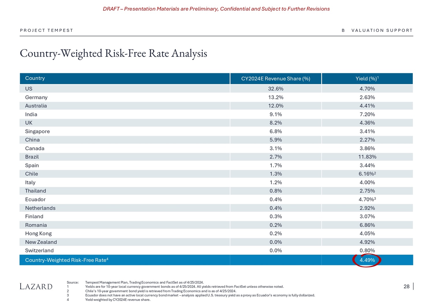 DRAFT – Presentation Materials are Preliminary, Confidential and Subject to Further Revisions Country - Weighted Risk - Free Rate Analysis P R O J E C T T E M P E S T Source: Tempest Management Plan, Trading Economics and FactSet as of 4/25/2024. 1 Yields are for 10 - year local currency government bonds as of 4/25/2024. All yields retrieved from FactSet unless otherwise noted. 2 Chile’s 10 - year government bond yield is retrieved from Trading Economics and is as of 4/25/2024. 3 Ecuador does not have an active local currency bond market – analysis applied U.S. treasury yield as a proxy as Ecuador’s economy is fully dollarized. 4 Yield weighted by CY2024E revenue share. Yield (%) 1 CY2024E Revenue Share (%) Country 4.70% 32.6% US 2.63% 13.2% Germany 4.41% 12.0% Australia 7.20% 9.1% India 4.36% 8.2% UK 3.41% 6.8% Singapore 2.27% 5.9% China 3.86% 3.1% Canada 11.83% 2.7% Brazil 3.44% 1.7% Spain 6.16% 2 1.3% Chile 4.00% 1.2% Italy 2.75% 0.8% Thailand 4.70% 3 0.4% Ecuador 2.92% 0.4% Netherlands 3.07% 0.3% Finland 6.86% 0.2% Romania 4.05% 0.2% Hong Kong 4.92% 0.0% New Zealand 0.80% 0.0% Switzerland 4.49% Country - Weighted Risk - Free Rate 4 B V A L U A T I O N S U P P O R T 28