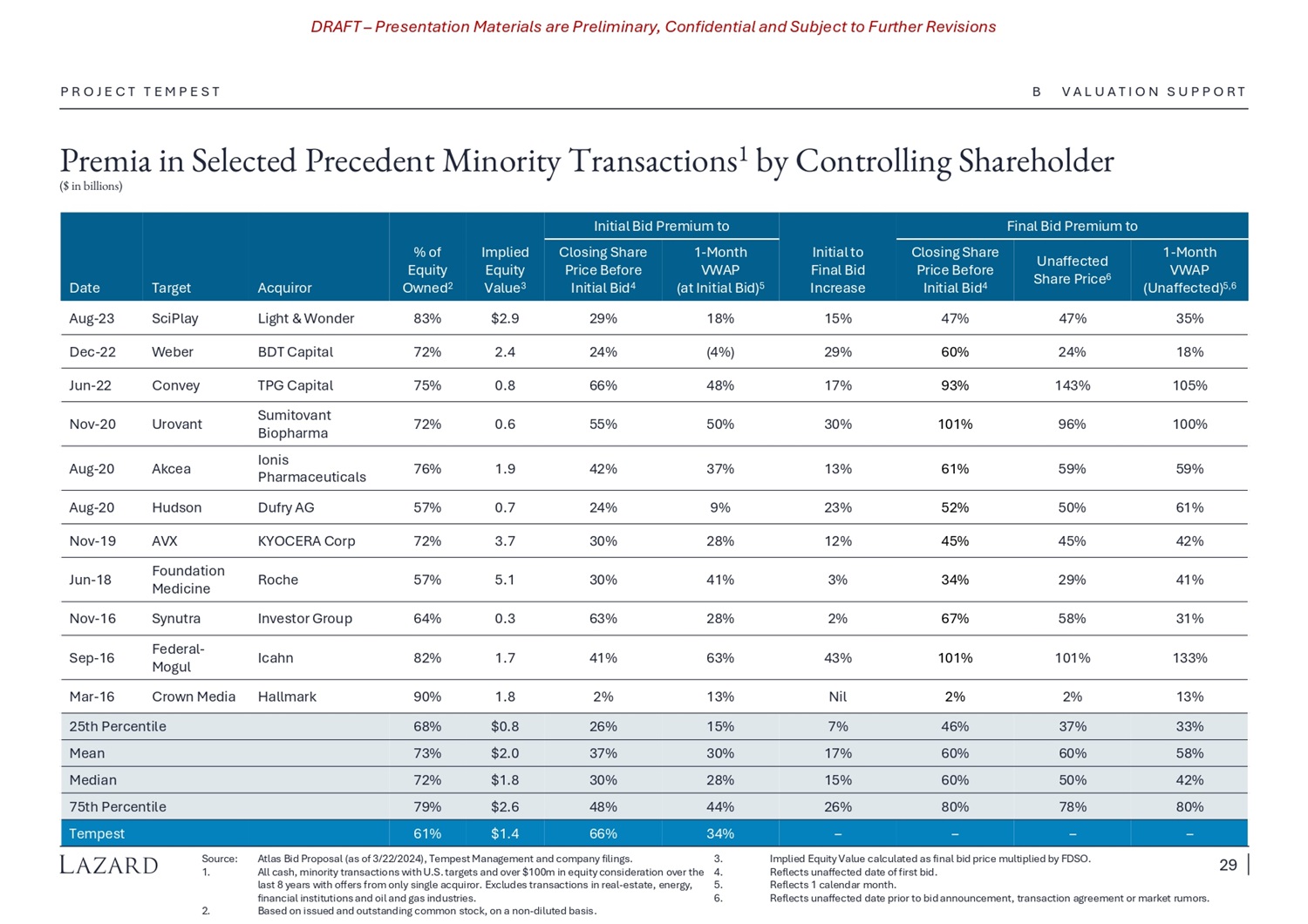 DRAFT – Presentation Materials are Preliminary, Confidential and Subject to Further Revisions Premia in Selected Precedent Minority Transactions 1 by Controlling Shareholder ($ in billions) P R O J E C T T E M P E S T Source: 1. Atlas Bid Proposal (as of 3 / 22 / 2024 ), Tempest Management and company filings . 3 . All cash, minority transactions with U . S . targets and over $ 100 m in equity consideration over the 4 . last 8 years with offers from only single acquiror . Excludes transactions in real - estate, energy, 5 . financial institutions and oil and gas industries . 6 . Based on issued and outstanding common stock, on a non - diluted basis . 2. Implied Equity Value calculated as final bid price multiplied by FDSO. Reflects unaffected date of first bid. Reflects 1 calendar month. Reflects unaffected date prior to bid announcement, transaction agreement or market rumors. Final Bid Premium to Initial Bid Premium to 1 - Month VWAP (Unaffected) 5,6 Unaffected Share Price 6 Closing Share Price Before Initial Bid 4 Initial to Final Bid Increase 1 - Month VWAP (at Initial Bid) 5 Closing Share Price Before Initial Bid 4 Implied Equity Value 3 % of Equity Owned 2 Acquiror Target Date 35% 47% 47% 15% 18% 29% $2.9 83% Light C Wonder SciPlay Aug - 23 18% 24% 60% 29% (4%) 24% 2.4 72% BDT Capital Weber Dec - 22 105% 143% 93% 17% 48% 66% 0.8 75% TPG Capital Convey Jun - 22 100% 96% 101% 30% 50% 55% 0.6 72% Sumitovant Biopharma Urovant Nov - 20 59% 59% 61% 13% 37% 42% 1.9 76% Ionis Pharmaceuticals Akcea Aug - 20 61% 50% 52% 23% 9% 24% 0.7 57% Dufry AG Hudson Aug - 20 42% 45% 45% 12% 28% 30% 3.7 72% KYOCERA Corp AVX Nov - 19 41% 29% 34% 3% 41% 30% 5.1 57% Roche Foundation Medicine Jun - 18 31% 58% 67% 2% 28% 63% 0.3 64% Investor Group Synutra Nov - 16 133% 101% 101% 43% 63% 41% 1.7 82% Icahn Federal - Mogul Sep - 16 13% 2% 2% Nil 13% 2% 1.8 90% Hallmark Crown Media Mar - 16 33% 37% 46% 7% 15% 26% $0.8 68% 25th Percentile 58% 60% 60% 17% 30% 37% $2.0 73% Mean 42% 50% 60% 15% 28% 30% $1.8 72% Median 80% 78% 80% 26% 44% 48% $2.6 79% 75th Percentile – – – – 34% 66% $1.4 61% Tempest B V A L U A T I O N S U P P O R T 29
