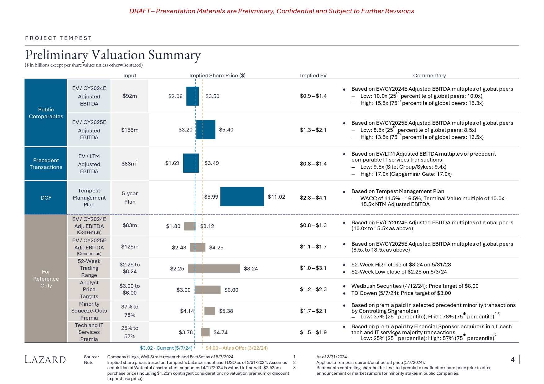 DRAFT – Presentation Materials are Preliminary, Confidential and Subject to Further Revisions P R O J E C T T E M P E S T Preliminary Valuation Summary ($ in billions except per share values unless otherwise stated) Source: Note: Company filings, Wall Street research and FactSet as of 5 / 7 / 2024 . 1 Implied share prices based on Tempest’s balance sheet and FDSO as of 3 / 31 / 2024 . Assumes 2 acquisition of Watchful assets/talent announced 4 / 17 / 2024 is valued in line with $ 2 . 525 m 3 purchase price (including $ 1 . 25 m contingent consideration ; no valuation premium or discount to purchase price) . As of 3/31/2024. Applied to Tempest current/unaffected price (5/7/2024). Represents controlling shareholder final bid premia to unaffected share price prior to offer announcement or market rumors for minority stakes in public companies. Input Implied Share Price ($) Implied EV Commentary Public Comparables EV / CY2024E Adjusted EBITDA $92m $0.9 – $1.4 Based on EV/CY2024E Adjusted EBITDA multiples of global peers Low: 10.0x (25 th percentile of global peers: 10.0x) High: 15.5x (75 th percentile of global peers: 15.3x) EV / CY2025E Adjusted EBITDA $155m $1.3 – $2.1 Based on EV/CY2025E Adjusted EBITDA multiples of global peers Low: 8.5x (25 th percentile of global peers: 8.5x) High: 13.5x (75 th percentile of global peers: 13.5x) Precedent Transactions EV / LTM Adjusted EBITDA $83m 1 $0.8 – $1.4 Based on EV/LTM Adjusted EBITDA multiples of precedent comparable IT services transactions Low: 9.5x (Sitel Group/Sykes: 9.4x) High: 17.0x (Capgemini/iGate: 17.0x) DCF Tempest Management Plan 5 - year Plan $2.3 – $4.1 Based on Tempest Management Plan WACC of 11.5% – 16.5%, Terminal Value multiple of 10.0x – 15.5x NTM Adjusted EBITDA For Reference Only EV / CY2024E Adj. EBITDA (Consensus) $83m $0.8 – $1.3 Based on EV/CY2024E Adjusted EBITDA multiples of global peers (10.0x to 15.5x as above) EV / CY2025E Adj. EBITDA (Consensus) $125m $1.1 – $1.7 Based on EV/CY2025E Adjusted EBITDA multiples of global peers (8.5x to 13.5x as above) 52 - Week Trading Range $2.25 to $8.24 $1.0 – $3.1 52 - Week High close of $8.24 on 5/31/23 52 - Week Low close of $2.25 on 5/3/24 Analyst Price Targets $3.00 to $6.00 $1.2 – $2.3 Wedbush Securities (4/12/24): Price target of $6.00 TD Cowen (5/7/24): Price target of $3.00 Minority Squeeze - Outs Premia 37% to 78% $1.7 – $2.1 Based on premia paid in selected precedent minority transactions by Controlling Sh t a h reholder Low: 37% (25 percentile); High: 78% (75 percentile) th 2,3 Tech and IT Services Premia 25% to 57% $1.5 – $1.9 Based on premia paid by Financial Sponsor acquirors in all - cash tech and IT servic th es majority transactions Low: 25% (25 percentile); High: 57% (75 percentile) th 2 $1.80 $2.48 $2.25 $3.00 $4.14 $3.12 $4.25 $8.24 $6.00 $5.38 $3.78 $4.74 $3.02 - Current (5/7/24) $4.00 – Atlas Offer (3/22/24) $2.06 $3.20 $1.69 $5.99 $3.50 $5.40 $3.49 $11.02 4