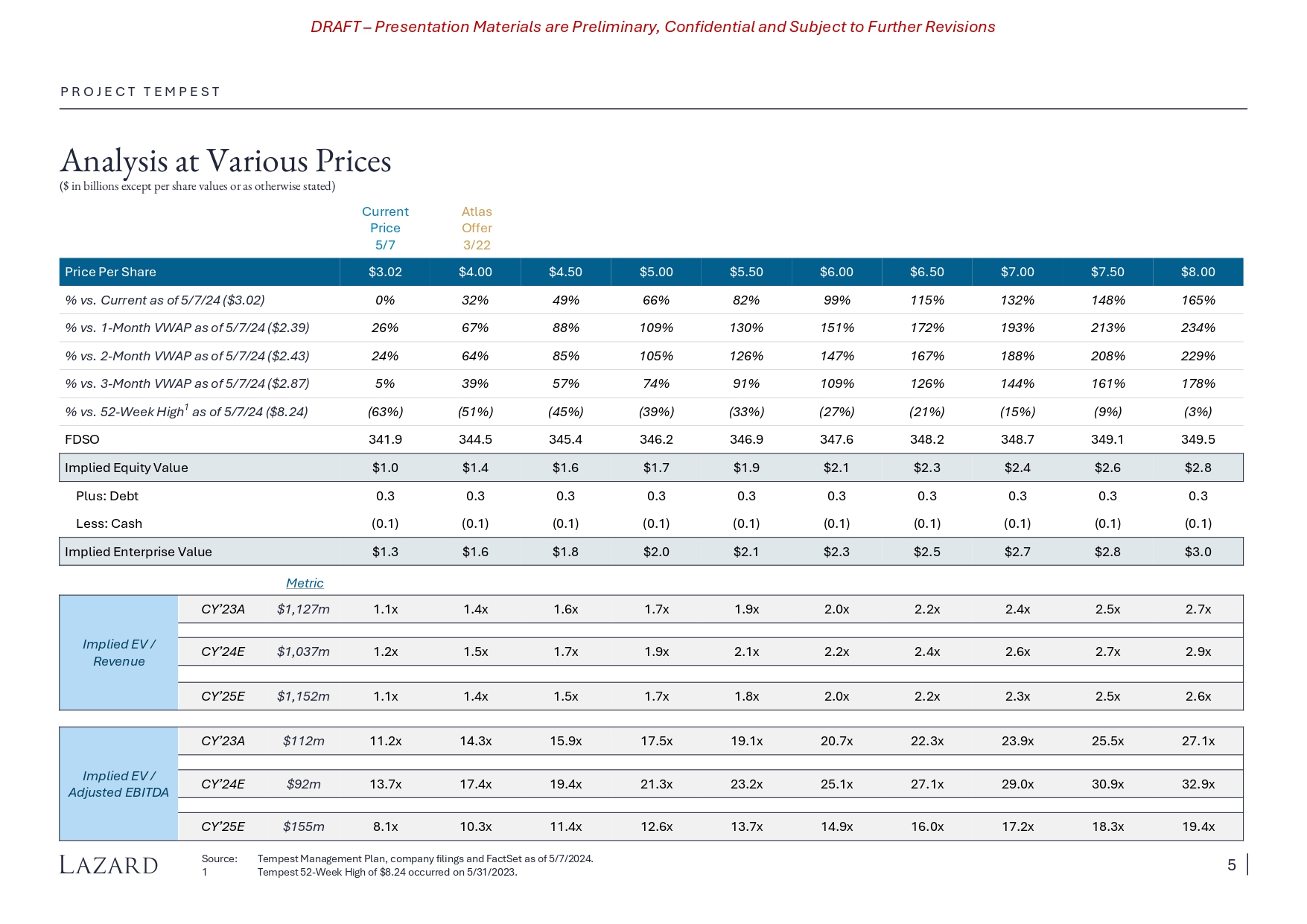 DRAFT – Presentation Materials are Preliminary, Confidential and Subject to Further Revisions P R O J E C T T E M P E S T Source: 1 Tempest Management Plan, company filings and FactSet as of 5/7/2024. Tempest 52 - Week High of $8.24 occurred on 5/31/2023. $8.00 $7.50 $7.00 $6.50 $6.00 $5.50 $5.00 $4.50 $4.00 $3.02 Price Per Share 349.5 349.1 348.7 348.2 347.6 346.9 346.2 345.4 344.5 341.9 FDSO $2.8 $2.6 $2.4 $2.3 $2.1 $1.9 $1.7 $1.6 $1.4 $1.0 Implied Equity Value $3.0 $2.8 $2.7 $2.5 $2.3 $2.1 $2.0 $1.8 $1.6 $1.3 Implied Enterprise Value 2.7x 2.5x 2.4x 2.2x 2.0x 1.9x 1.7x 1.6x 1.4x 1.1x $1,127m CY’23A Implied EV / Revenue 2.9x 2.7x 2.6x 2.4x 2.2x 2.1x 1.9x 1.7x 1.5x 1.2x $1,037m CY’24E 2.6x 2.5x 2.3x 2.2x 2.0x 1.8x 1.7x 1.5x 1.4x 1.1x $1,152m CY’25E 27.1x 25.5x 23.9x 22.3x 20.7x 19.1x 17.5x 15.9x 14.3x 11.2x $112m CY’23A Implied EV / Adjusted EBITDA 32.9x 30.9x 29.0x 27.1x 25.1x 23.2x 21.3x 19.4x 17.4x 13.7x $92m CY’24E 19.4x 18.3x 17.2x 16.0x 14.9x 13.7x 12.6x 11.4x 10.3x 8.1x $155m CY’25E 165% 148% 132% 115% 99% 82% 66% 49% 32% 0% % vs. Current as of 5/7/24 ($3.02) 234% 213% 193% 172% 151% 130% 109% 88% 67% 26% % vs. 1 - Month VWAP as of 5/7/24 ($2.39) 229% 208% 188% 167% 147% 126% 105% 85% 64% 24% % vs. 2 - Month VWAP as of 5/7/24 ($2.43) 178% 161% 144% 126% 109% 91% 74% 57% 39% 5% % vs. 3 - Month VWAP as of 5/7/24 ($2.87) (3%) (9%) (15%) (21%) (27%) (33%) (39%) (45%) (51%) (63%) % vs. 52 - Week High 1 as of 5/7/24 ($8.24) 0.3 0.3 0.3 0.3 0.3 0.3 0.3 0.3 0.3 0.3 Plus: Debt (0.1) (0.1) (0.1) (0.1) (0.1) (0.1) (0.1) (0.1) (0.1) (0.1) Less: Cash Metric Analysis at Various Prices ($ in billions except per share values or as otherwise stated) Current Price 5/7 Atlas Offer 3 / 22 5