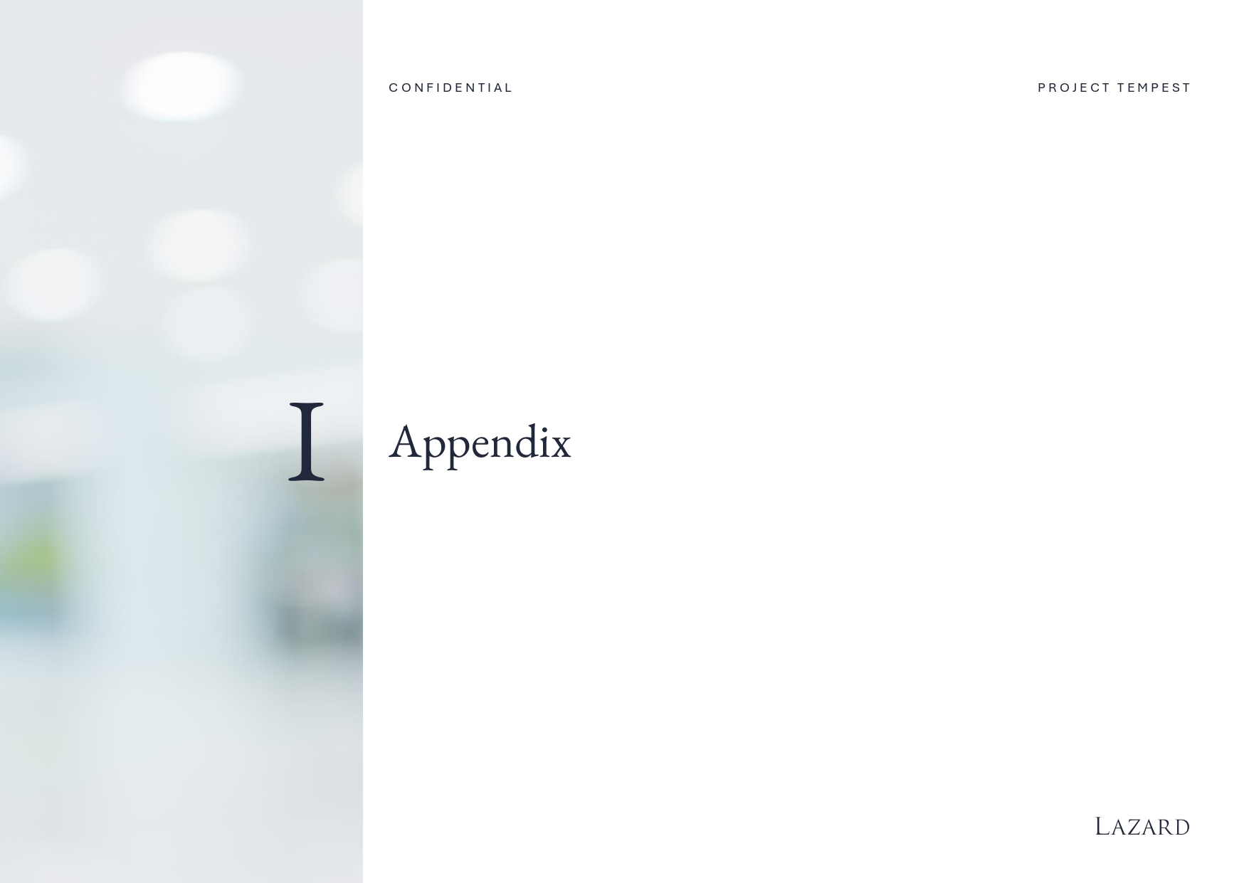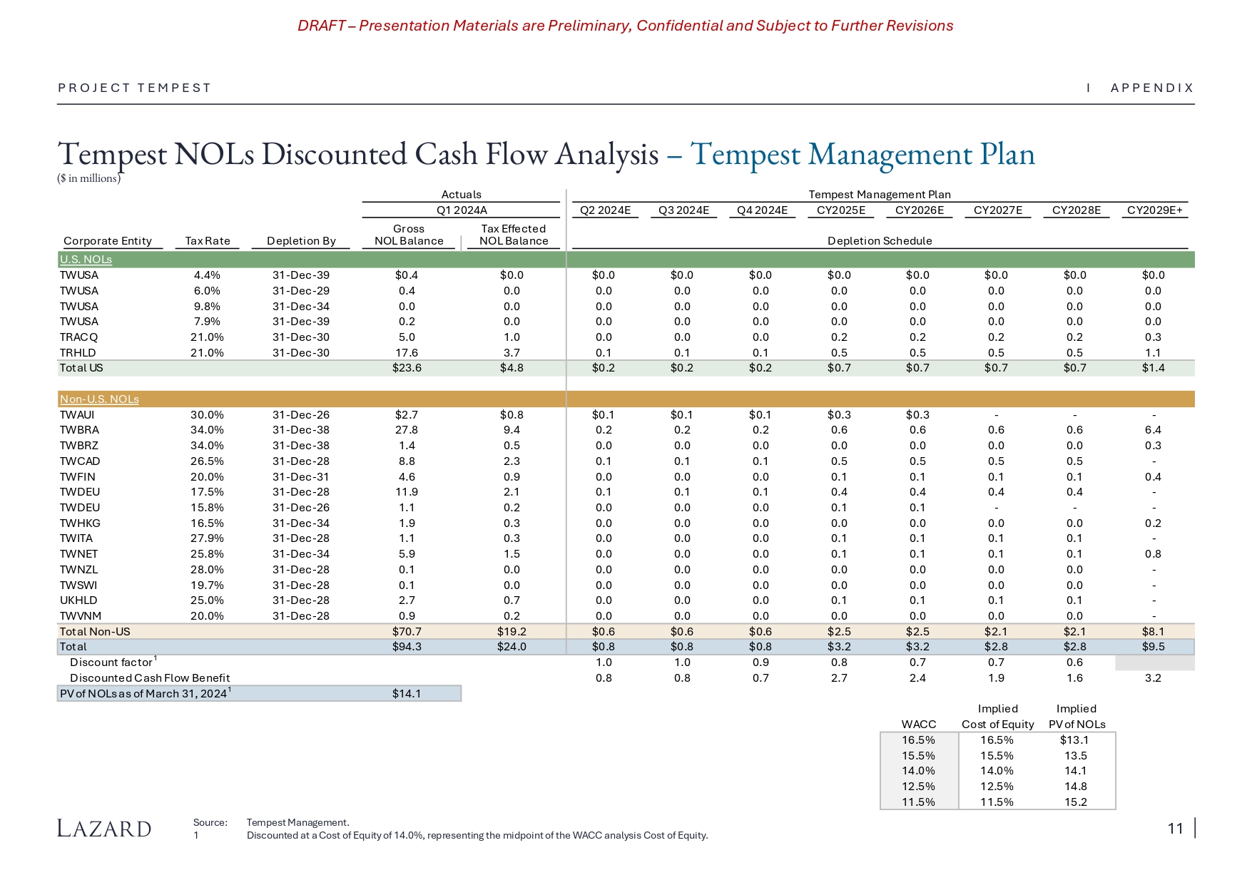 DRAFT – Presentation Materials are Preliminary, Confidential and Subject to Further Revisions Tempest NOLs Discounted Cash Flow Analysis – Tempest Management Plan ($ in millions) P R O J E C T T E M P E S T Source: 1 Tempest Management. Discounted at a Cost of Equity of 14.0%, representing the midpoint of the WACC analysis Cost of Equity. I A P P E N D I X Tempest Management Plan Q2 2024E Q3 2024E Q4 2024E CY2025E CY2026E CY2027E CY2028E CY2029E+ Depletion Schedule Actuals Q1 2024A Gross Tax Effected NOL Balance Corporate Entity Tax Rate Depletion By NOL Balance U.S. NOLs $0.0 $0.0 $0.0 $0.0 $0.0 $0.0 $0.0 $0.0 0.0 0.0 0.0 0.0 0.0 0.0 0.0 0.0 0.0 0.0 0.0 0.0 0.0 0.0 0.0 0.0 0.0 0.0 0.0 0.0 0.0 0.0 0.0 0.0 0.0 0.0 0.0 0.2 0.2 0.2 0.2 0.3 0.1 0.1 0.1 0.5 0.5 0.5 0.5 1.1 TWUSA 4.4% 31 - Dec - 39 $0.4 $0.0 TWUSA 6.0% 31 - Dec - 29 0.4 0.0 TWUSA 9.8% 31 - Dec - 34 0.0 0.0 TWUSA 7.9% 31 - Dec - 39 0.2 0.0 TRACQ 21.0% 31 - Dec - 30 5.0 1.0 TRHLD 21.0% 31 - Dec - 30 17.6 3.7 $0.2 $0.2 $0.2 $0.7 $0.7 $0.7 $0.7 $1.4 Total US $23.6 $4.8 Non - U.S. NOLs $0.1 $0.1 $0.1 $0.3 $0.3 - - - 0.2 0.2 0.2 0.6 0.6 0.6 0.6 6.4 0.0 0.0 0.0 0.0 0.0 0.0 0.0 0.3 0.1 0.1 0.1 0.5 0.5 0.5 0.5 - 0.0 0.0 0.0 0.1 0.1 0.1 0.1 0.4 0.1 0.1 0.1 0.4 0.4 0.4 0.4 - 0.0 0.0 0.0 0.1 0.1 - - - 0.0 0.0 0.0 0.0 0.0 0.0 0.0 0.2 0.0 0.0 0.0 0.1 0.1 0.1 0.1 - 0.0 0.0 0.0 0.1 0.1 0.1 0.1 0.8 0.0 0.0 0.0 0.0 0.0 0.0 0.0 - 0.0 0.0 0.0 0.0 0.0 0.0 0.0 - 0.0 0.0 0.0 0.1 0.1 0.1 0.1 - 0.0 0.0 0.0 0.0 0.0 0.0 0.0 - TWAUI 30.0% 31 - Dec - 26 $2.7 $0.8 TWBRA 34.0% 31 - Dec - 38 27.8 9.4 TWBRZ 34.0% 31 - Dec - 38 1.4 0.5 TWCAD 26.5% 31 - Dec - 28 8.8 2.3 TWFIN 20.0% 31 - Dec - 31 4.6 0.9 TWDEU 17.5% 31 - Dec - 28 11.9 2.1 TWDEU 15.8% 31 - Dec - 26 1.1 0.2 TWHKG 16.5% 31 - Dec - 34 1.9 0.3 TWITA 27.9% 31 - Dec - 28 1.1 0.3 TWNET 25.8% 31 - Dec - 34 5.9 1.5 TWNZL 28.0% 31 - Dec - 28 0.1 0.0 TWSWI 19.7% 31 - Dec - 28 0.1 0.0 UKHLD 25.0% 31 - Dec - 28 2.7 0.7 TWVNM 20.0% 31 - Dec - 28 0.9 0.2 $0.6 $0.6 $0.6 $2.5 $2.5 $2.1 $2.1 $8.1 Total Non - US $70.7 $19.2 $0.8 $0.8 $0.8 $3.2 $3.2 $2.8 $2.8 $9.5 Total $94.3 $24.0 Discount factor 1 Discounted Cash Flow Benefit 1.0 0.8 1.0 0.8 0.9 0.7 0.8 2.7 0.7 2.4 0.7 1.9 0.6 1.6 3.2 PV of NOLs as of March 31, 2024 1 $14.1 WACC Implied Cost of Equity Implied PV of NOLs $13.1 16.5% 16.5% 13.5 15.5% 15.5% 14.1 14.0% 14.0% 14.8 12.5% 12.5% 15.2 11.5% 11.5% 11
