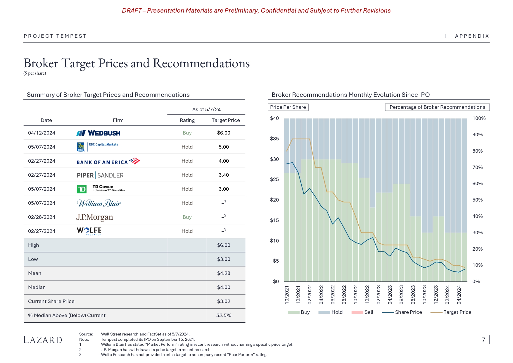 DRAFT – Presentation Materials are Preliminary, Confidential and Subject to Further Revisions P R O J E C T T E M P E S T Source: Wall Street research and FactSet as of 5/7/2024. Note: Tempest completed its IPO on September 15, 2021. 1 William Blair has stated “Market Perform” rating in recent research without naming a specific price target. 2 J.P. Morgan has withdrawn its price target in recent research. 3 Wolfe Research has not provided a price target to accompany recent “Peer Perform” rating. 0% 10% 20% 30% 40% 50% 60% 70% 80% 90% 100% $0 $5 $10 $15 $20 $25 $30 $35 $40 10/2021 12/2021 02/2022 04/2022 06/2022 08/2022 10/2022 12/2022 02/2023 04/2023 06/2023 08/2023 10/2023 12/2023 02/2024 04/2024 Buy Hold Sell Share Price Target Price Price Per Share Percentage of Broker Recommendations Target Price Rating Firm Date $6.00 Buy 04/12/2024 5.00 Hold 05/07/2024 4.00 Hold 02/27/2024 3.40 Hold 02/27/2024 3.00 Hold 05/07/2024 – 1 Hold 05/07/2024 – 2 Buy 02/28/2024 – 3 Hold 02/27/2024 $6.00 High $3.00 Low $4.28 Mean $4.00 Median $3.02 Current Share Price 32.5% % Median Above (Below) Current As of 5/7/24 Broker Target Prices and Recommendations ($ per share) Summary of Broker Target Prices and Recommendations Broker Recommendations Monthly Evolution Since IPO I A P P E N D I X 7