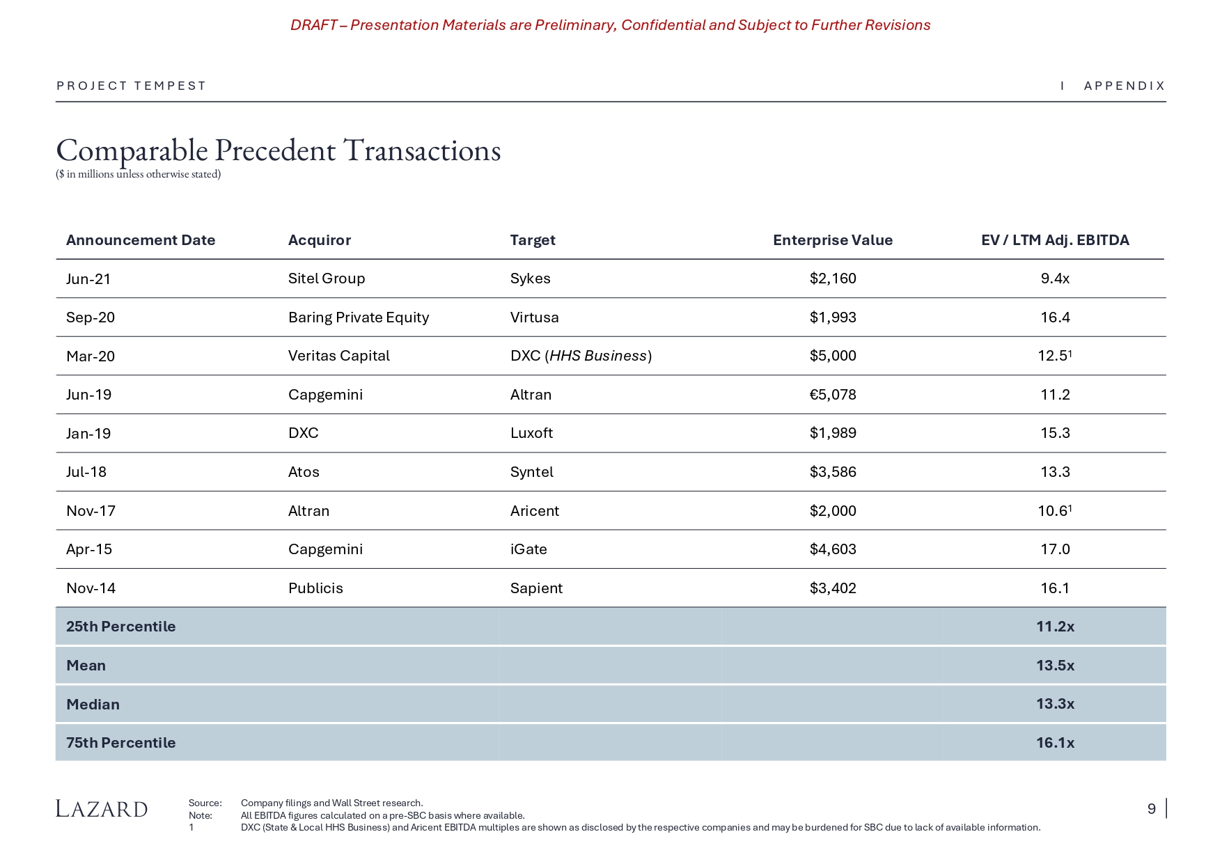DRAFT – Presentation Materials are Preliminary, Confidential and Subject to Further Revisions Comparable Companies Analysis ($ in billions) Enterprise Value / P R O J E C T T E M P E S T Source: Company filings, Wall Street research and FactSet as of 5/7/2024. Note: Years refer to calendar years. 1 All EBITDA figures shown are Adjusted EBITDA presented on a like - for - like basis excluding stock - based compensation. 2 Organic revenue growth figures are shown where available. '24 – '25 '23 – '24 '22 – '23 25E 24E 23A/E 25E 24E 23A/E 25E 24E 23A/E 25E 24E 23A/E Value Value High Low Company Digital IT Services 10% 3% (3%) 18% 17% 18% 32% 31% 31% 13.8x 15.9x 15.4x 2.44x 2.67x 2.74x $12.9 $14.9 (21%) 23% EPAM Systems 19% 16% 11% 21% 20% 21% 38% 38% 38% 14.2 17.4 20.1 2.98 3.56 4.14 8.7 8.7 (22%) 41% Globant 17% (1%) 5% 22% 19% 19% 36% 32% 33% 7.0 9.8 9.3 1.55 1.86 1.79 1.7 2.0 (58%) 15% Endava 14% 1% 1% 19% 18% 19% 34% 31% 32% 10.4x 12.9x 12.3x 1.99x 2.27x 2.27x 25th Percentile 16% 6% 4% 20% 19% 19% 36% 34% 34% 11.7 14.4 14.9 2.32 2.70 2.89 Mean 17% 3% 5% 21% 19% 19% 36% 32% 33% 13.8 15.9 15.4 2.44 2.67 2.74 Median 18% 9% 8% 22% 20% 20% 37% 35% 36% 14.0 16.7 17.8 2.71 3.12 3.44 75th Percentile Diversified IT Services 7% 3% 3% 22% 22% 22% 33% 33% 33% 12.5x 13.4x 14.0x 2.79x 2.98x 3.07x $198.3 $200.3 (20%) 18% Accenture 7% 1% 4% 16% 16% 16% 27% 27% 27% 9.6 10.5 10.8 1.58 1.69 1.71 41.5 39.3 (10%) 35% Capgemini 3% (1%) (1%) 20% 19% 19% 35% 34% 35% 8.1 8.7 8.9 1.61 1.67 1.67 32.3 34.0 (15%) 10% Cognizant Tech 5% 0% 1% 18% 18% 17% 30% 30% 30% 8.9x 9.6x 9.9x 1.60x 1.68x 1.69x 25th Percentile 6% 1% 2% 20% 19% 19% 31% 31% 31% 10.1 10.9 11.2 1.99 2.11 2.15 Mean 7% 1% 3% 20% 19% 19% 33% 33% 33% 9.6 10.5 10.8 1.61 1.69 1.71 Median 7% 2% 4% 21% 21% 20% 34% 34% 34% 11.1 11.9 12.4 2.20 2.33 2.39 75th Percentile 7% (0%) (0%) 18% 17% 18% 32% 31% 31% 8.5x 10.0x 9.6x 1.59x 1.73x 1.73x Global 25th Perc. 11% 4% 3% 20% 19% 19% 34% 32% 33% 10.9 12.6 13.1 2.16 2.40 2.52 Global Mean 8% 2% 4% 21% 19% 19% 34% 32% 33% 11.1 11.9 12.4 2.02 2.27 2.27 Global Median 16% 3% 5% 22% 20% 20% 36% 34% 34% 13.5 15.3 15.1 2.70 2.90 2.99 Global 75th Perc. % Ch. 52 Wk. Equity Enterprise Revenue Adj. EBITDA 1 Gross Margin Adj. EBITDA Margin 1 Revenue Growth 2 I A P P E N D I X 8
