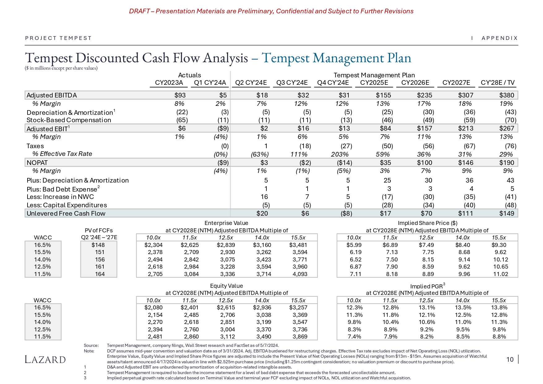 DRAFT – Presentation Materials are Preliminary, Confidential and Subject to Further Revisions Tempest Discounted Cash Flow Analysis – Tempest Management Plan ($ in millions except per share values) P R O J E C T T E M P E S T Source: Note: Tempest Management, company filings, Wall Street research and FactSet as of 5/7/2024. DCF assumes mid - year convention and valuation date as of 3/31/2024. Adj. EBITDA burdened for restructuring charges. Effective Tax rate excludes impact of Net Operating Loss (NOL) utilization. Enterprise Value, Equity Value and Implied Share Price figures are adjusted to include the Present Value of Net Operating Losses (NOLs) ranging from $13m - $15m. Assumes acquisition of Watchful assets/talent announced 4/17/2024 is valued in line with $2.525m purchase price (including $1.25m contingent consideration; no valuation premium or discount to purchase price). D&A and Adjusted EBIT are unburdened by amortization of acquisition - related intangible assets. Tempest Management is required to burden the income statement for a level of bad debt expense that exceeds the forecasted uncollectable amount. Implied perpetual growth rate calculated based on Terminal Value and terminal year FCF excluding impact of NOLs, NOL utilization and Watchful acquisition. 1 2 3 Actuals Tempest Management Plan CY2023A Q1 CY'24A Q2 CY'24E Q3 CY'24E Q4 CY'24E CY2025E CY2026E CY2027E CY'28E / TV $380 $307 $235 $155 $31 $32 $18 $5 $93 Adjusted EBITDA 19% (43) (70) 18% (36) (59) 17% (30) (49) 13% (25) (46) 12% (5) (13) 12% (5) (11) 7% (5) (11) 2% (3) (11) 8% (22) (65) % Margin Depreciation & Amortization 1 Stock - Based Compensation $267 $213 $157 $84 $13 $16 $2 ($9) $6 Adjusted EBIT 1 13% 13% 11% 7% 5% 6% 1% (4%) 1% % Margin (76) (67) (56) (50) (27) (18) 1 (0) Taxes 29% 31% 36% 59% 203% 111% (63%) (0%) % Effective Tax Rate $190 $146 $100 $35 ($14) ($2) $3 ($9) NOPAT 9% 9% 7% 3% (5%) (1%) 1% (4%) % Margin 43 36 30 25 5 5 5 Plus: Depreciation & Amortization 5 4 3 3 1 1 1 Plus: Bad Debt Expense 2 (41) (35) (30) (17) 5 7 16 Less: Increase in NWC (48) (40) (34) (28) (5) (5) (5) Less: Capital Expenditures $149 $111 $70 $17 ($8) $6 $20 Unlevered Free Cash Flow Enterprise Value at CY2028E (NTM) Adjusted EBITDA Multiple of Implied Share Price ($) at CY2028E (NTM) Adjusted EBITDA Multiple of PV of FCFs Q2 '24E – '27E WACC 15.5x 14.0x 12.5x 11.5x 10.0x $3,481 $3,160 $2,839 $2,625 $2,304 3,594 3,262 2,930 2,709 2,378 3,771 3,423 3,075 2,842 2,494 3,960 3,594 3,228 2,984 2,618 4,093 3,714 3,336 3,084 2,705 15.5x 14.0x 12.5x 11.5x 10.0x $9.30 $8.40 $7.49 $6.89 $5.99 9.62 8.68 7.75 7.13 6.19 10.12 9.14 8.15 7.50 6.52 10.65 9.62 8.59 7.90 6.87 11.02 9.96 8.89 8.18 7.11 16.5% 15.5% 14.0% 12.5% 11.5% $148 151 156 161 164 Equity Value at CY2028E (NTM) Adjusted EBITDA Multiple of Implied PGR 3 at CY2028E (NTM) Adjusted EBITDA Multiple of WACC 15.5x 14.0x 12.5x 11.5x 10.0x $3,257 $2,936 $2,615 $2,401 $2,080 3,369 3,038 2,706 2,485 2,154 3,547 3,199 2,851 2,618 2,270 3,736 3,370 3,004 2,760 2,394 3,869 3,490 3,112 2,860 2,481 15.5x 14.0x 12.5x 11.5x 10.0x 13.8% 13.5% 13.1% 12.8% 12.3% 12.8% 12.5% 12.1% 11.8% 11.3% 11.3% 11.0% 10.6% 10.4% 9.8% 9.8% 9.5% 9.2% 8.9% 8.3% 8.8% 8.5% 8.2% 7.9% 7.4% 16.5% 15.5% 14.0% 12.5% 11.5% I A P P E N D I X 10