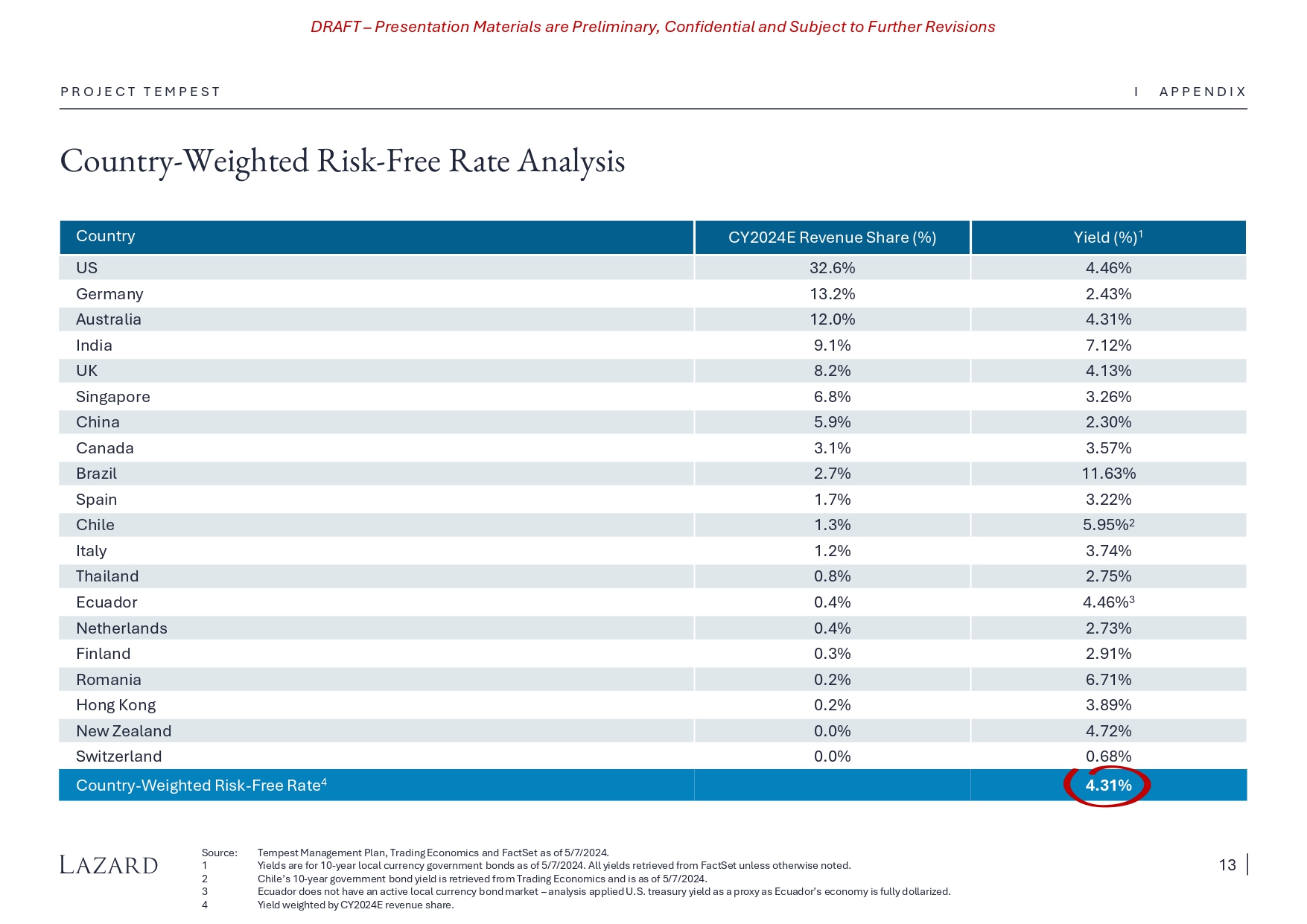 DRAFT – Presentation Materials are Preliminary, Confidential and Subject to Further Revisions Country - Weighted Risk - Free Rate Analysis P R O J E C T T E M P E S T Source: Tempest Management Plan, Trading Economics and FactSet as of 5/7/2024. 1 Yields are for 10 - year local currency government bonds as of 5/7/2024. All yields retrieved from FactSet unless otherwise noted. 2 Chile’s 10 - year government bond yield is retrieved from Trading Economics and is as of 5/7/2024. 3 Ecuador does not have an active local currency bond market – analysis applied U.S. treasury yield as a proxy as Ecuador’s economy is fully dollarized. 4 Yield weighted by CY2024E revenue share. Yield (%) 1 CY2024E Revenue Share (%) Country 4.46% 32.6% US 2.43% 13.2% Germany 4.31% 12.0% Australia 7.12% 9.1% India 4.13% 8.2% UK 3.26% 6.8% Singapore 2.30% 5.9% China 3.57% 3.1% Canada 11.63% 2.7% Brazil 3.22% 1.7% Spain 5.95% 2 1.3% Chile 3.74% 1.2% Italy 2.75% 0.8% Thailand 4.46% 3 0.4% Ecuador 2.73% 0.4% Netherlands 2.91% 0.3% Finland 6.71% 0.2% Romania 3.89% 0.2% Hong Kong 4.72% 0.0% New Zealand 0.68% 0.0% Switzerland 4.31% Country - Weighted Risk - Free Rate 4 I A P P E N D I X 13