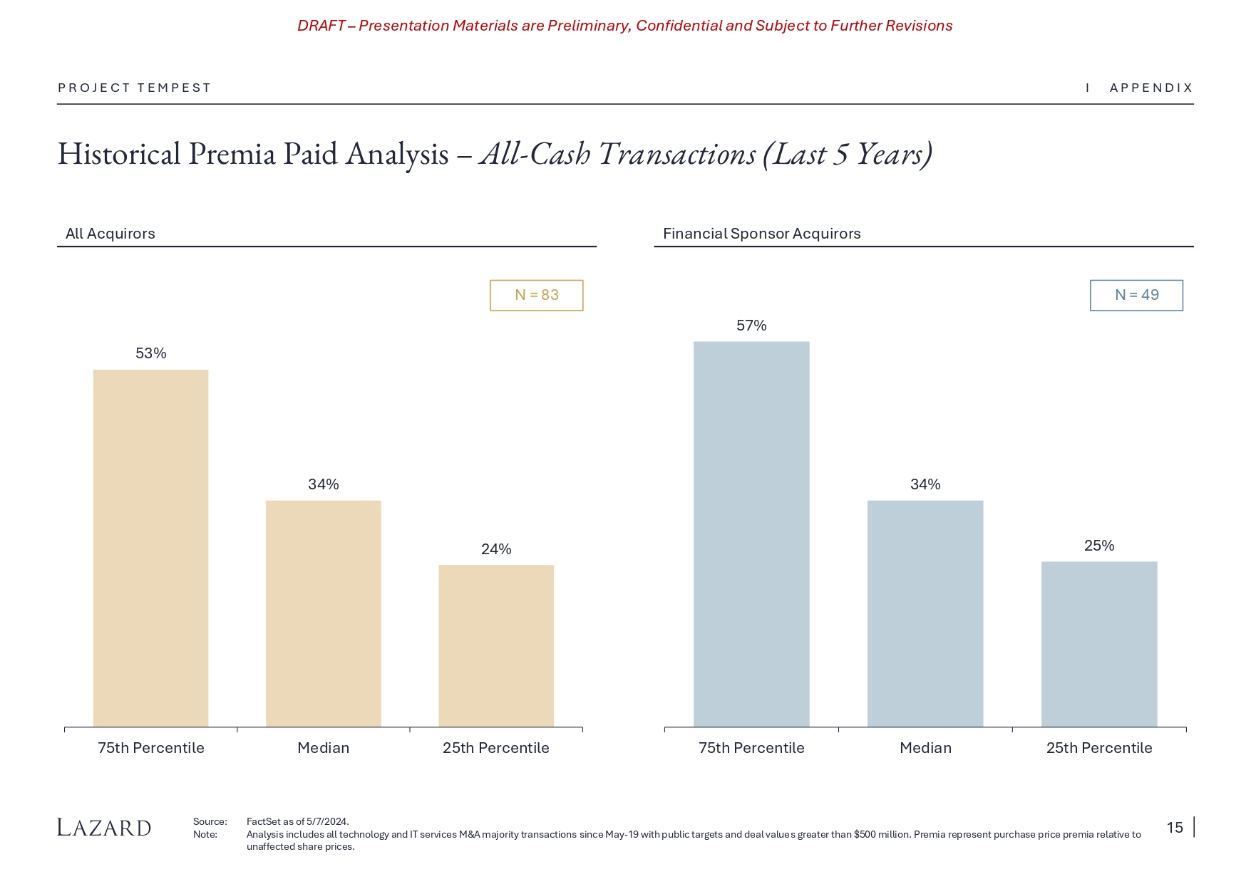 DRAFT – Presentation Materials are Preliminary, Confidential and Subject to Further Revisions Premia in Selected Precedent Minority Transactions 1 by Controlling Shareholder ($ in billions) P R O J E C T T E M P E S T Source: 1. Atlas Bid Proposal (as of 3 / 22 / 2024 ), Tempest Management and company filings . 3 . All cash, minority transactions with U . S . targets and over $ 100 m in equity consideration over the 4 . last 8 years with offers from only single acquiror . Excludes transactions in real - estate, energy, 5 . financial institutions and oil and gas industries . 6 . Based on issued and outstanding common stock, on a non - diluted basis . 2. Implied Equity Value calculated as final bid price multiplied by FDSO. Reflects unaffected date of first bid. Reflects 1 calendar month. Reflects unaffected date prior to bid announcement, transaction agreement or market rumors. Final Bid Premium to Initial Bid Premium to 1 - Month VWAP (Unaffected) 5,6 Unaffected Share Price 6 Closing Share Price Before Initial Bid 4 Initial to Final Bid Increase 1 - Month VWAP (at Initial Bid) 5 Closing Share Price Before Initial Bid 4 Implied Equity Value 3 % of Equity Owned 2 Acquiror Target Date 35% 47% 47% 15% 18% 29% $2.9 83% Light & Wonder SciPlay Aug - 23 18% 24% 60% 29% (4%) 24% 2.4 72% BDT Capital Weber Dec - 22 105% 143% 93% 17% 48% 66% 0.8 75% TPG Capital Convey Jun - 22 100% 96% 101% 30% 50% 55% 0.6 72% Sumitovant Biopharma Urovant Nov - 20 59% 59% 61% 13% 37% 42% 1.9 76% Ionis Pharmaceuticals Akcea Aug - 20 61% 50% 52% 23% 9% 24% 0.7 57% Dufry AG Hudson Aug - 20 42% 45% 45% 12% 28% 30% 3.7 72% KYOCERA Corp AVX Nov - 19 41% 29% 34% 3% 41% 30% 5.1 57% Roche Foundation Medicine Jun - 18 31% 58% 67% 2% 28% 63% 0.3 64% Investor Group Synutra Nov - 16 133% 101% 101% 43% 63% 41% 1.7 82% Icahn Federal - Mogul Sep - 16 13% 2% 2% Nil 13% 2% 1.8 90% Hallmark Crown Media Mar - 16 33% 37% 46% 7% 15% 26% $0.8 68% 25th Percentile 58% 60% 60% 17% 30% 37% $2.0 73% Mean 42% 50% 60% 15% 28% 30% $1.8 72% Median 80% 78% 80% 26% 44% 48% $2.6 79% 75th Percentile – – – – 34% 66% $1.4 61% Tempest I A P P E N D I X 14
