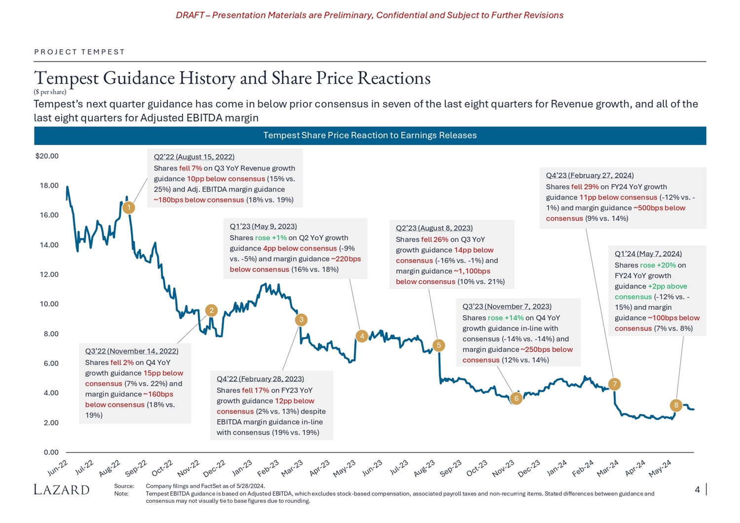 DRAFT – Presentation Materials are Preliminary, Confidential and Subject to Further Revisions Tempest Guidance History and Share Price Reactions ($ p er s h a r e) Tempest’s next quarter guidance has come in below prior consensus in seven of the last eight quarters for Revenue growth, and all of the l a s t eigh t q u a r t e r s f o r A d ju s t ed EBI T D A m a r gin P R O J E C T T E M P E S T So u r c e : Note: Co m pa n y f ili ng s a n d F a c t S e t a s of 5 / 28 / 2024. Tempest EBITDA guidance is based on Adjusted EBITDA, which excludes stock - based compensation, associated payroll taxes and non - recurring items. Stated differences between guidance and consensus may not visually tie to base figures due to rounding. Tempest Share Price Reaction to Earnings Releases 0 . 00 2 . 00 4 . 00 6 . 00 8 . 00 10.00 12.00 14.00 16.00 18.00 $20.00 Ǫ2’2 2 (Au g u s t 15, 2 022) S har e s f e l l 7 % o n Ǫ 3 Y o Y R e v e n ue g r o w t h guidance 10 pp below consensus ( 15 % vs . 25 % ) and Adj . EBITDA margin guidance ~ 180 b ps be l o w c o n s e n s us ( 18 % vs . 19 % ) 1 Ǫ3’2 2 (N o v e mbe r 14, 2022) S har e s f e l l 2 % o n Ǫ 4 Y o Y g r o w t h g uida n c e 15p p be l o w c o n s e n s us (7% vs . 22% ) and margin g uida n c e ~160b ps be l o w c o n s e n s us (18% vs . 19%) Ǫ4’2 2 ( F e bruar y 28, 2023) S har e s f e l l 17 % o n F Y 2 3 Y o Y g r o w t h g uida n c e 12p p be l o w c o n s e n s us (2% vs . 13% ) de s pi t e EBITDA margin guidance in - line wi t h c o n s e n s us (19% vs . 19%) Ǫ1 ’ 2 3 ( M a y 9, 2023 ) S har e s r o s e +1 % o n Ǫ 2 Y o Y g r o w t h g uida n c e 4p p be l o w c o n s e n s us ( - 9% vs. - 5%) and margin guidance ~220bps be l o w c o n s e n s us (16% vs . 18%) Ǫ2’2 3 (Au g u s t 8, 2023) S har e s f e l l 26 % o n Ǫ 3 Y o Y g r owt h g uida n c e 14 pp be l o w c o n s e n s us ( - 16 % vs . - 1% ) an d margin g uida n c e ~1 , 100b ps be l o w c o n s e n s us (10% vs . 21%) Ǫ1’2 4 ( M a y 7, 2024) S har e s r o s e +20 % on F Y 2 4 Y o Y g r o w t h g uida n c e +2p p abo ve c o n s e n s us ( - 12 % vs . - 15% ) an d margin g uida n c e ~100b ps be l o w c o n s e n s us (7% vs . 8%) Ǫ4’2 3 ( F e bruar y 27, 2024) S har e s f e l l 29 % o n F Y 2 4 Y o Y g r o w t h guidance 11pp below consensus ( - 12% vs. - 1%) and margin guidance ~500bps below c o n s e n s us (9% vs . 14%) Ǫ3’2 3 (N o v e mbe r 7, 2023) S har e s r o s e +14 % o n Ǫ 4 Y o Y g r o w t h g uida n c e i n - l i n e wi t h c o n s e n s us ( - 14 % vs . - 14% ) and margin g uida n c e ~250b ps be l o w c o n s e n s us (12% vs . 14%) 2 3 4 5 6 7 8 4