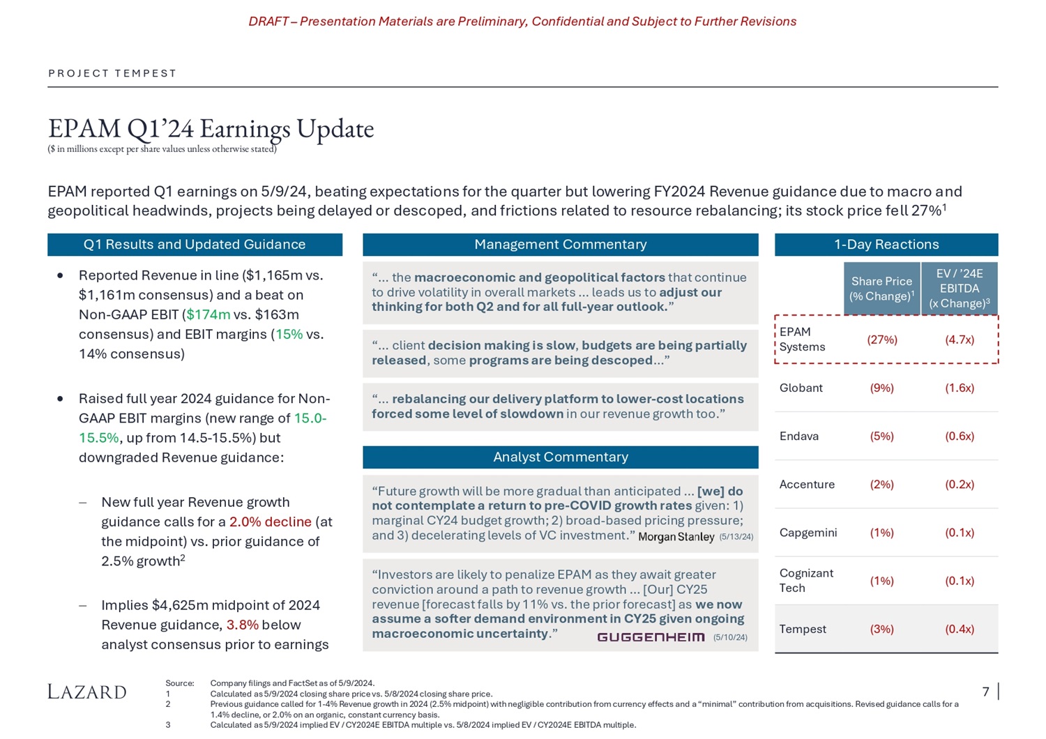 DRAFT – Presentation Materials are Preliminary, Confidential and Subject to Further Revisions P R O J E C T T E M P E S T EPAM Q1’24 Earnin gs Update ($ in millions except per share values unless otherwise stated) EPAM reported Ǫ1 earnings on 5/9/24, beating expectations for the quarter but lowering FY2024 Revenue guidance due to macro and geopolitical headwinds, projects being delayed or descoped, and frictions related to resource rebalancing; its stock price fell 27% 1 3 So u r c e : Co m pa n y f ili ng s a n d F a c t S e t a s of 5 / 9 /2024. 1 Calculated as 5/9/2024 closing share price vs. 5/8/2024 closing share price. 2 Previous guidance called for 1 - 4% Revenue growth in 2024 (2.5% midpoint) with negligible contribution from currency effects and a “minimal” contribution from acquisitions. Revised guidance calls for a 1.4% decline, or 2.0% on an organic, constant currency basis. Calculated as 5/9/2024 implied EV / CY2024E EBITDA multiple vs. 5/8/2024 implied EV / CY2024E EBITDA multiple. Ǫ 1 Re s ul t s a n d Up d a t ed Guida n c e R epo rte d R e v enue in lin e ( $1 , 165 m v s . $1 , 161 m c onse ns us ) an d a be a t on N o n - G AA P E B I T ( $174m v s . $ 163 m c onse ns us ) an d E B I T m a r g ins ( 15 % v s . 14 % c onse ns us ) R ais e d full y ear 202 4 g uid a n c e f o r No n - G AA P EBIT m a r g ins ( new r an g e of 15 . 0 - 15 . 5 % , up f r om 14 . 5 - 15 . 5 % ) but d o wng r ade d R e v enue g uidan c e: N ew ful l y ear R e v enue g r o w t h g uidan c e c all s f or a 2 . 0 % de c lin e ( a t t h e m idpoi n t) v s . p r ior g uidan c e of 2 . 5 % g r o w t h 2 Im plie s $4 , 625 m m idpoi n t of 202 4 R e v enue g uidan c e , 3 . 8 % bel o w ana l y s t c onse ns us p r ior t o ear n in g s M a n a g ement C omm ent a r y “… the macroeconomic and geopolitical factors that continue to drive volatility in overall markets … leads us to adjust our think i n g fo r b o th Ǫ 2 and fo r all f u ll - y ea r o ut l o o k. ” “… client decision making is slow , budgets are being partially released , some programs are being descoped …” “… rebalancing our delivery platform to lower - cost locations forced some level of slowdown in our revenue growth too.” Anal y s t C o mm entar y 1 - Da y Re a c t io n s Sh ar e Pri c e ( % C h ang e) 1 (27%) EPAM Systems (9%) Globant (5%) Endava (2%) Accenture (1%) Capgemini (1%) C ogniz a nt Tech (3%) Tempest “Future growth will be more gradual than anticipated … [we] do not contemplate a return to pre - COVID growth rates given: 1) marginal CY24 budget growth; 2) broad - based pricing pressure; a n d 3 ) d e c e le rat in g le v e l s of V C in v e s t m e n t . ” (5/ 13 / 24) “Investors are likely to penalize EPAM as they await greater conviction around a path to revenue growth … [Our] CY25 revenue [forecast falls by 11% vs. the prior forecast] as we now assume a softer demand environment in CY25 given ongoing ma c roe c on o m i c u n c er t a i nt y .” (5/ 10 / 24) 7
