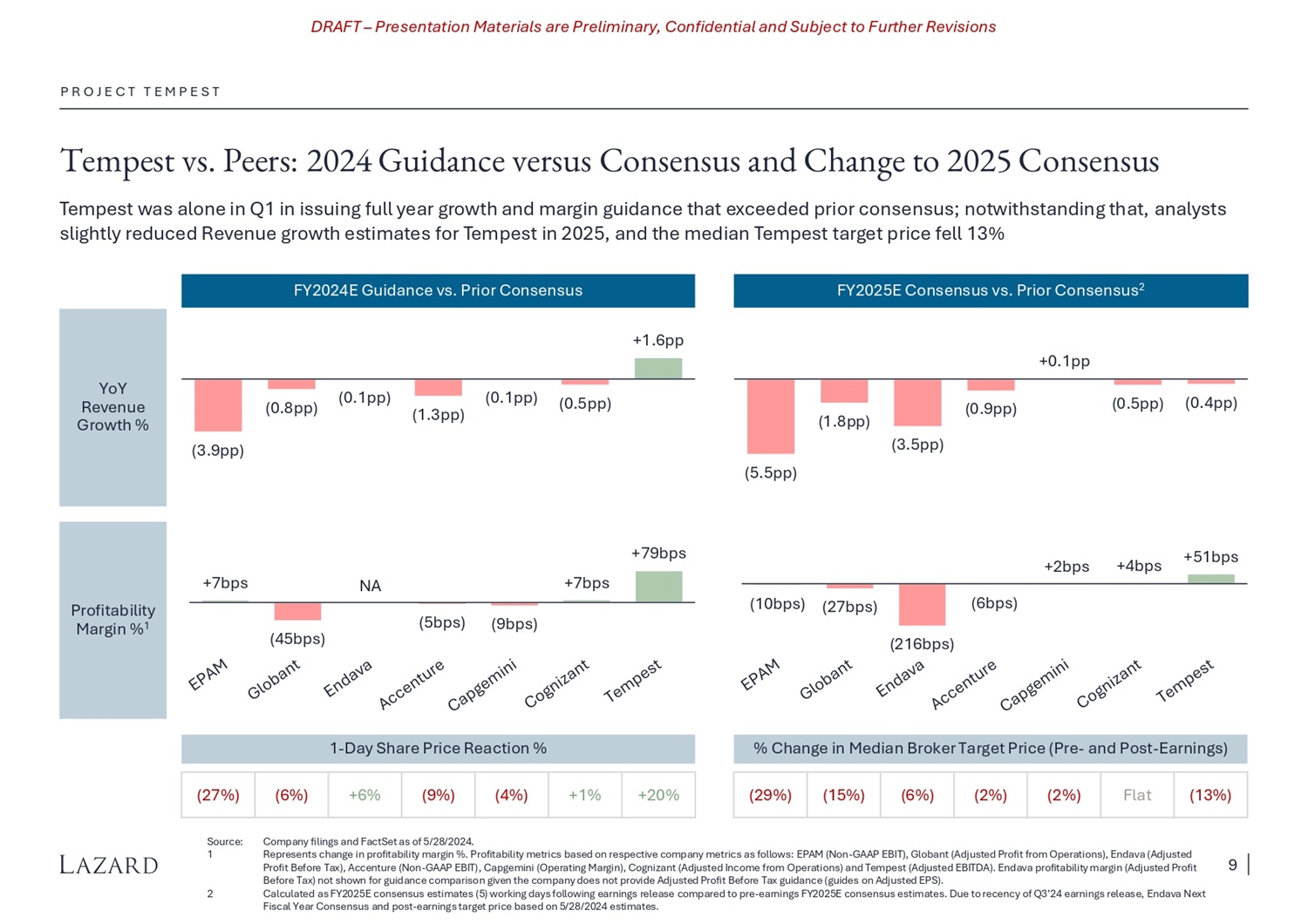 DRAFT – Presentation Materials are Preliminary, Confidential and Subject to Further Revisions Temp e st vs. Pee rs: Q1 2024 Earnin gs Perf ormance Tempest’s peers reported a weak macro environment and were not confident in the timing of a recovery, generally issuing tepid full year growth and margin guidance P R O J E C T T E M P E S T So u r c e : Note: Co m pa n y f ili ng s a n d F a c t S e t a s of 5 / 28 / 2024. Margin defined as follows: EPAM (Non - GAAP EBIT), Globant (Adjusted Profit from Operations), Endava (Adjusted Profit Before Tax), Accenture (Non - GAAP EBIT), Capgemini (Operating Margin), Cognizant (Adjusted Income from Operations) and Tempest (Adjusted EBITDA). Most recent quarter is 3/31/2024 in all cases but for Accenture which is the fiscal quarter ended 2/29/2024. Represents YoY revenue growth, shown organic and on a constant currency basis where available. Represents 1 - day share price reaction (post - earnings share price compared to pre - earnings share price). Represents post - earnings median broker target price (five working days after earnings) vs. pre - earnings median broker target price. Endava post - earnings median broker target price as of 5/28/2024. Endava provided full - year constant currency growth at its Ǫ3'FY24 earnings, but not organic growth excluding the contribution of GalaxE. 1 2 3 4 M a r k et Re a ct ion F ull Y ear Guidan c e M os t Re c ent F is c a l Ǫ TR Sel e c t Man a g ement C o mm entary %∆ in T g t . Pr ic e 3 1 - Day Pr i c e % 2 Margin Re v enu e Growth 1 Margin Re v enu e Growth 1 “And the feedback that we're getting is that certain clients, al t hough th e y a p p e a r to h a v e b u dg e t a re sort of s low to begi n to a c ti v a t e t h e b u dge t ” (29%) (27%) 15.0 – 15.5% (Adj. E BIT) (2%) 15% (Adj. E BIT) (5%) EPAM (May - 24) “…where most IT services firms are struggling to deliver d e c e n t growth , w e e x p e c t t o achi e ve m i d - te e n t o p li ne g r o w th for 2024” (15%) (6%) 14.5 – 15.5% (Adj. E BIT) 15 – 16% 15% (Adj. E BIT) 21% Globant (May - 24) “… pipeline conversion issue … it is the velocity at which it proceeds through to sign an initiated work continues to be the issue” (6%) +6% n.a. (Adj. P BT) n.m. 4 9% (Adj. P BT) (12%) Endava (May - 24) “And that's tied to the uncertain macro that's putting peo ple c o n s t ra i n e d ” (2%) (9%) 15.5% (Adj. E BIT) 1 – 3% 14% (Adj. E BIT) 0% Accenture (Mar - 24) “… I don’t expect an awful lot of discretionary spend . So m a y be a li tt l e bit b u t not a f u l l re c o v e r y ” (2%) (4%) 13.3 – 13.6% ( O pe r ating Ma rgin) 0 – 3% n.a. (4%) Capgemini (Apr - 24) “… the higher cost of capital is almost forcing enterprises to s low do w n the i m port a nt w ork” Flat +1% 15.3 – 15.5% (Adj. E BIT) (3) – 1% 15% (Adj. E BIT) (2%) Cognizant (May - 24) (13%) +20% 8.0 – 10.0% (Adj. E BITD A) (12) – (10%) 3% (Adj. E BITD A) (19%) Tempest (May - 24) 8