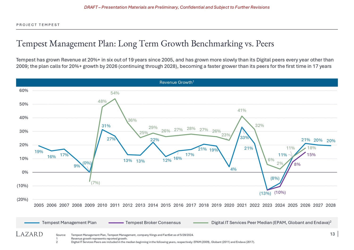 DRAFT – Presentation Materials are Preliminary, Confidential and Subject to Further Revisions P R O J E C T T E M P E S T Tempest Management Plan: 2024 Forecast ($ i n mi ll i o n s ) Tempest’s plan contemplates delivering higher growth and margins in 2H’24; consensus predicts a 4% YoY Revenue decline in 2H’24 vs. a 1% decline per the plan, but roughly supports the implied margin expansion T empe s t Man a g ement Plan C Y 2 024 E B en c h m ar ki ng $249 $259 $268 $261 $1,03 7 $7 $20 $34 $31 $92 Ǫ 1 2 0 2 4 A Ǫ 2 2 0 2 4 E Ǫ 3 2 0 2 4 E Ǫ 4 2 0 2 4 E C Y 2 0 2 4E Re v e n u e A d jus t e d E BITD A (19%) 3% (10%) 8% (4%) 13% +3% 12% (8%) 9% Adj. Y/Y E BI TDA Growth Margin Globant EPAM En d a v a Ac c e n ture Cognizant Capgemini T e m p e s t M anagem e n t P l an T e m p e s t Co ns e n s us 5% 1 0 % 1 5 % 2 0 % 2 5 % ( 1 5 % ) ( 1 0 % ) ( 5 % ) 0 % 5 % 1 0 % 1 5 % 2 0 % CY2024E EB I TD A M argin C Y2 0 24 E R e v e nu e Gr ow t h 1 (10%) (5%) Digit a l I T Se r v i c e s P e e r s 5 % 1 0 % 1 5 % 2 0 % Di v e r s ifi e d I T Se r v i c e s P e e r s So u r c e : Note: 1 T em p e s t M a n a g e me n t P la n a n d F a c t S e t a s of 5 / 28 / 2024. All EBITDA figures shown are Adjusted EBITDA presented on a like - for - like basis excluding stock - based compensation. Organic revenue growth figures are shown where available. H 1 A d j. EB I TD A : $27 m H 2 A d j. EB I TD A : $65 m EPAM Globant En d a v a Accenture Capgemini Cognizant T e m p e s t M anagem e n t P l an T e m p e s t C on s e n s u s 5% 1 0 % 1 5 % 2 0 % 2 5 % ( 1 5 % ) 0% H 2 2024 E EB I TD A M argin H 2 2024 E R e v e nu e G r ow t h 1 H 2 2024 E B en c h m ar ki ng 10