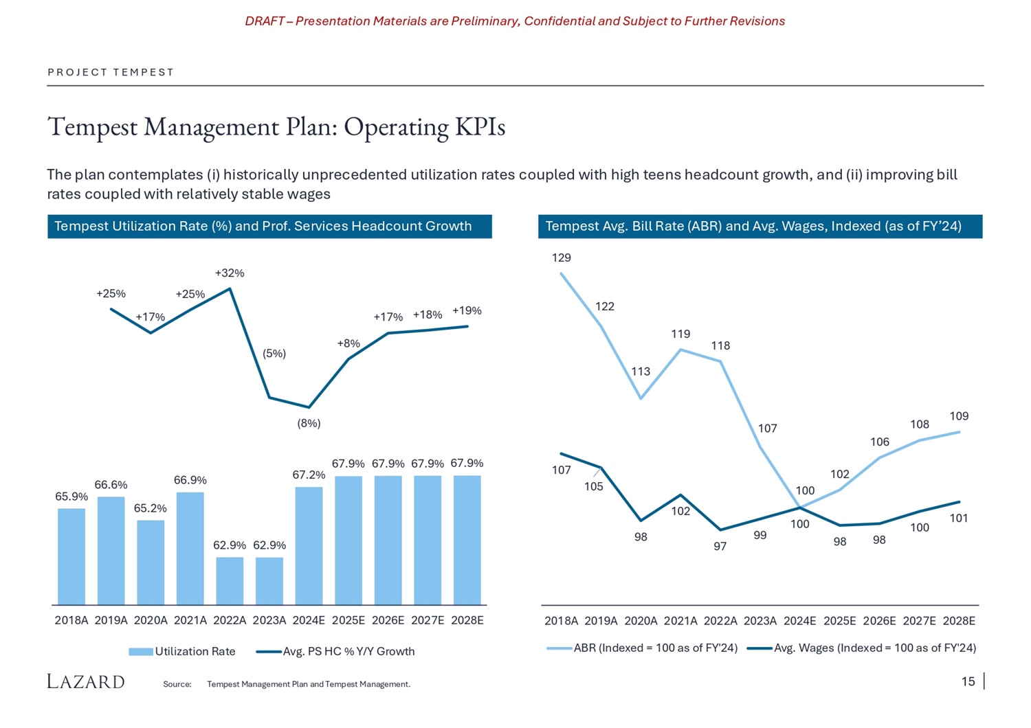 DRAFT – Presentation Materials are Preliminary, Confidential and Subject to Further Revisions Tempest Management Plan: Long Term EBITDA Margins Benchmarking vs. Peers Tempest’s median EBITDA margin 1 was 8% from 2007 to 2023, well below its Digital peers in all but the COVID boom years; the plan calls for margins to exceed the level of the peers, though consensus has Tempest’s margins remaining materially below them through 2026 P R O J E C T T E M P E S T E B ITDA M a r g in % 1 6% 4% 0% 2007 2008 2009 2010 2011 2012 2013 2014 2015 2016 2017 2018 2019 2020 2021 2022 2023 2024 2025 2026 2027 2028 7% 6% 8% 7% 9% 6 % 7% 7% 10% 14% 14% 21% 10% 9% 13% 17% 19% 8% 12% 14% 8% 13% 15% 15% 11% 17% 18% 19 % 19% 14% 19% 21% 20% 20% 20% 19% 21% 19% 17% 18% 18 % 18% 5% 10% 15% 20% 25% Tempest Management Plan Tempest Broker Consensus Digital IT Services Peer Median (EPAM, Globant and Endava) 2 Source: Tempest Management Plan, Tempest Management, company filings and FactSet as of 5/28/2024. 1 Tempest EBITDA margin is based on Unadjusted EBITDA from 2007 - 2016 and Adjusted EBITDA thereafter. 2 Digital IT Services Peers are included in the median beginning in the following years, respectively: EPAM (2008), Globant (2010) and Endava (2016). 14