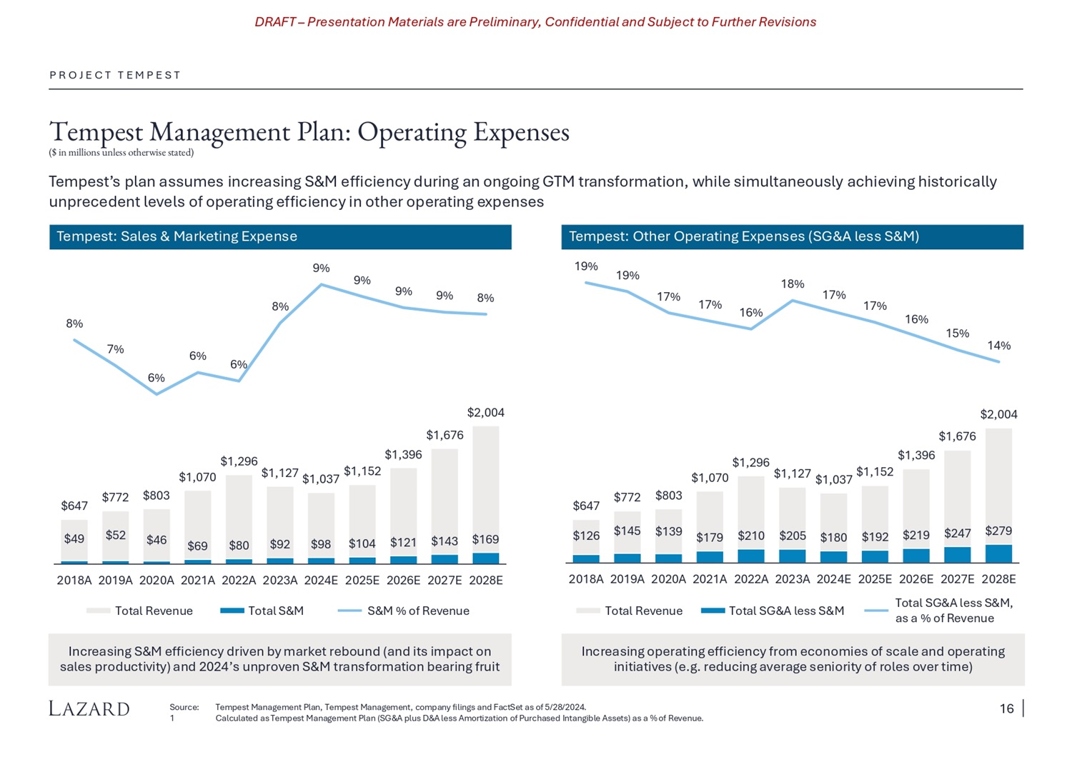 DRAFT – Presentation Materials are Preliminary, Confidential and Subject to Further Revisions P R O J E C T T E M P E S T Tempest Management Plan: Operating Expenses ($ i n mi ll i o n s un l e ss o t h e r w i s e s tated) Tempest’s plan assumes increasing S&M efficiency during an ongoing GTM transformation, while simultaneously achieving historically unprecedent levels of operating efficiency in other operating expenses T empe s t : S ale s & Ma r k eting E xp en s e Tempest: Other Operating Expenses (SG&A less S&M) $49 $52 $46 $69 $80 $92 $98 $104 $121 $143 $169 $647 $772 $803 $1,07 0 $1,29 6 $1,127 $1,037 $1,152 $1,39 6 $1,67 6 $2,00 4 8 % 7 % 6 % 6 % 6 % 8 % 9 % 9 % 9 % 9 % 8 % $126 $145 $139 $179 $210 $205 $180 $192 $219 $247 $279 $647 $772 $803 $1 ,0 7 0 $1,29 6 $1,127 $1,037 $1,152 $1,39 6 $1,67 6 $2 ,0 0 4 19 % 19 % 17 % 17 % 16 % 18 % 17 % 17 % 16 % 15 % 14 % 2018A 2019A 2020A 2021A 2022A 2023A 2024E 2025E 2026E 2027E 2028E Increasing S&M efficiency driven by market rebound (and its impact on sales productivity) and 2024’s unproven S&M transformation bearing fruit I n c reasi n g o p e rat in g e ff i c ie n c y f r o m e c o n omi e s of s c al e a n d o p e rat in g initiatives (e.g. reducing average seniority of roles over time) So u r c e : 1 Tempest Management Plan, Tempest Management, company filings and FactSet as of 5/28/2024. Calculated as Tempest Management Plan (SG&A plus D&A less Amortization of Purchased Intangible Assets) as a % of Revenue. 2018A 2019A 2020A 2021A 2022A 2023A 2024E 2025E 2026E 2027E 2028E To tal Re v e nu e To tal S&M S & M % o f R e v e nu e To tal Re v e nu e T o tal S G & A l e s s S &M To tal SG & A l e s s S&M, as a % of R e v e nu e 16