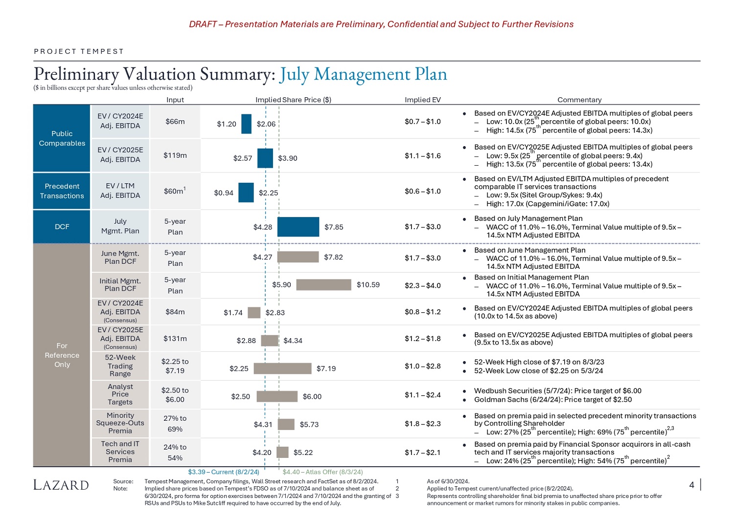 I n put I m p l ied S h are P ri c e ($) I m p l ied EV C o m m e nt ary Public C o m para bl e s E V / CY 2024E Adj. EB I T D A Based on EV/CY20 th 24E Adjusted EBITDA multiples of global peers Low: 10.0x (25 percentile of global peers: 10.0x) th High: 14.5x (75 percentile of global peers: 14.3x) E V / CY 2025E Ad j. E B I T D A $119m $1. 1 – $1. 6 Based on EV/CY2025E Adjusted EBITDA multiples of global peers Low: 9.5x (25 th percentile of global peers: 9.4x) High: 13.5x (75 th percentile of global peers: 13.4x) Precedent Tran s ac t io n s E V / L TM Ad j. E B I T D A $60m 1 $0. 6 – $1. 0 Based on EV/LTM Adjusted EBITDA multiples of precedent comparable IT services transactions L o w: 9 . 5 x ( Site l Gr o up/ S y k e s : 9 . 4x) Hi gh : 17. 0 x (Ca p g e mini / iGat e : 17. 0x) D CF July M g mt. P l an 5 - y e ar Plan B as e d o n Ju l y M anag e me nt P l an WACC of 11.0% – 16.0%, Terminal Value multiple of 9.5x – 14.5 x NTM Ad ju s t e d E B I T D A For R e f e ren c e Only Ju n e M g mt. P l a n D CF 5 - y e ar Plan B as e d o n Ju n e M anag e me nt P l an WACC of 11.0% – 16.0%, Terminal Value multiple of 9.5x – 14.5 x NTM Ad ju s t e d E B I T D A 5 - y e ar Plan $2. 3 – $4. 0 I n i t ial M g m t . P l a n D CF E V / CY 2024E $84m $0. 8 – $1. 2 B as e d o n I n itial M anag e me nt P l an WACC of 11.0% – 16.0%, Terminal Value multiple of 9.5x – 14.5 x NTM Ad ju s t e d E B I T D A Based on EV/CY2024E Adjusted EBITDA multiples of global peers (10 . 0 x t o 14. 5 x as abo v e ) Ad j. E B I T D A (Consensus) E V / CY 2025E Ad j. E B I T D A (Consensus) $131m $1. 2 – $1. 8 Based on EV/CY2025E Adjusted EBITDA multiples of global peers (9. 5 x t o 13 . 5 x a s ab o v e ) 52 - W ee k Trading Range $2.2 5 t o $7.19 $1. 0 – $2. 8 52 - W ee k Hi g h c l o s e o f $7.1 9 o n 8/3/ 23 52 - W ee k L o w c l o s e o f $2.2 5 o n 5/3/ 24 A n al yst Price Ta rg e t s $2.5 0 t o $6.00 $1. 1 – $2. 4 Wedbush Securities (5/7/24): Price target of $6.00 G o l dm a n S ac h s (6/ 24 / 24 ): P ri c e t ar g e t o f $2 . 50 Minority S quee z e - Outs Premia 27 % t o 69% $1. 8 – $2. 3 Based on premia paid in selected precedent minority transactions b y Co n t r o ll i n g S h t a h r e h o l de r Low: 27% (25 percentile); High: 69% (75 percentile) th 2 , 3 T e c h an d I T Services Premia 24 % to 54% $1 . 7 – $2 . 1 Based on premia paid by Financial Sponsor acquirors in all - cash t e c h an d I T s e rvi c t h e s maj o rit y t ran s ac t io n s Low: 24% (25 percentile); High: 54% (75 percentile) th 2 ($ in billions except per share values unless otherwise stated) DRAFT – Presentation Materials are Preliminary, Confidential and Subject to Further Revisions P R O J E C T T E M P E S T Preliminary Valuation Summary: July Management Plan So u r c e : Note: 1 I m pli e d s h a r e p r i c e s ba s e d on T em p e s t ’ s F D SO a s of 7 / 10 / 202 4 a n d ba lanc e s h ee t a s of 2 6 / 30 / 2024 , pro forma for option exercises between 7 / 1 / 2024 and 7 / 10 / 2024 and the granting of 3 RSUs and PSUs to Mike Sutcliff required to have occurred by the end of July . $3.39 – C u rr e n t ( 8 / 2 / 24 ) $4.40 – A t l a s Of f er ( 8 / 3 / 24 ) Tempest Management, Company filings, Wall Street research and FactSet as of 8/2/2024. A s of 6 / 30 / 2024. Applied to Tempest current/unaffected price (8/2/2024). Represents controlling shareholder final bid premia to unaffected share price prior to offer announcement or market rumors for minority stakes in public companies. $5.90 $1.74 $2.88 $2.25 $2.50 $4.31 $4.20 $10.59 $2.83 $4.34 $7.19 $6.00 $5.73 $5.22 $2.57 $0.94 $66m $1.2 0 $2.0 6 $0. 7 – $1. 0 $3.90 $2.25 $1 . 7 – $3 . 0 $7.85 $4.28 $1 . 7 – $3 . 0 $7.82 $4.27 4