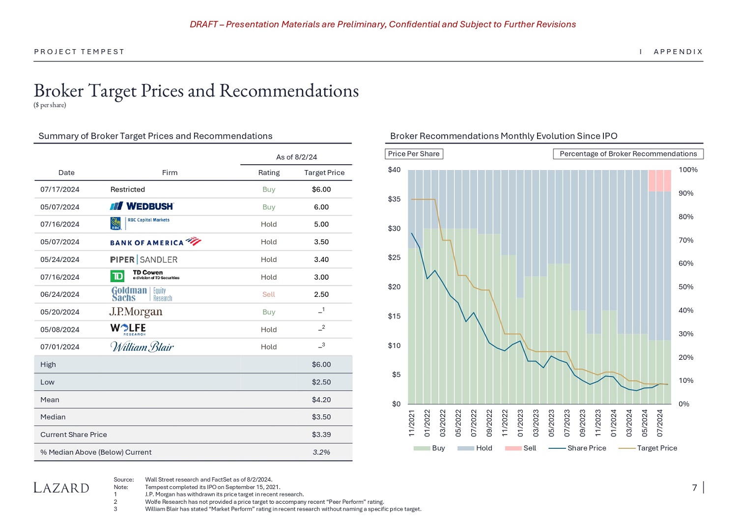 DRAFT – Presentation Materials are Preliminary, Confidential and Subject to Further Revisions P R O J E C T T E M P E S T Source: Wall Street research and FactSet as of 8/2/2024. Note: Tempest completed its IPO on September 15, 2021. 1 J.P. Morgan has withdrawn its price target in recent research. 2 Wolfe Research has not provided a price target to accompany recent “Peer Perform” rating. 3 William Blair has stated “Market Perform” rating in recent research without naming a specific price target. 0% 10% 20% 30% 40% 50% 60% 70% 80% 90% 100% $0 $5 $10 $15 $20 $25 $30 $35 $40 11/2021 01/2022 03/2022 05/2022 07/2022 09/2022 11/2022 01/2023 03/2023 05/2023 07/2023 09/2023 11/2023 01/2024 03/2024 05/2024 07/2024 B uy H o l d S e l l Sh ar e P ric e Ta rg e t P r i c e P ric e P e r S hare P e rc e n t ag e o f B r o k e r R e c o mm e n dati o n s A s o f 8 / 2 / 24 Ta rg et P ric e Rating Firm Date $6.00 Buy Restricted 07/17/2024 6.00 Buy 05/07/2024 5.00 Hold 07/16/2024 3.50 Hold 05/07/2024 3.40 Hold 05/24/2024 3.00 Hold 07/16/2024 2.50 Sell 06/24/2024 – 1 Buy 05/20/2024 – 2 Hold 05/08/2024 – 3 Hold 07/01/2024 $6.00 High $2.50 Low $4.20 Mean $3.50 Median $3.39 Curr e n t S har e Pric e 3.2% % M edian Abov e ( B e l o w) Curr e n t Broker Target Prices and Recommendations ($ p er s h a r e) S u mm a r y of B r o k e r Tar g e t Price s a n d Re c om m e n d a t io n s B r o k e r Re c om m e n d a t io n s M o n t h ly Ev o lu t ion Since IPO I A P P E N D I X 7