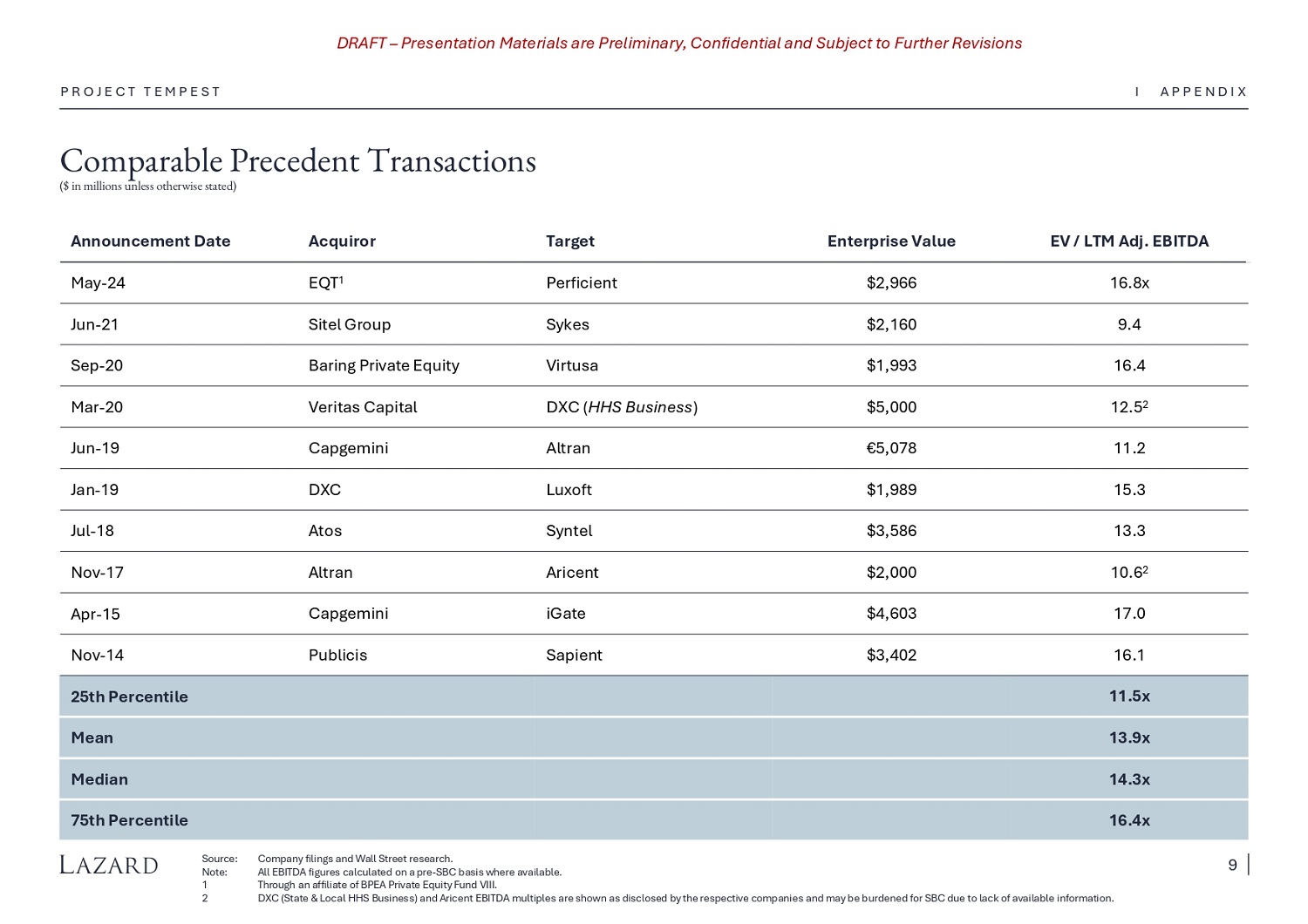 DRAFT – Presentation Materials are Preliminary, Confidential and Subject to Further Revisions Comparable Compan i es A n alysis ($ i n b i ll i o n s ) En t e r p r i s e V a l ue / P R O J E C T T E M P E S T Source: Company filings, Wall Street research and FactSet as of 8/2/2024. Not e : Y e a r s r e f e r t o c al e n da r y e a r s . 1 All EBITDA figures shown are Adjusted EBITDA presented on a like - for - like basis excluding stock - based compensation. 2 Organic revenue growth figures are shown where available. 3 Several Endava metrics (including Equity Value, Enterprise Value, and CY2024E Revenue and EBITDA on a pro forma basis) cannot be calculated at present due to insufficient disclosures related to the 4/10/24 acquisition of GalaxE (principally cash vs. stock consideration mix and its pro forma contribution to Revenue and EBITDA). '24 – '25 '23 – '24 '22 – '23 25E 24E 23A/E 25E 24E 23A/E 25E NTM 24E 23A/E 25E 24E 23A/E Value Value High Low Company D ig i t a l I T S e r v i ce s 8% (1%) (3%) 17% 17% 18% 31% 31% 31% 12.2x 13.2x 13.4x 12.6x 2.11x 2.26x 2.23x $10.5 $12.5 (34%) 23% E P A M S y s t e m s 16% 16% 11% 20% 20% 21% 38% 38% 38% 15.0 16.9 17.6 19.8 3.04 3.53 4.08 8.6 8.5 (24%) 24% Globant NM NM NM NM NM NM NM NM NM NM NM NM NM NM NM NM NM NM (63%) 20% Endava 3 10% 3% 1% 18% 18% 18% 33% 33% 32% 12.9x 14.1x 14.5x 14.4x 2.34x 2.58x 2.70x 25 t h P e r ce n t i l e 12% 7% 4% 19% 18% 19% 35% 34% 34% 13.6 15.1 15.5 16.2 2.57 2.90 3.16 Mean 12% 7% 4% 19% 18% 19% 35% 34% 34% 13.6 15.1 15.5 16.2 2.57 2.90 3.16 Median 14% 11% 8% 20% 19% 20% 36% 36% 36% 14.3 16.0 16.6 18.0 2.80 3.21 3.62 75 t h P e r ce n t i l e D i v e r s ifi e d I T S e r v i ce s 5% 2% 3% 22% 22% 22% 33% 33% 32% 13.4x 14.3x 14.3x 14.7x 2.98x 3.14x 3.21x $206.7 $207.6 (16%) 15% Accenture 4% (1%) 4% 16% 16% 16% 27% 27% 27% 9.4 9.7 10.0 9.9 1.52 1.59 1.57 38.7 34.8 (21%) 13% Capgemini 4% 0% (1%) 19% 19% 19% 34% 34% 35% 9.1 9.4 9.6 9.8 1.76 1.82 1.83 35.4 37.0 (7%) 17% C o g ni z a n t T ec h 4% (0%) 1% 18% 17% 17% 30% 30% 30% 9.3x 9.5x 9.8x 9.9x 1.64x 1.71x 1.70x 25 t h P e r ce n t i l e 4% 1% 2% 19% 19% 19% 31% 31% 31% 10.6 11.1 11.3 11.5 2.09 2.18 2.21 Mean 4% 0% 3% 19% 19% 19% 33% 33% 32% 9.4 9.7 10.0 9.9 1.76 1.82 1.83 Median 5% 1% 3% 21% 20% 20% 33% 33% 33% 11.4 12.0 12.1 12.3 2.37 2.48 2.52 75 t h P e r ce n t i l e 4% (1%) (1%) 17% 17% 18% 31% 31% 31% 9.4x 9.7x 10.0x 9.9x 1.76x 1.82x 1.83x G l o b a l 25 t h P e r c . 7% 3% 3% 19% 19% 19% 33% 33% 33% 11.8 12.7 13.0 13.4 2.28 2.47 2.59 G l o b a l M e a n 5% 0% 3% 19% 19% 19% 33% 33% 32% 12.2 13.2 13.4 12.6 2.11 2.26 2.23 G l o b a l M e d i a n 8% 2% 4% 20% 20% 21% 34% 34% 35% 13.4 14.3 14.3 14.7 2.98 3.14 3.21 G l o b a l 75 t h P e r c . % C h . 5 2 W k . E qu i t y En t e r p r i s e R e v e nue A d j . E B I T D A 1 G r o s s Ma r g i n A d j . E B I T DA Ma r g in 1 R e v e nue G r o w t h 2 I A P P E N D I X 8