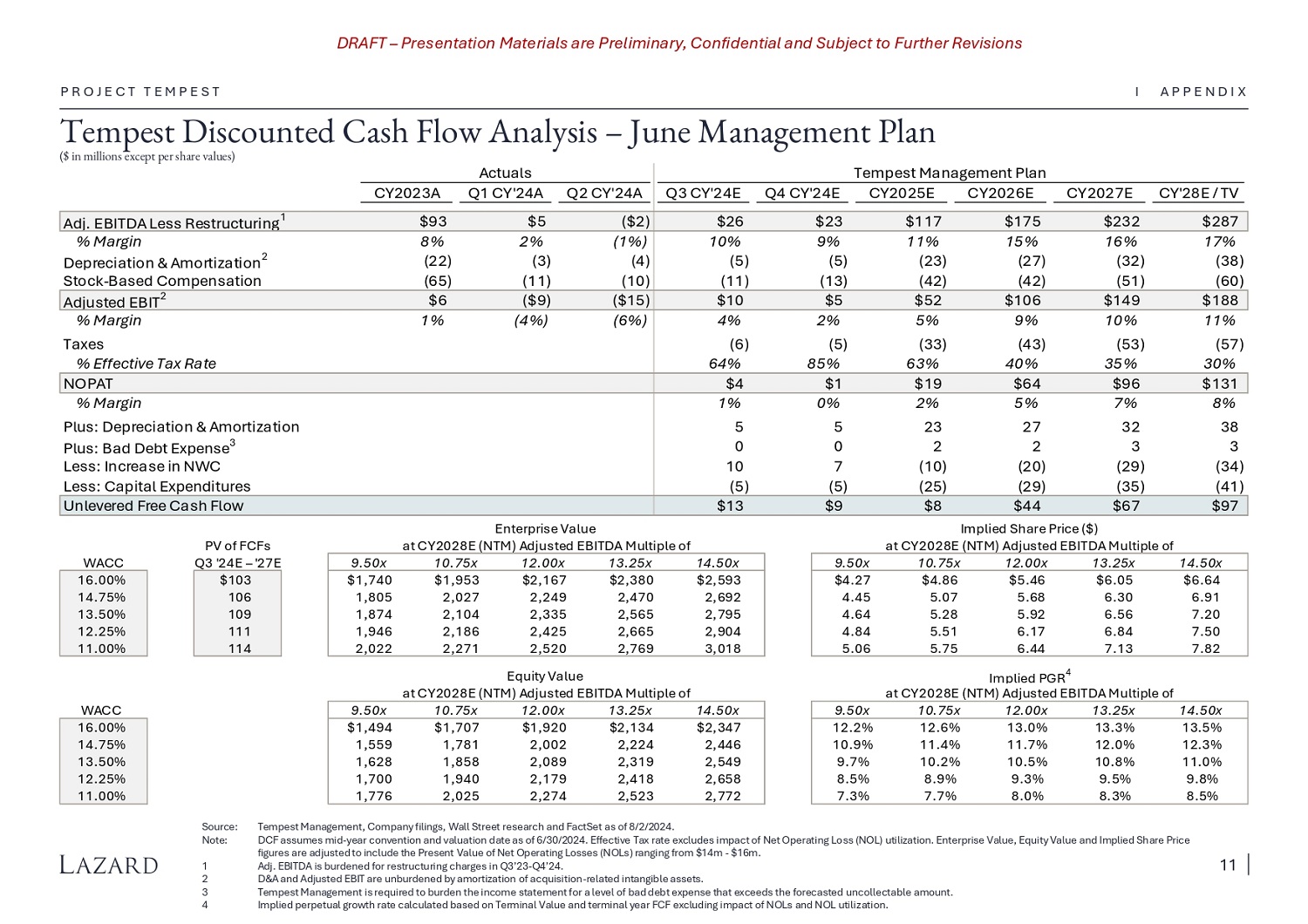 DRAFT – Presentation Materials are Preliminary, Confidential and Subject to Further Revisions ($ i n mi ll i o n s exc ept p er s h a r e v a l u es ) P R O J E C T T E M P E S T Tempest Discounted Cash Flow Analysis – July Management Plan So u r c e : Note: Tempest Management, Company filings, Wall Street research and FactSet as of 8/2/2024. DCF assumes mid - year convention and valuation date as of 6/30/2024. Effective Tax rate excludes impact of Net Operating Loss (NOL) utilization. Enterprise Value, Equity Value and Implied Share Price figures are adjusted to include the Present Value of Net Operating Losses (NOLs) ranging from $14m - $16m. Adj. EBITDA is burdened for restructuring charges in Ǫ3’23 - Ǫ4’24. D&A and Adjusted EBIT are unburdened by amortization of acquisition - related intangible assets. Tempest Management is required to burden the income statement for a level of bad debt expense that exceeds the forecasted uncollectable amount. Implied perpetual growth rate calculated based on Terminal Value and terminal year FCF excluding impact of NOLs and NOL utilization. 1 2 3 4 T e m p e s t M a n a g e m e n t P l a n Ǫ3 CY'24E Ǫ4 CY'24E CY2025E CY2026E Ǫ 2 C Y ' 24 A Actuals C Y 2023 A Ǫ 1 C Y ' 24 A $176 $119 $17 $5 ($2) $5 $93 A d j . E B I T DA L e s s R e s t r u c t u r in g 1 15% 12% 7% 2% (1%) 2% 8% % M a r g i n (24) (21) (5) (5) (4) (3) (22) D e p r e c i a t io n & A m o r t i z a t io n 2 (41) (41) (13) (11) (10) (11) (65) S t o c k - B a s e d C o m p e n s a t io n $111 $57 ($1) ($12) ($15) ($9) $6 A d j u s t e d E B I T 2 9% 6% (0%) (5%) (6%) (4%) 1% % M a r g i n (40) (31) (5) (6) Taxes 36% 53% (553%) (56%) % E ff ec t i v e T a x R a te $71 $27 ($5) ($18) NOPAT 6% 3% (2%) (7%) % M a r g i n 24 21 5 5 P l u s : D e p r e c i a t io n & A m o r t i z a t io n 2 2 0 2 P l u s : B a d D e bt E x p e n s e 3 (21) 8 7 2 L e ss : I n c r e a s e i n NW C (28) (24) (5) (5) L e ss : C a p i t a l E x p e n d i t u r e s $49 $34 $2 ($14) U n l e v e r e d F r e e C a s h F l o w E n t e r p r i s e V a l ue a t C Y 2028 E ( N T M ) A d j us t e d E B I T DA M u l t i p l e o f I m p l i e d Sh a r e P r i c e ( $ ) a t C Y 2028 E ( N T M ) A d j us t e d E B I T DA M u l t i p l e o f P V o f F C F s Ǫ 3 ' 24 E – ' 27 E W A C C 14.50x 13.25x 12.00x 10.75x 9.50x $2,601 $2,387 $2,172 $1,958 $1,744 2,700 2,478 2,255 2,032 1,810 2,804 2,573 2,342 2,110 1,879 2,914 2,673 2,433 2,193 1,952 3,029 2,779 2,529 2,279 2,029 14.50x 13.25x 12.00x 10.75x 9.50x $6.66 $6.07 $5.47 $4.88 $4.28 6.94 6.32 5.70 5.08 4.46 7.23 6.59 5.94 5.30 4.66 7.53 6.86 6.20 5.53 4.86 7.85 7.16 6.46 5.77 5.07 16.00% 14.75% 13.50% 12.25% 11.00% $100 103 106 109 112 E qu i t y V a l ue a t C Y 2028 E ( N T M ) A d j us t e d E B I T DA M u l t i p l e o f I m p l i e d P G R 4 a t C Y 2028 E ( N T M ) A d j us t e d E B I T DA M u l t i p l e o f W A C C 14.50x 13.25x 12.00x 10.75x 9.50x $2,355 $2,140 $1,926 $1,712 $1,497 2,454 2,231 2,009 1,786 1,564 2,558 2,327 2,096 1,864 1,633 2,668 2,427 2,187 1,946 1,706 2,783 2,533 2,283 2,033 1,783 14.50x 13.25x 12.00x 10.75x 9.50x 13.4% 13.2% 12.9% 12.5% 12.1% 12.2% 11.9% 11.7% 11.3% 10.8% 11.0% 10.7% 10.4% 10.1% 9.6% 9.7% 9.5% 9.2% 8.8% 8.4% 8.5% 8.2% 8.0% 7.6% 7.2% 16.00% 14.75% 13.50% 12.25% 11.00% I A P P E N D I X 10