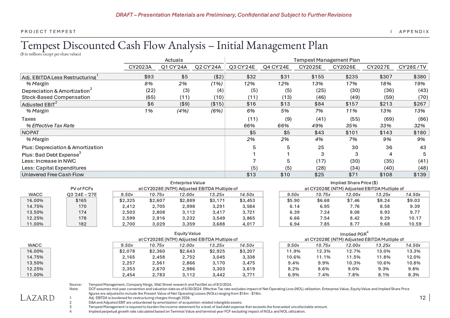DRAFT – Presentation Materials are Preliminary, Confidential and Subject to Further Revisions ($ i n mi ll i o n s exc ept p er s h a r e v a l u es ) P R O J E C T T E M P E S T Tempest Discounted Cash Flow Analysis – June Management Plan T e m p e s t M a n a g e m e n t P l a n Ǫ3 CY'24E Ǫ4 CY'24E CY2025E CY2026E Ǫ 2 C Y ' 24 A Actuals C Y 2023 A Ǫ 1 C Y ' 24 A $175 $117 $23 $26 ($2) $5 $93 A d j . E B I T DA L e s s R e s t r u c t u r in g 1 15% 11% 9% 10% (1%) 2% 8% % M a r g i n (27) (23) (5) (5) (4) (3) (22) D e p r e c i a t io n & A m o r t i z a t io n 2 (42) (42) (13) (11) (10) (11) (65) S t o c k - B a s e d C o m p e n s a t io n $106 $52 $5 $10 ($15) ($9) $6 A d j u s t e d E B I T 2 9% 5% 2% 4% (6%) (4%) 1% % M a r g i n (43) (33) (5) (6) Taxes 40% 63% 85% 64% % E ff ec t i v e T a x R a te $64 $19 $1 $4 NOPAT 5% 2% 0% 1% % M a r g i n 27 23 5 5 P l u s : D e p r e c i a t io n & A m o r t i z a t io n 2 2 0 0 P l u s : B a d D e bt E x p e n s e 3 (20) (10) 7 10 L e ss : I n c r e a s e i n NW C (29) (25) (5) (5) L e ss : C a p i t a l E x p e n d i t u r e s $44 $8 $9 $13 U n l e v e r e d F r e e C a s h F l o w E n t e r p r i s e V a l ue a t C Y 2028 E ( N T M ) A d j us t e d E B I T DA M u l t i p l e o f I m p l i e d Sh a r e P r i c e ( $ ) a t C Y 2028 E ( N T M ) A d j us t e d E B I T DA M u l t i p l e o f P V o f F C F s Ǫ 3 ' 24 E – ' 27 E W A C C 14.50x 13.25x 12.00x 10.75x 9.50x $2,593 $2,380 $2,167 $1,953 $1,740 2,692 2,470 2,249 2,027 1,805 2,795 2,565 2,335 2,104 1,874 2,904 2,665 2,425 2,186 1,946 3,018 2,769 2,520 2,271 2,022 14.50x 13.25x 12.00x 10.75x 9.50x $6.64 $6.05 $5.46 $4.86 $4.27 6.91 6.30 5.68 5.07 4.45 7.20 6.56 5.92 5.28 4.64 7.50 6.84 6.17 5.51 4.84 7.82 7.13 6.44 5.75 5.06 16.00% 14.75% 13.50% 12.25% 11.00% $103 106 109 111 114 E qu i t y V a l ue a t C Y 2028 E ( N T M ) A d j us t e d E B I T DA M u l t i p l e o f I m p l i e d P G R 4 a t C Y 2028 E ( N T M ) A d j us t e d E B I T DA M u l t i p l e o f W A C C 14.50x 13.25x 12.00x 10.75x 9.50x $2,347 $2,134 $1,920 $1,707 $1,494 2,446 2,224 2,002 1,781 1,559 2,549 2,319 2,089 1,858 1,628 2,658 2,418 2,179 1,940 1,700 2,772 2,523 2,274 2,025 1,776 14.50x 13.25x 12.00x 10.75x 9.50x 13.5% 13.3% 13.0% 12.6% 12.2% 12.3% 12.0% 11.7% 11.4% 10.9% 11.0% 10.8% 10.5% 10.2% 9.7% 9.8% 9.5% 9.3% 8.9% 8.5% 8.5% 8.3% 8.0% 7.7% 7.3% 16.00% 14.75% 13.50% 12.25% 11.00% So u r c e : Note: Tempest Management, Company filings, Wall Street research and FactSet as of 8/2/2024. DCF assumes mid - year convention and valuation date as of 6/30/2024. Effective Tax rate excludes impact of Net Operating Loss (NOL) utilization. Enterprise Value, Equity Value and Implied Share Price figures are adjusted to include the Present Value of Net Operating Losses (NOLs) ranging from $14m - $16m. Adj. EBITDA is burdened for restructuring charges in Ǫ3’23 - Ǫ4’24. D&A and Adjusted EBIT are unburdened by amortization of acquisition - related intangible assets. Tempest Management is required to burden the income statement for a level of bad debt expense that exceeds the forecasted uncollectable amount. Implied perpetual growth rate calculated based on Terminal Value and terminal year FCF excluding impact of NOLs and NOL utilization. 1 2 3 4 I A P P E N D I X 11