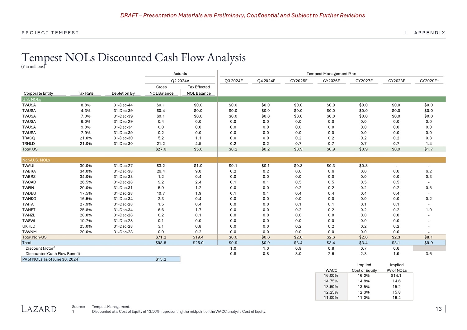 DRAFT – Presentation Materials are Preliminary, Confidential and Subject to Further Revisions Tempest NOLs Discounted Cash Flow Analysis ($ i n mi ll i o n s ) P R O J E C T T E M P E S T So u r c e : 1 T em p e s t M a n a g e me n t . Discounted at a Cost of Equity of 13.50%, representing the midpoint of the WACC analysis Cost of Equity. T e m p e s t M a n a g e m e n t P l a n Ǫ3 2024E Ǫ4 2024E CY2025E CY2026E CY2027E CY2028E CY2029E+ Actuals Ǫ 2 2024 A Gr o s s T a x E ff e c t e d N O L B a l a n c e N O L B a l a n c e D e p l e t io n B y T a x R a t e C o r p o r a t e E n t i t y U . S . N O Ls $0.0 $0.0 $0.0 $0.0 $0.0 $0.0 $0.0 $0.0 $0.1 31 - Dec - 44 8.8% TWUSA $0.0 $0.0 $0.0 $0.0 $0.0 $0.0 $0.0 $0.0 $0.4 31 - Dec - 39 4.3% TWUSA $0.0 $0.0 $0.0 $0.0 $0.0 $0.0 $0.0 $0.0 $0.1 31 - Dec - 39 7.0% TWUSA 0.0 0.0 0.0 0.0 0.0 0.0 0.0 0.0 0.4 31 - Dec - 29 6.0% TWUSA 0.0 0.0 0.0 0.0 0.0 0.0 0.0 0.0 0.0 31 - Dec - 34 9.8% TWUSA 0.0 0.0 0.0 0.0 0.0 0.0 0.0 0.0 0.2 31 - Dec - 39 7.9% TWUSA 0.3 0.2 0.2 0.2 0.2 0.0 0.0 1.1 5.2 31 - Dec - 30 21.0% TRACǪ 1.4 0.7 0.7 0.7 0.7 0.2 0.2 4.5 21.2 31 - Dec - 30 21.0% TRHLD $1.7 $0.9 $0.9 $0.9 $0.9 $0.2 $0.2 $5.6 $27.6 T o t a l US N on - U . S . N O Ls - - $0.3 $0.3 $0.3 $0.1 $0.1 $1.0 $3.2 31 - Dec - 27 30.0% TWAUI 6.2 0.6 0.6 0.6 0.6 0.2 0.2 9.0 26.4 31 - Dec - 38 34.0% TWBRA 0.3 0.0 0.0 0.0 0.0 0.0 0.0 0.4 1.2 31 - Dec - 38 34.0% TWBRZ - 0.5 0.5 0.5 0.5 0.1 0.1 2.4 9.2 31 - Dec - 28 26.5% TWCAD 0.5 0.2 0.2 0.2 0.2 0.0 0.0 1.2 5.9 31 - Dec - 31 20.0% TWFIN - 0.4 0.4 0.4 0.4 0.1 0.1 1.9 10.7 31 - Dec - 28 17.5% TWDEU 0.2 0.0 0.0 0.0 0.0 0.0 0.0 0.4 2.3 31 - Dec - 34 16.5% TWHKG - 0.1 0.1 0.1 0.1 0.0 0.0 0.4 1.5 31 - Dec - 28 27.9% TWITA 1.0 0.2 0.2 0.2 0.2 0.0 0.0 1.7 6.6 31 - Dec - 34 25.8% TWNET - 0.0 0.0 0.0 0.0 0.0 0.0 0.1 0.2 31 - Dec - 28 28.0% TWNZL - 0.0 0.0 0.0 0.0 0.0 0.0 0.0 0.1 31 - Dec - 28 19.7% TWSWI - 0.2 0.2 0.2 0.2 0.0 0.0 0.8 3.1 31 - Dec - 28 25.0% UKHLD - 0.0 0.0 0.0 0.0 0.0 0.0 0.2 0.9 31 - Dec - 28 20.0% TWVNM $8.1 $2.3 $2.6 $2.6 $2.6 $0.6 $0.6 $19.4 $71.2 T o t a l N on - US $9.9 $3.1 $3.4 $3.4 $3.4 $0.9 $0.9 $25.0 $98.8 Total D i s c o un t f a c t o r 1 D i s c o un t e d C a s h F l o w B e n e f i t 1 . 0 0 . 8 1 . 0 0 . 8 0 . 9 3 . 0 0 . 8 2 . 6 0 . 7 2 . 3 0 . 6 1 . 9 3 . 6 PV of NOLs as of June 30, 2024 1 $15.2 W A C C Implied C o s t o f E qu i t y Implied P V o f N O Ls $14.1 16.0% 16.00% 14.6 14.8% 14.75% 15.2 13.5% 13.50% 15.8 12.3% 12.25% 16.4 11.0% 11.00% I A P P E N D I X 13