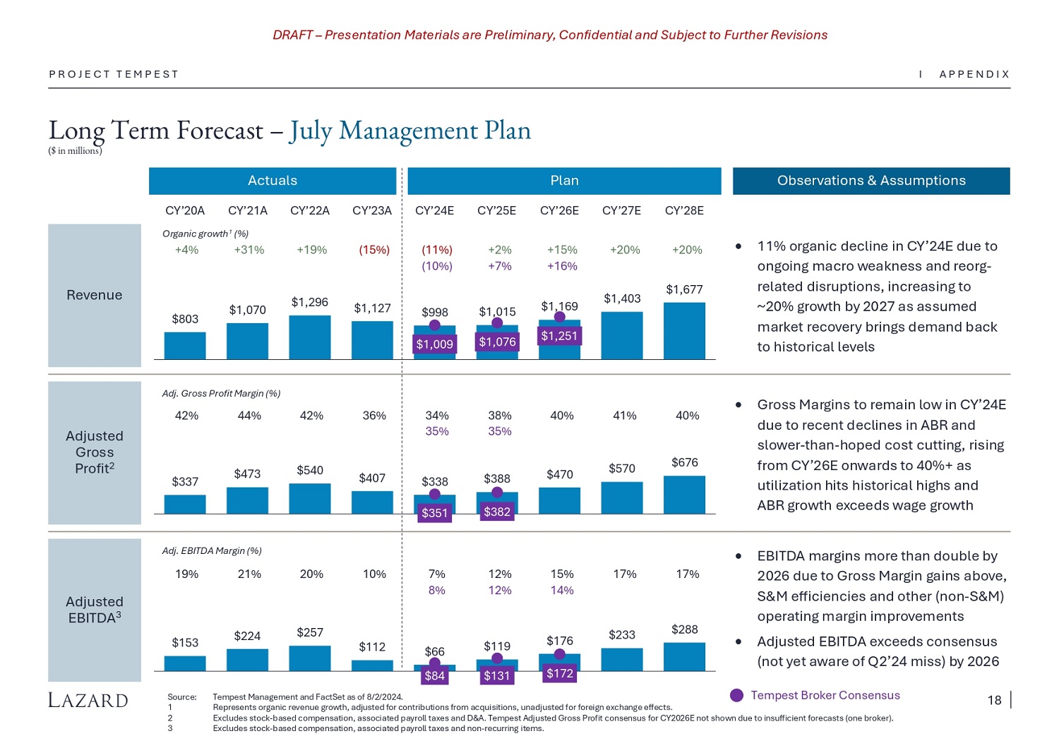 DRAFT – Presentation Materials are Preliminary, Confidential and Subject to Further Revisions $153 $224 $257 $112 $66 $119 $176 $233 $288 $84 $131 $172 Lo n g Term F o re c ast – J u ly Mana ge m ent Plan ($ i n mi ll i o n s ) P R O J E C T T E M P E S T So u r c e : T em p e s t M a n a g e me n t a n d F a c t S e t a s of 8 / 2 /2024. 1 Represents organic revenue growth, adjusted for contributions from acquisitions, unadjusted for foreign exchange effects. 2 3 Excludes stock - based compensation, associated payroll taxes and D&A. Tempest Adjusted Gross Profit consensus for CY2026E not shown due to insufficient forecasts (one broker). Excludes stock - based compensation, associated payroll taxes and non - recurring items. CY’28E CY’27E CY’26E CY’25E CY’24E CY’23A CY’22A CY’21A CY’20A Revenue Adju s ted Gross Profit 2 Adju s ted EBITDA 3 r el a te d dis r up t ion s , in c r ea s ing to ~ 20 % g r o w t h b y 202 7 a s a s s umed m ar k et r ec o v e r y b r in g s dema n d ba c k t o hi s t o r i c a l le v els G r oss Ma r g ins t o r emain l o w in C Y’2 4 E due t o r ecent de c lin e s in AB R and s l o w e r - t h an - ho p ed c o s t c ut t in g , r i s ing f r o m C Y’ 2 6 E o n w a r ds t o 40 % + as utiliz ati on hit s hi s t o r i c a l hi g hs and AB R g r o w t h e x c e e ds wa g e g r o w t h E B IT D A m a r g ins m o r e t h a n double by 202 6 due t o G r oss Ma r g in g ain s ab o v e , S & M efficien cie s an d o th e r ( non - S &M ) ope r atin g m a r g in im p r o v ements Adju s te d E B IT D A e x c e e ds c onse ns us ( no t y et awa r e of Ǫ 2 ’ 2 4 m i s s ) b y 202 6 Ob s e r v a ti o ns & A ss ump t ions Actuals Plan Or g a n i c g r o w t h 1 (%) $803 $1,07 0 $1,29 6 $1,12 7 $998 $1,01 5 $1,16 9 $1,40 3 $1,67 7 $1,00 9 $1,076 $1,25 1 A d j . E BI TD A Ma r g i n ( % ) 19% 21% 20% 10% 17% 17% $337 $473 $540 $407 $338 $388 $470 $570 $676 $351 $382 A d j . G r o s s P r o f i t Ma r g i n ( % ) 42% 44% 42% 36% 40% 41% 40% 11 % o r g ani c de clin e in C Y’ 24 E d ue to +20% +20% +15% +2% (11%) (15%) +19% +31% +4% on g oing ma c r o w ea k ne s s an d r eo r g - +16% +7% (10%) 38% 35% 34% 35% 12% 12% 15% 14% 7% 8% T e m p e s t Bro k e r C on s e n s u s I A P P E N D I X 18