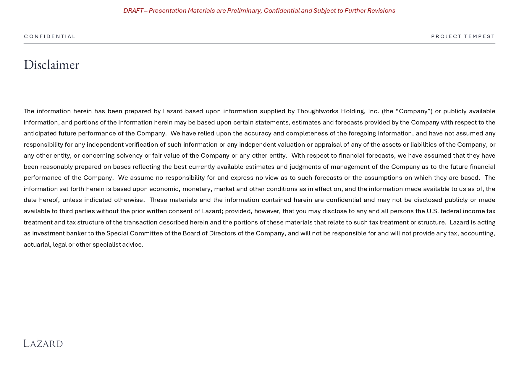 C O N F I D E N T I A L DRAFT – Presentation Materials are Preliminary, Confidential and Subject to Further Revisions Disclaimer P R O J E C T T E M P E S T The information herein has been prepared by Lazard based upon information supplied by Thoughtworks Holding, Inc . (the “Company”) or publicly available information, and portions of the information herein may be based upon certain statements, estimates and forecasts provided by the Company with respect to the anticipated future performance of the Company . We have relied upon the accuracy and completeness of the foregoing information, and have not assumed any responsibility for any independent verification of such information or any independent valuation or appraisal of any of the assets or liabilities of the Company, or any other entity, or concerning solvency or fair value of the Company or any other entity . With respect to financial forecasts, we have assumed that they have been reasonably prepared on bases reflecting the best currently available estimates and judgments of management of the Company as to the future financial performance of the Company . We assume no responsibility for and express no view as to such forecasts or the assumptions on which they are based . The information set forth herein is based upon economic, monetary, market and other conditions as in effect on, and the information made available to us as of, the date hereof, unless indicated otherwise . These materials and the information contained herein are confidential and may not be disclosed publicly or made available to third parties without the prior written consent of Lazard ; provided, however, that you may disclose to any and all persons the U . S . federal income tax treatment and tax structure of the transaction described herein and the portions of these materials that relate to such tax treatment or structure . Lazard is acting as investment banker to the Special Committee of the Board of Directors of the Company, and will not be responsible for and will not provide any tax, accounting, actuarial, legal or other specialist advice .