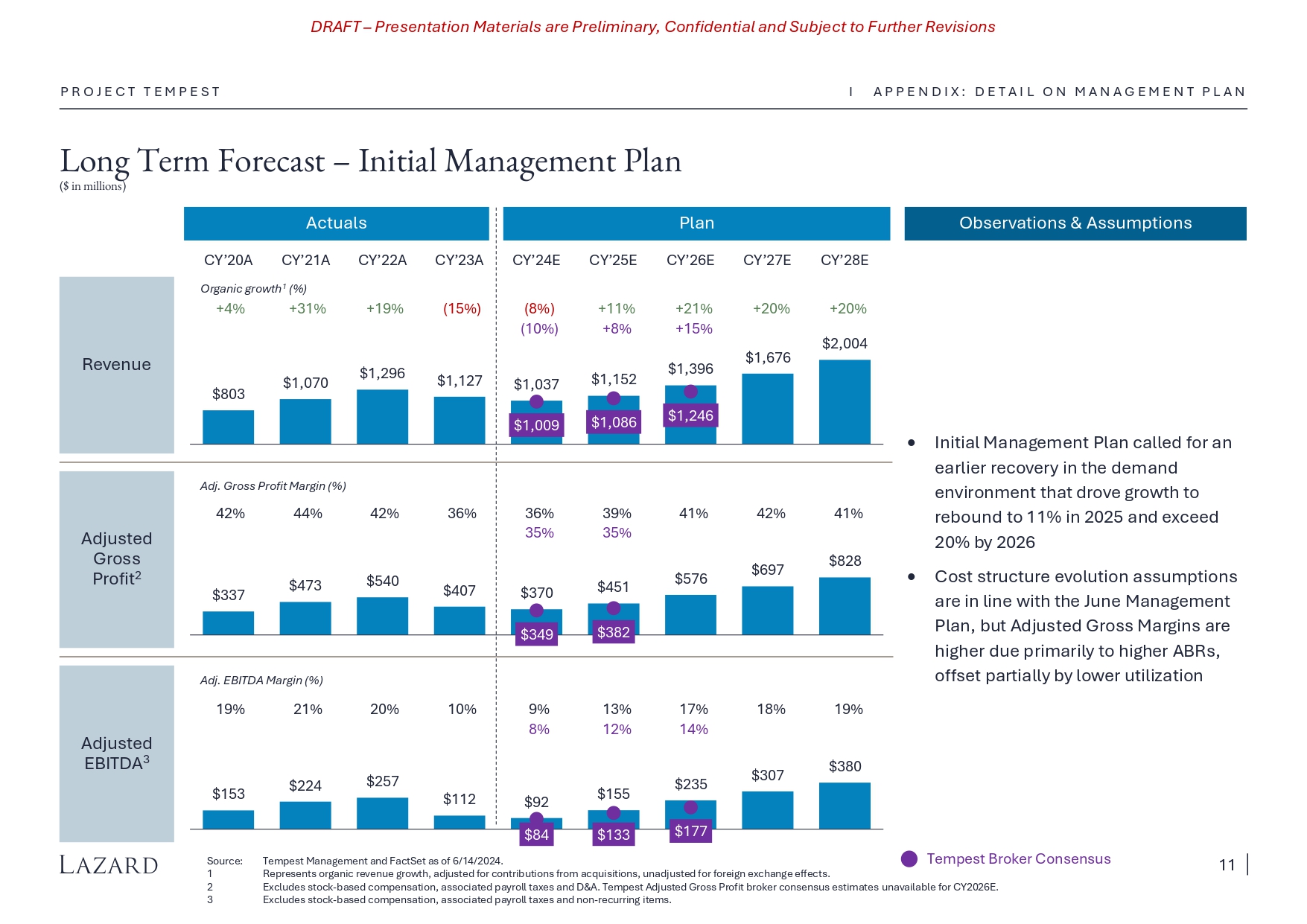DRAFT – Presentation Materials are Preliminary, Confidential and Subject to Further Revisions $84 $133 $177 Long Term Forecast – June Management Plan ($ in millions) P R O J E C T T E M P E S T Source: Tempest Management and FactSet as of 6/14/2024. 1 Represents organic revenue growth, adjusted for contributions from acquisitions, unadjusted for foreign exchange effects. 2 3 Excludes stock - based compensation, associated payroll taxes and D&A. Tempest Adjusted Gross Profit broker consensus estimates unavailable for CY2026E. Excludes stock - based compensation, associated payroll taxes and non - recurring items. CY’28E CY’27E CY’26E CY’25E CY’24E CY’23A CY’22A CY’21A CY’20A Revenue Adjusted Gross Profit 2 Adjusted EBITDA 3 11% organic decline in CY’24E due to ongoing macro weakness and reorg - related disruptions, increasing to ~20% growth by 2027 as assumed market recovery brings demand back to historical levels Gross Margins to remain low in CY’24E due to recent declines in ABR and slower - than - hoped cost cutting, rising from CY’26E onwards to ~40% as utilization hits historical highs and ABR growth exceeds wage growth EBITDA margins more than double by 2026 due to Gross Margin gains above, S&M efficiencies and ~100 basis points per year of other (non - S&M) operating margin improvements Observations & Assumptions Actuals Plan Adj. EBITDA Margin (%) Organic growth 1 (%) +4% +31% I A P P E N D I X : D E T A I L O N M A N A G E M E N T P L A N $803 $1,070 $1,296 $1,127 $1,001 $1,046 $1,204 $1,446 $1,728 $1,009 $1,086 $1,246 +19% (15%) +20% +20% +4% +8% +15% +15% (11%) (10%) $337 $473 $540 $407 $337 $389 $473 $573 $680 $349 $382 17% 16% 15% 11% 6% 10% 20% 21% 19% 14% 12% 8% $287 $232 $175 $117 $65 $112 $257 $224 $153 Adj. Gross Profit Margin (%) 42% 44% 42% 36% 37% 35% 39% 40% 39% 34% 35% Tempest Broker Consensus 10