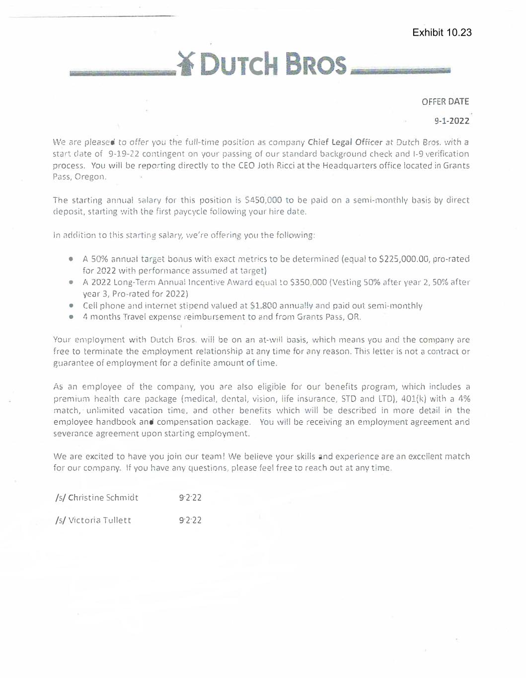 C OFFER DATE 9-1-2022 We are pleased to offer you th.e full-time position as company Chief legal Officer at Dutch Bros. with a stai-t date of 9-19-2.2 contingent 011 your passing of our standard background check and 1-9 verification process. You will be reporting directly to the CEO Joth Ricci at the Headquarters office located in Grants Pass, Oregon. The starting annual salary for this position is $450,000 to be paid on a semi-iT1onthly basis by direct deposit, starting with the first paycvcle following your hire date. In nddition to this starting salary, we're offerin° you the fol!owing: e A 50% annuai target bonus with exact metrics to be determined (equal to $225,000.00, pro-r·ated for 2022 with performance assumed at target) • A L022 Long-Term Annual Incentive Award equal to $350.000 (Vesting 50% after vear 2, 50% afte1· year 3, Pro-rated for 2022) • Cell phone and internet stipend valued at ... 1.800 annually and paid out semi-monthly o 4 months Travel expense reimbursement to and from Grants Pass, OR. Your employment with Dutch Bros. will be on an at-will basis, vhich means you and the company are free to terminate the employment relationship at any time for any reason. This letter is not a contract or guarantee of ernpioyrnent for a definite amount of time. As an employee of the company, you are also eligible fo:- our benefits program, which includes a premium health care package (medical, dental, vision, life insurance, STD and LTD), 40l(k) with a 4% match,· unlimited vacation time, and other benefits which will be described in more detail in the employee handbook and compensation package. You 1.,vi!i be 1·ecei ing an employment agreement and severnnce agreement upon starting employment. We are excited to have you join our team! We believe your skills and experience are an excelient match for our company If you have any questions .. please feel free to reach out at any time. /s/ Christine Schmidt 9-2-22 /s/ Victoria Tullett 9-2-22 Exhibit 10.23