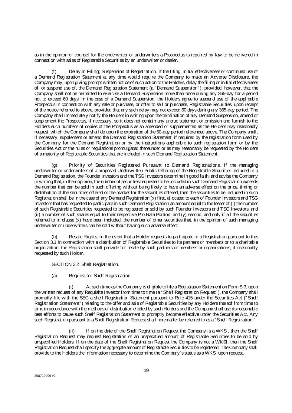 290719096 v2 19 as in the opinion of counsel for the underwriter or underwriters a Prospectus is required by law to be delivered in connection with sales of Registrable Securities by an underwriter or dealer. (f) Delay in Filing; Suspension of Registration. If the filing, initial effectiveness or continued use of a Demand Registration Statement at any time would require the Company to make an Adverse Disclosure, the Company may, upon giving prompt written notice of such action to the Holders, delay the filing or initial effectiveness of, or suspend use of, the Demand Registration Statement (a “Demand Suspension”); provided, however, that the Company shall not be permitted to exercise a Demand Suspension more than once during any 365-day for a period not to exceed 60 days. In the case of a Demand Suspension, the Holders agree to suspend use of the applicable Prospectus in connection with any sale or purchase, or offer to sell or purchase, Registrable Securities, upon receipt of the notice referred to above, provided that any such delay may not exceed 60 days during any 365-day period. The Company shall immediately notify the Holders in writing upon the termination of any Demand Suspension, amend or supplement the Prospectus, if necessary, so it does not contain any untrue statement or omission and furnish to the Holders such numbers of copies of the Prospectus as so amended or supplemented as the Holders may reasonably request, which the Company shall do upon the expiration of the 60-day period referenced above. The Company shall, if necessary, supplement or amend the Demand Registration Statement, if required by the registration form used by the Company for the Demand Registration or by the instructions applicable to such registration form or by the Securities Act or the rules or regulations promulgated thereunder or as may reasonably be requested by the Holders of a majority of Registrable Securities that are included in such Demand Registration Statement. (g) Priority of Securities Registered Pursuant to Demand Registrations. If the managing underwriter or underwriters of a proposed Underwritten Public Offering of the Registrable Securities included in a Demand Registration, the Founder Investors and the TSG Investors determine in good faith, and advise the Company in writing that, in their opinion, the number of securities requested to be included in such Demand Registration exceeds the number that can be sold in such offering without being likely to have an adverse effect on the price, timing or distribution of the securities offered or the market for the securities offered, then the securities to be included in such Registration shall be in the case of any Demand Registration (x) first, allocated to each of Founder Investors and TSG Investors that has requested to participate in such Demand Registration an amount equal to the lesser of (i) the number of such Registrable Securities requested to be registered or sold by such Founder Investors and TSG Investors, and (ii) a number of such shares equal to their respective Pro Rata Portion, and (y) second, and only if all the securities referred to in clause (x) have been included, the number of other securities that, in the opinion of such managing underwriter or underwriters can be sold without having such adverse effect. (h) Resale Rights. In the event that a Holder requests to participate in a Registration pursuant to this Section 3.1 in connection with a distribution of Registrable Securities to its partners or members or to a charitable organization, the Registration shall provide for resale by such partners or members or organizations, if reasonably requested by such Holder. SECTION 3.2 Shelf Registration. (a) Request for Shelf Registration. (i) At such time as the Company is eligible to file a Registration Statement on Form S-3, upon the written request of any Requisite Investor from time to time (a “Shelf Registration Request”), the Company shall promptly file with the SEC a shelf Registration Statement pursuant to Rule 415 under the Securities Act (“Shelf Registration Statement”) relating to the offer and sale of Registrable Securities by any Holders thereof from time to time in accordance with the methods of distribution elected by such Holders and the Company shall use its reasonable best efforts to cause such Shelf Registration Statement to promptly become effective under the Securities Act. Any such Registration pursuant to a Shelf Registration Request shall hereinafter be referred to as a “Shelf Registration.” (ii) If on the date of the Shelf Registration Request the Company is a WKSI, then the Shelf Registration Request may request Registration of an unspecified amount of Registrable Securities to be sold by unspecified Holders. If on the date of the Shelf Registration Request the Company is not a WKSI, then the Shelf Registration Request shall specify the aggregate amount of Registrable Securities to be registered. The Company shall provide to the Holders the information necessary to determine the Company’s status as a WKSI upon request.