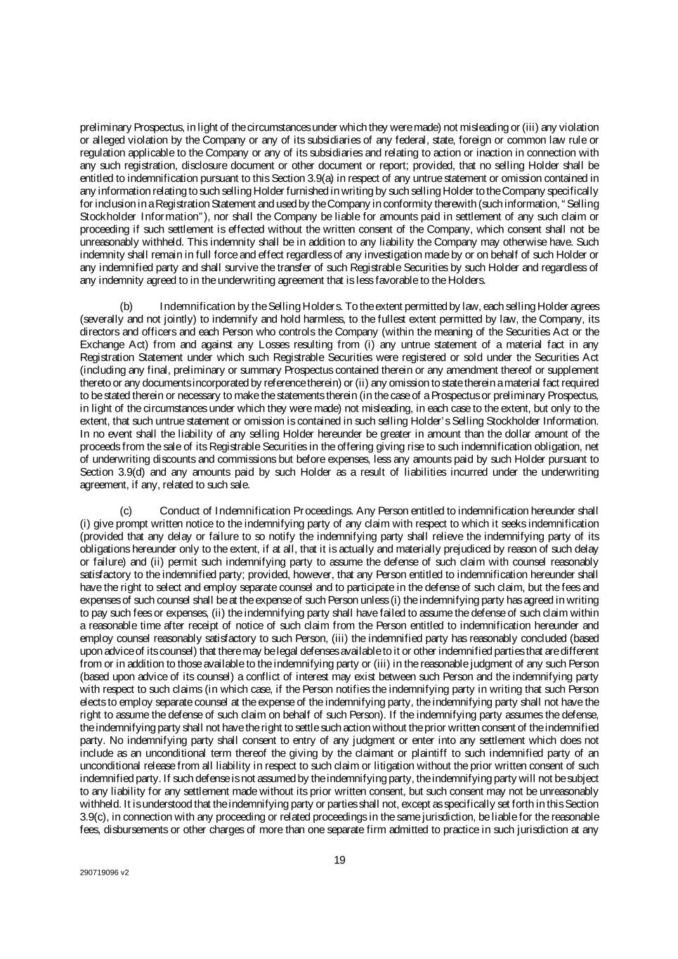 290719096 v2 19 preliminary Prospectus, in light of the circumstances under which they were made) not misleading or (iii) any violation or alleged violation by the Company or any of its subsidiaries of any federal, state, foreign or common law rule or regulation applicable to the Company or any of its subsidiaries and relating to action or inaction in connection with any such registration, disclosure document or other document or report; provided, that no selling Holder shall be entitled to indemnification pursuant to this Section 3.9(a) in respect of any untrue statement or omission contained in any information relating to such selling Holder furnished in writing by such selling Holder to the Company specifically for inclusion in a Registration Statement and used by the Company in conformity therewith (such information, “Selling Stockholder Information”), nor shall the Company be liable for amounts paid in settlement of any such claim or proceeding if such settlement is effected without the written consent of the Company, which consent shall not be unreasonably withheld. This indemnity shall be in addition to any liability the Company may otherwise have. Such indemnity shall remain in full force and effect regardless of any investigation made by or on behalf of such Holder or any indemnified party and shall survive the transfer of such Registrable Securities by such Holder and regardless of any indemnity agreed to in the underwriting agreement that is less favorable to the Holders. (b) Indemnification by the Selling Holders. To the extent permitted by law, each selling Holder agrees (severally and not jointly) to indemnify and hold harmless, to the fullest extent permitted by law, the Company, its directors and officers and each Person who controls the Company (within the meaning of the Securities Act or the Exchange Act) from and against any Losses resulting from (i) any untrue statement of a material fact in any Registration Statement under which such Registrable Securities were registered or sold under the Securities Act (including any final, preliminary or summary Prospectus contained therein or any amendment thereof or supplement thereto or any documents incorporated by reference therein) or (ii) any omission to state therein a material fact required to be stated therein or necessary to make the statements therein (in the case of a Prospectus or preliminary Prospectus, in light of the circumstances under which they were made) not misleading, in each case to the extent, but only to the extent, that such untrue statement or omission is contained in such selling Holder’s Selling Stockholder Information. In no event shall the liability of any selling Holder hereunder be greater in amount than the dollar amount of the proceeds from the sale of its Registrable Securities in the offering giving rise to such indemnification obligation, net of underwriting discounts and commissions but before expenses, less any amounts paid by such Holder pursuant to Section 3.9(d) and any amounts paid by such Holder as a result of liabilities incurred under the underwriting agreement, if any, related to such sale. (c) Conduct of Indemnification Proceedings. Any Person entitled to indemnification hereunder shall (i) give prompt written notice to the indemnifying party of any claim with respect to which it seeks indemnification (provided that any delay or failure to so notify the indemnifying party shall relieve the indemnifying party of its obligations hereunder only to the extent, if at all, that it is actually and materially prejudiced by reason of such delay or failure) and (ii) permit such indemnifying party to assume the defense of such claim with counsel reasonably satisfactory to the indemnified party; provided, however, that any Person entitled to indemnification hereunder shall have the right to select and employ separate counsel and to participate in the defense of such claim, but the fees and expenses of such counsel shall be at the expense of such Person unless (i) the indemnifying party has agreed in writing to pay such fees or expenses, (ii) the indemnifying party shall have failed to assume the defense of such claim within a reasonable time after receipt of notice of such claim from the Person entitled to indemnification hereunder and employ counsel reasonably satisfactory to such Person, (iii) the indemnified party has reasonably concluded (based upon advice of its counsel) that there may be legal defenses available to it or other indemnified parties that are different from or in addition to those available to the indemnifying party or (iii) in the reasonable judgment of any such Person (based upon advice of its counsel) a conflict of interest may exist between such Person and the indemnifying party with respect to such claims (in which case, if the Person notifies the indemnifying party in writing that such Person elects to employ separate counsel at the expense of the indemnifying party, the indemnifying party shall not have the right to assume the defense of such claim on behalf of such Person). If the indemnifying party assumes the defense, the indemnifying party shall not have the right to settle such action without the prior written consent of the indemnified party. No indemnifying party shall consent to entry of any judgment or enter into any settlement which does not include as an unconditional term thereof the giving by the claimant or plaintiff to such indemnified party of an unconditional release from all liability in respect to such claim or litigation without the prior written consent of such indemnified party. If such defense is not assumed by the indemnifying party, the indemnifying party will not be subject to any liability for any settlement made without its prior written consent, but such consent may not be unreasonably withheld. It is understood that the indemnifying party or parties shall not, except as specifically set forth in this Section 3.9(c), in connection wi