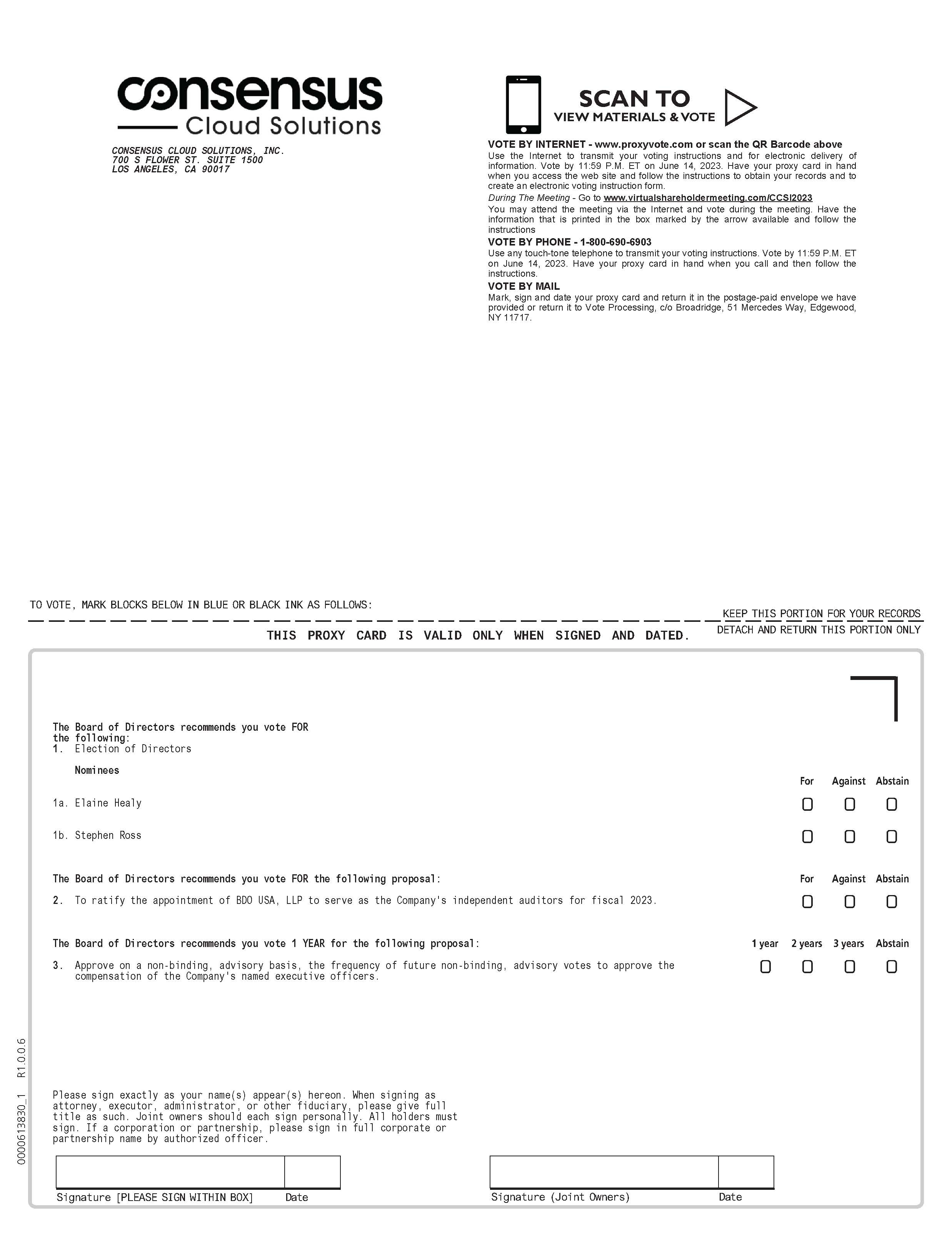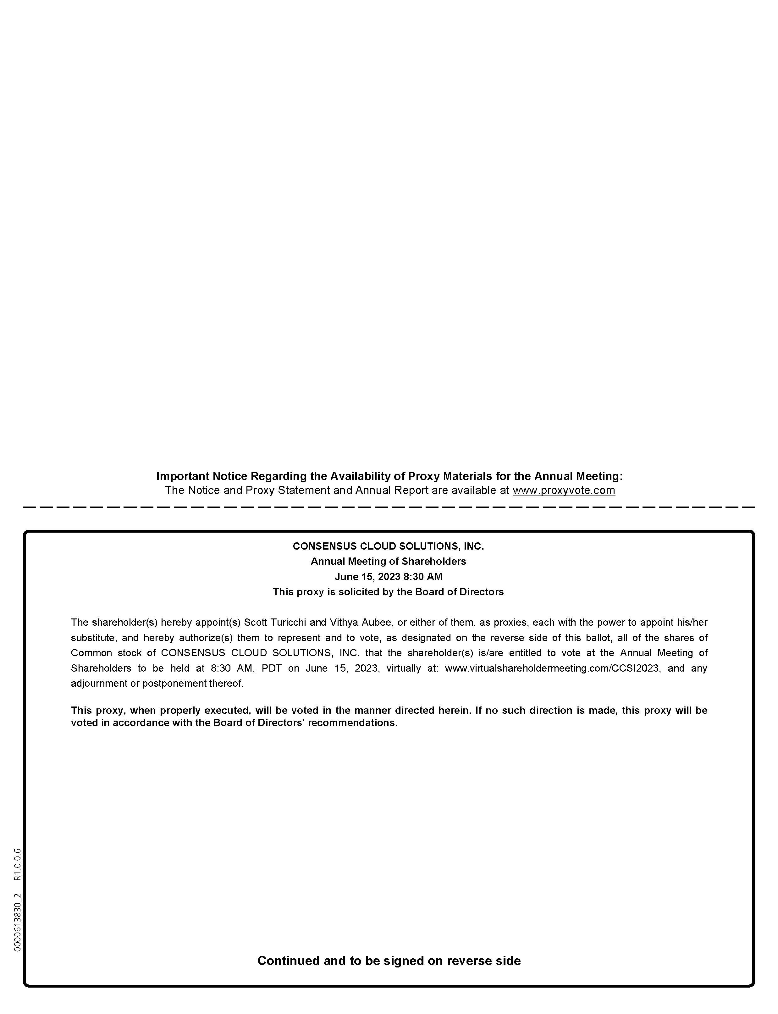 This document includes forward-looking statements within the meaning of the Private Securities Litigation Reform Act of 1995. All statements other than statements of historical or current facts, including statements regarding our environmental and other sustainability plans and goals, made in this document are forward-looking. We use words such as anticipates, believes, expects, future, intends, and similar expressions to identify forward-looking statements. Forward-looking statements reflect management’s current expectations and are inherently uncertain. Actual results could differ materially for a variety of reasons. Risks and uncertainties that could cause our actual results to differ significantly from management’s expectations are described in our 2022 Annual Report on Form 10-K. Website references throughout this document are provided for convenience only, and the content on the referenced websites is not incorporated by reference into this document. Unless the context otherwise requires, references in this proxy statement to “Consensus,” “we,” “us,” “our,” “our company” and “the Company” refer to Consensus Cloud Solutions, Inc. |