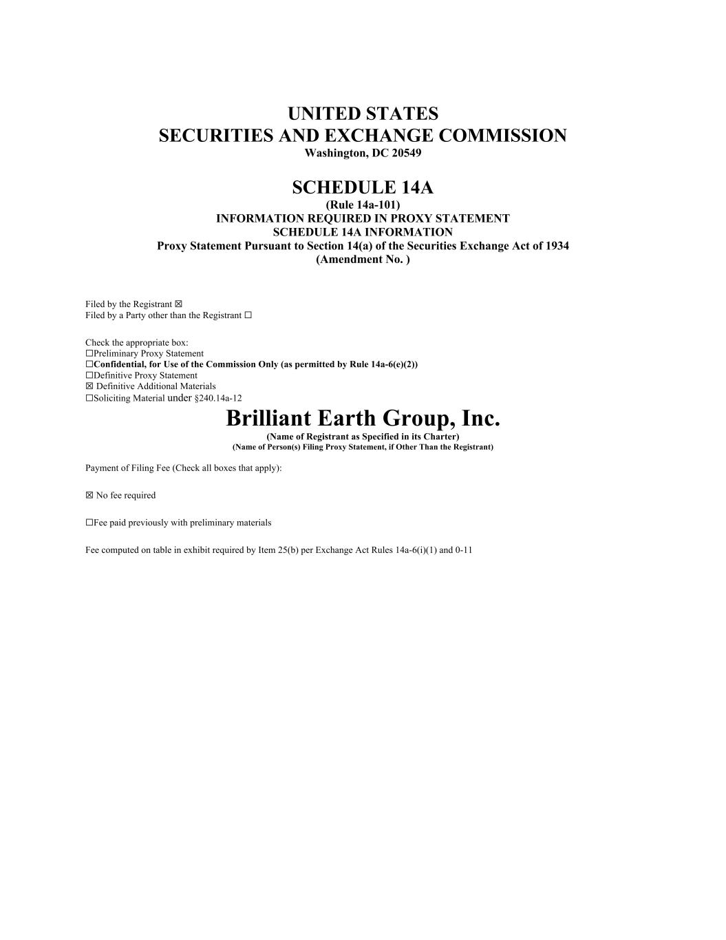 UNITED STATES SECURITIES AND EXCHANGE COMMISSION Washington, DC 20549 SCHEDULE 14A (Rule 14a-101) INFORMATION REQUIRED IN PROXY STATEMENT SCHEDULE 14A INFORMATION Proxy Statement Pursuant to Section 14(a) of the Securities Exchange Act of 1934 (Amendment No. ) Filed by the Registrant ☒ Filed by a Party other than the Registrant ☐ Check the appropriate box: ☐Preliminary Proxy Statement ☐Confidential, for Use of the Commission Only (as permitted by Rule 14a-6(e)(2)) ☐Definitive Proxy Statement ☒ Definitive Additional Materials ☐Soliciting Material under §240.14a-12 Brilliant Earth Group, Inc. (Name of Registrant as Specified in its Charter) (Name of Person(s) Filing Proxy Statement, if Other Than the Registrant) Payment of Filing Fee (Check all boxes that apply): ☒ No fee required ☐Fee paid previously with preliminary materials Fee computed on table in exhibit required by Item 25(b) per Exchange Act Rules 14a-6(i)(1) and 0-11