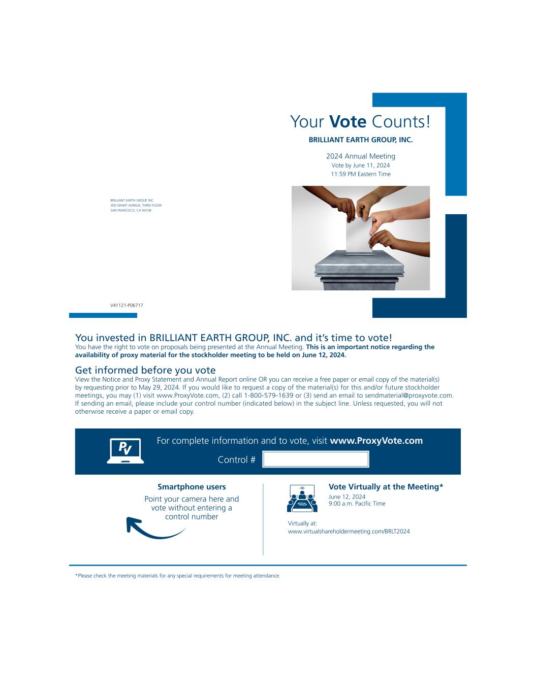 Your Vote Counts! *Please check the meeting materials for any special requirements for meeting attendance. Smartphone users Point your camera here and vote without entering a control number For complete information and to vote, visit www.ProxyVote.com Control # V41121-P06717 BRILLIANT EARTH GROUP, INC. 2024 Annual Meeting Vote by June 11, 2024 11:59 PM Eastern Time BRILLIANT EARTH GROUP, INC. 300 GRANT AVENUE, THIRD FLOOR SAN FRANCISCO, CA 94108 You invested in BRILLIANT EARTH GROUP, INC. and it’s time to vote! You have the right to vote on proposals being presented at the Annual Meeting. This is an important notice regarding the availability of proxy material for the stockholder meeting to be held on June 12, 2024. Get informed before you vote View the Notice and Proxy Statement and Annual Report online OR you can receive a free paper or email copy of the material(s) by requesting prior to May 29, 2024. If you would like to request a copy of the material(s) for this and/or future stockholder meetings, you may (1) visit www.ProxyVote.com, (2) call 1-800-579-1639 or (3) send an email to sendmaterial@proxyvote.com. If sending an email, please include your control number (indicated below) in the subject line. Unless requested, you will not otherwise receive a paper or email copy. Vote Virtually at the Meeting* June 12, 2024 9:00 a.m. Pacific Time Virtually at: www.virtualshareholdermeeting.com/BRLT2024