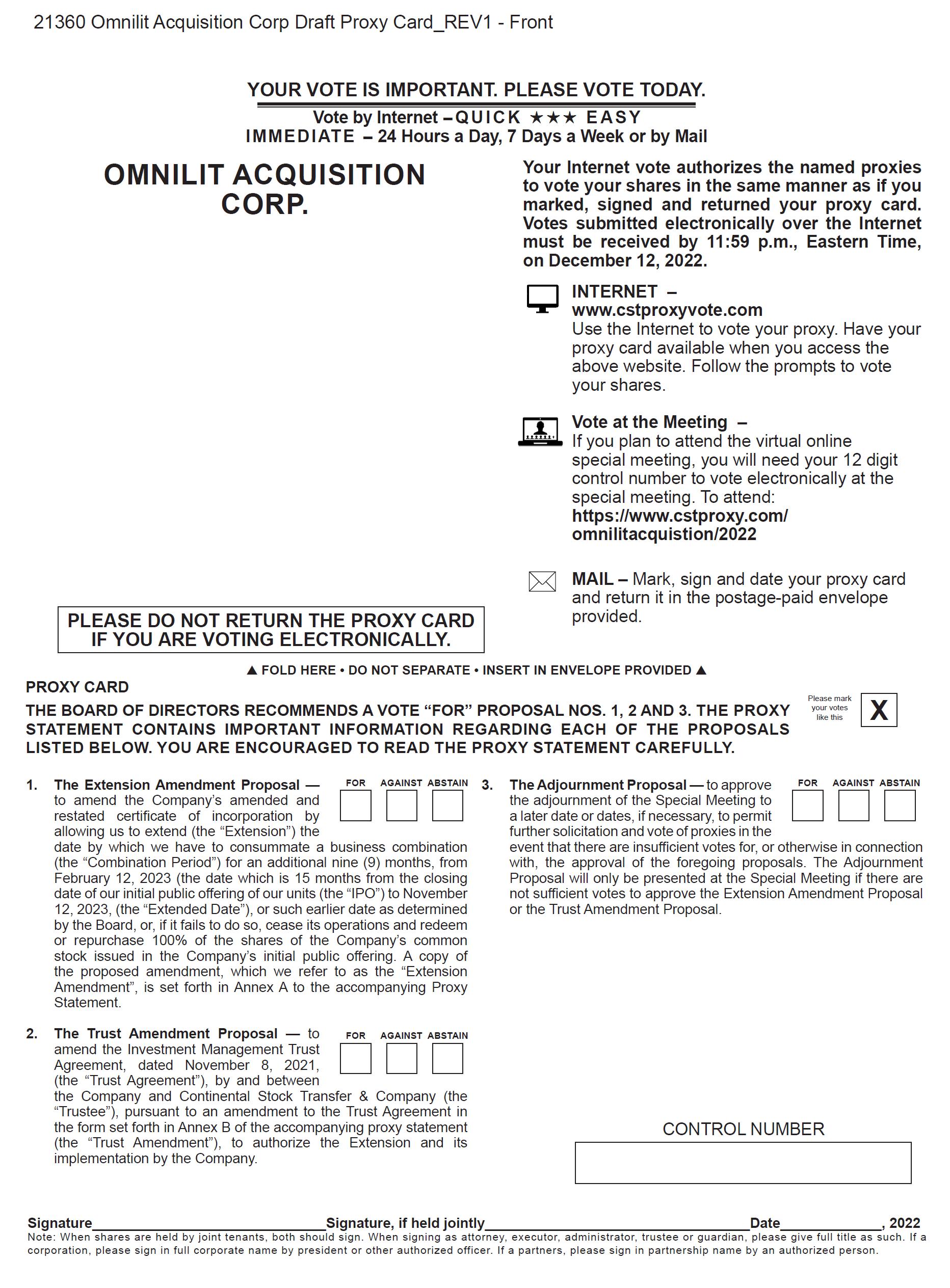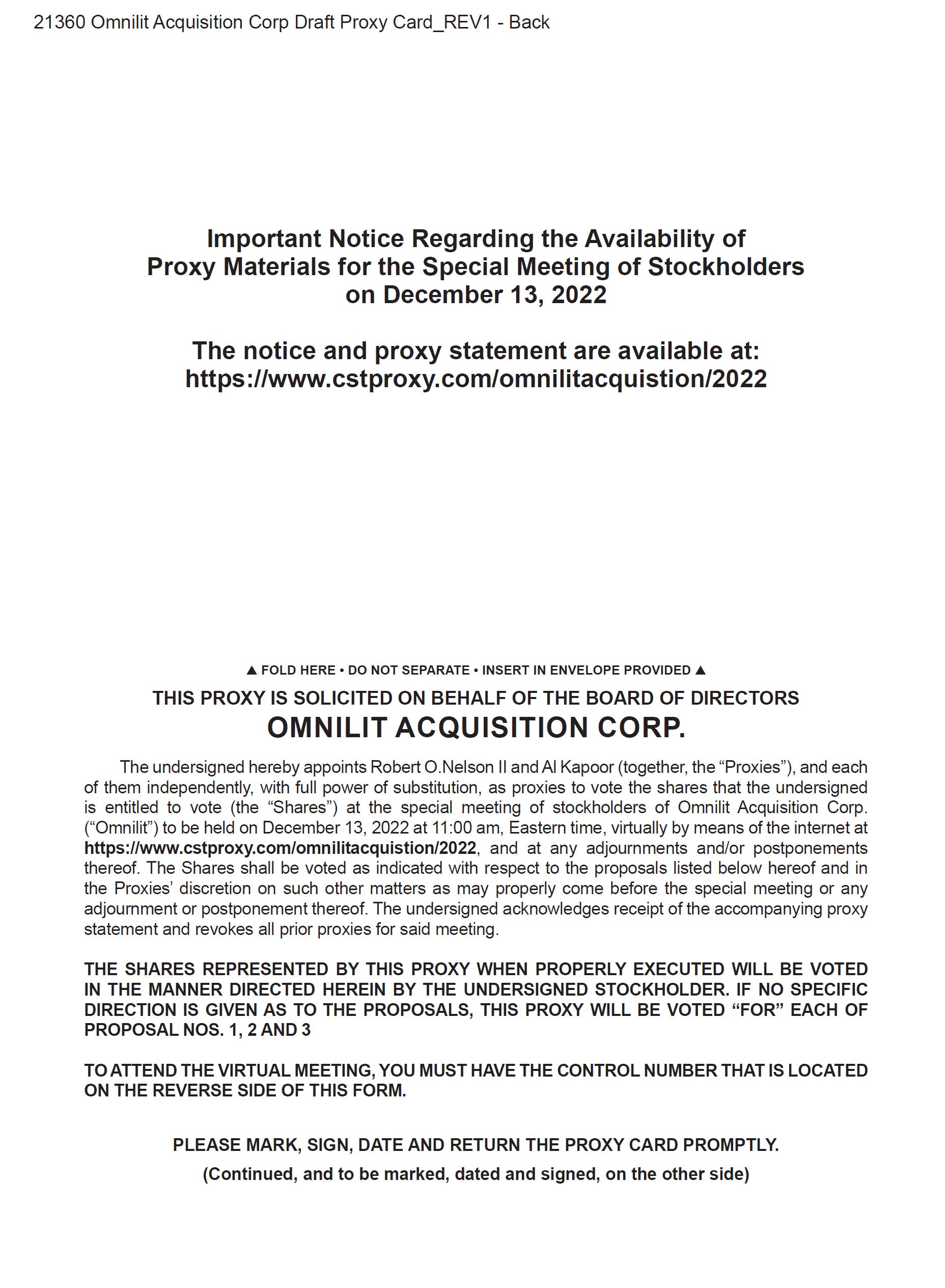 Important Notice Regarding the Availability of Proxy Materials for the Special Meeting of Stockholders to be held on December 13, 2022: This notice of meeting and the accompanying Proxy Statement are available at www.cstproxy.com/omnilitacquistion/2022.