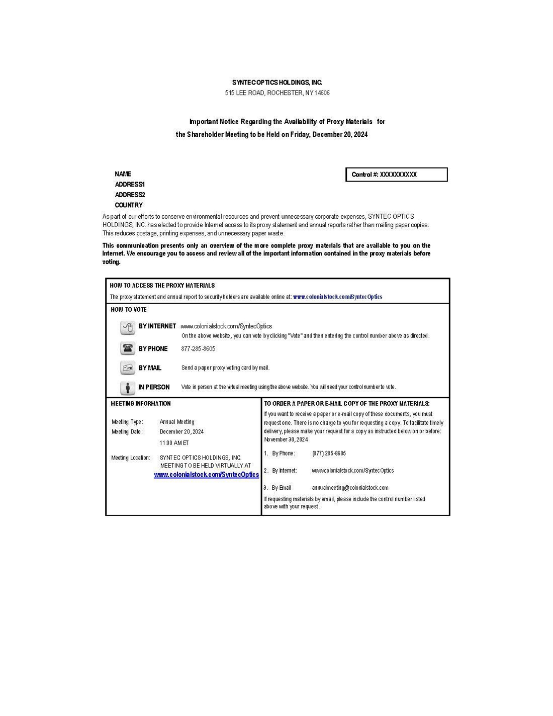 You are cordially invited to attend the Annual Meeting via live webcast by visiting https://www.colonialstock.com/syntecoptics. To be sure your vote is counted and assure a quorum is present, it is important that you vote your shares regardless of the number of shares you own. The Board of Directors urges you to vote over the Internet by going to https://www.colonialstock.com/syntecoptics or by telephone by calling Colonial Stock Transfer Company, Inc. at (801) 355-5740 or to sign, date and mark the proxy card promptly and return it to Syntec Optics Holdings, Inc. Voting over the Internet or by telephone or by returning the proxy card will not prevent you from voting at the virtual Annual Meeting. Under Securities and Exchange Commission rules, we are providing access to our proxy materials both by sending you this full set of proxy materials, and by notifying you of the availability of our proxy materials on the Internet.