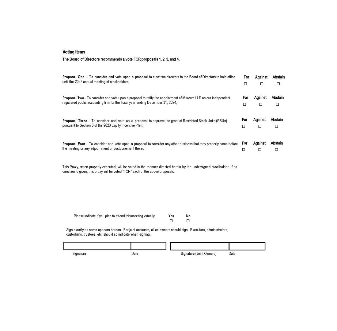 Under the applicable rules governing such brokers, we believe Proposal 2 to ratify the appointment of Marcum LLP as our independent registered public accounting firm, is likely to be considered a “routine” item. This means that brokers may vote using their discretion on such proposal on behalf of beneficial owners who have not furnished voting instructions. In contrast, certain items are considered “non-routine”, and a “broker non-vote” occurs when brokers do not receive voting instructions from beneficial owners with respect to such items because the brokers are not entitled to vote such uninstructed shares. We believe Proposal 1 to elect two directors to the Board of Directors to hold office until the 2027 annual meeting of stockholders and Proposal 3 to grant the RSUs under the 2023 Equity Incentive Plan is likely to be considered “non-routine”, which means that brokers cannot vote your uninstructed shares when they do not receive voting instructions from you. Furthermore, if approval of Proposal 2 is deemed by the Nasdaq to be “non-routine” matters, brokers will not be permitted to vote on Proposals 2, if the broker has not received instructions from the beneficial owner. Accordingly, it is particularly important that beneficial owners instruct their brokers how they wish to vote their shares for these proposals.