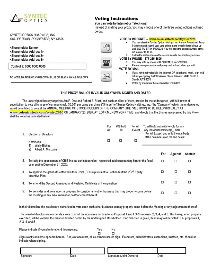 You are cordially invited to attend the 2025 Annual Meeting of Stockholders of Syntec Optics Holdings, Inc., or the Annual Meeting, which will be held on Tuesday, January 20, 2026, at 05:00 p.m., Eastern time. This year’s Annual Meeting will be held via the Internet. Stockholders will be able to listen to the meeting live, submit questions and vote online regardless of location via the Internet at www.colonialstock.com/syntec2026. You will be able to attend the Annual Meeting by first registering at www.colonialstock.com/syntec2026. You will receive a meeting invitation by e-mail with your unique join link along with a password prior to the meeting date. You will not be able to attend the Annual Meeting in person.