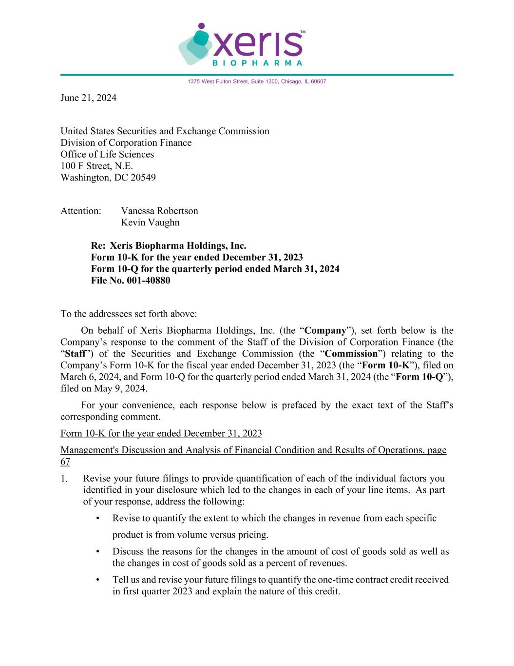 1375 West Fulton Street, Suite 1300, Chicago, IL 60607 June 21, 2024 United States Securities and Exchange Commission Division of Corporation Finance Office of Life Sciences 100 F Street, N.E. Washington, DC 20549 Attention: Vanessa Robertson Kevin Vaughn Re: Xeris Biopharma Holdings, Inc. Form 10-K for the year ended December 31, 2023 Form 10-Q for the quarterly period ended March 31, 2024 File No. 001-40880 To the addressees set forth above: On behalf of Xeris Biopharma Holdings, Inc. (the “Company”), set forth below is the Company’s response to the comment of the Staff of the Division of Corporation Finance (the “Staff”) of the Securities and Exchange Commission (the “Commission”) relating to the Company’s Form 10-K for the fiscal year ended December 31, 2023 (the “Form 10-K”), filed on March 6, 2024, and Form 10-Q for the quarterly period ended March 31, 2024 (the “Form 10-Q”), filed on May 9, 2024. For your convenience, each response below is prefaced by the exact text of the Staff’s corresponding comment. Form 10-K for the year ended December 31, 2023 Management's Discussion and Analysis of Financial Condition and Results of Operations, page 67 1. Revise your future filings to provide quantification of each of the individual factors you identified in your disclosure which led to the changes in each of your line items. As part of your response, address the following: • Revise to quantify the extent to which the changes in revenue from each specific product is from volume versus pricing. • Discuss the reasons for the changes in the amount of cost of goods sold as well as the changes in cost of goods sold as a percent of revenues. • Tell us and revise your future filings to quantify the one-time contract credit received in first quarter 2023 and explain the nature of this credit.