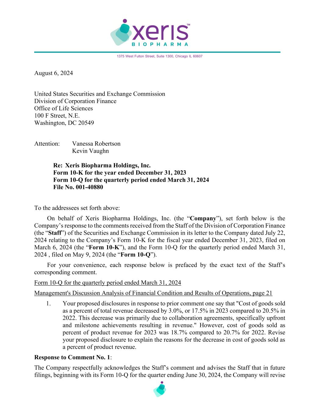 1375 West Fulton Street, Suite 1300, Chicago IL 60607 August 6, 2024 United States Securities and Exchange Commission Division of Corporation Finance Office of Life Sciences 100 F Street, N.E. Washington, DC 20549 Attention: Vanessa Robertson Kevin Vaughn Re: Xeris Biopharma Holdings, Inc. Form 10-K for the year ended December 31, 2023 Form 10-Q for the quarterly period ended March 31, 2024 File No. 001-40880 To the addressees set forth above: On behalf of Xeris Biopharma Holdings, Inc. (the “Company”), set forth below is the Company’s response to the comments received from the Staff of the Division of Corporation Finance (the “Staff”) of the Securities and Exchange Commission in its letter to the Company dated July 22, 2024 relating to the Company’s Form 10-K for the fiscal year ended December 31, 2023, filed on March 6, 2024 (the “Form 10-K”), and the Form 10-Q for the quarterly period ended March 31, 2024 , filed on May 9, 2024 (the “Form 10-Q”). For your convenience, each response below is prefaced by the exact text of the Staff’s corresponding comment. Form 10-Q for the quarterly period ended March 31, 2024 Management's Discussion Analysis of Financial Condition and Results of Operations, page 21 1. Your proposed disclosures in response to prior comment one say that "Cost of goods sold as a percent of total revenue decreased by 3.0%, or 17.5% in 2023 compared to 20.5% in 2022. This decrease was primarily due to collaboration agreements, specifically upfront and milestone achievements resulting in revenue." However, cost of goods sold as percent of product revenue for 2023 was 18.7% compared to 20.7% for 2022. Revise your proposed disclosure to explain the reasons for the decrease in cost of goods sold as a percent of product revenue. Response to Comment No. 1: The Company respectfully acknowledges the Staff’s comment and advises the Staff that in future filings, beginning with its Form 10-Q for the quarter ending June 30, 2024, the Company will revise