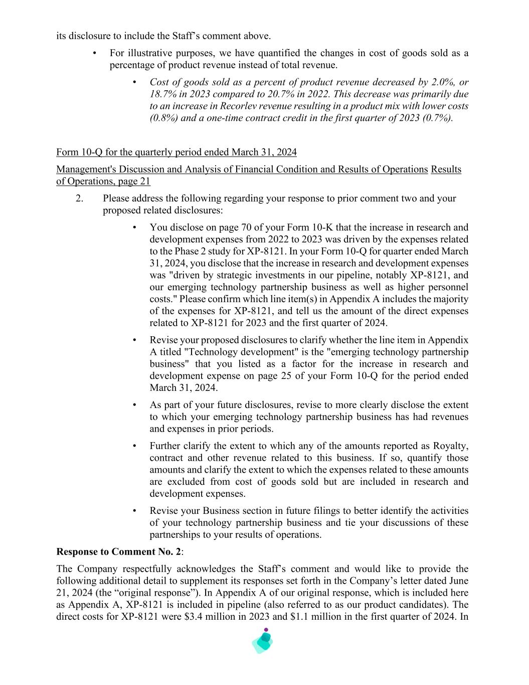 its disclosure to include the Staff’s comment above. • For illustrative purposes, we have quantified the changes in cost of goods sold as a percentage of product revenue instead of total revenue. • Cost of goods sold as a percent of product revenue decreased by 2.0%, or 18.7% in 2023 compared to 20.7% in 2022. This decrease was primarily due to an increase in Recorlev revenue resulting in a product mix with lower costs (0.8%) and a one-time contract credit in the first quarter of 2023 (0.7%). Form 10-Q for the quarterly period ended March 31, 2024 Management's Discussion and Analysis of Financial Condition and Results of Operations Results of Operations, page 21 2. Please address the following regarding your response to prior comment two and your proposed related disclosures: • You disclose on page 70 of your Form 10-K that the increase in research and development expenses from 2022 to 2023 was driven by the expenses related to the Phase 2 study for XP-8121. In your Form 10-Q for quarter ended March 31, 2024, you disclose that the increase in research and development expenses was "driven by strategic investments in our pipeline, notably XP-8121, and our emerging technology partnership business as well as higher personnel costs." Please confirm which line item(s) in Appendix A includes the majority of the expenses for XP-8121, and tell us the amount of the direct expenses related to XP-8121 for 2023 and the first quarter of 2024. • Revise your proposed disclosures to clarify whether the line item in Appendix A titled "Technology development" is the "emerging technology partnership business" that you listed as a factor for the increase in research and development expense on page 25 of your Form 10-Q for the period ended March 31, 2024. • As part of your future disclosures, revise to more clearly disclose the extent to which your emerging technology partnership business has had revenues and expenses in prior periods. • Further clarify the extent to which any of the amounts reported as Royalty, contract and other revenue related to this business. If so, quantify those amounts and clarify the extent to which the expenses related to these amounts are excluded from cost of goods sold but are included in research and development expenses. • Revise your Business section in future filings to better identify the activities of your technology partnership business and tie your discussions of these partnerships to your results of operations. Response to Comment No. 2: The Company respectfully acknowledges the Staff’s comment and would like to provide the following additional detail to supplement its responses set forth in the Company’s letter dated June 21, 2024 (the “original response”). In Appendix A of our original response, which is included here as Appendix A, XP-8121 is included in pipeline (also referred to as our product candidates). The direct costs for XP-8121 were $3.4 million in 2023 and $1.1 million in the first quarter of 2024. In