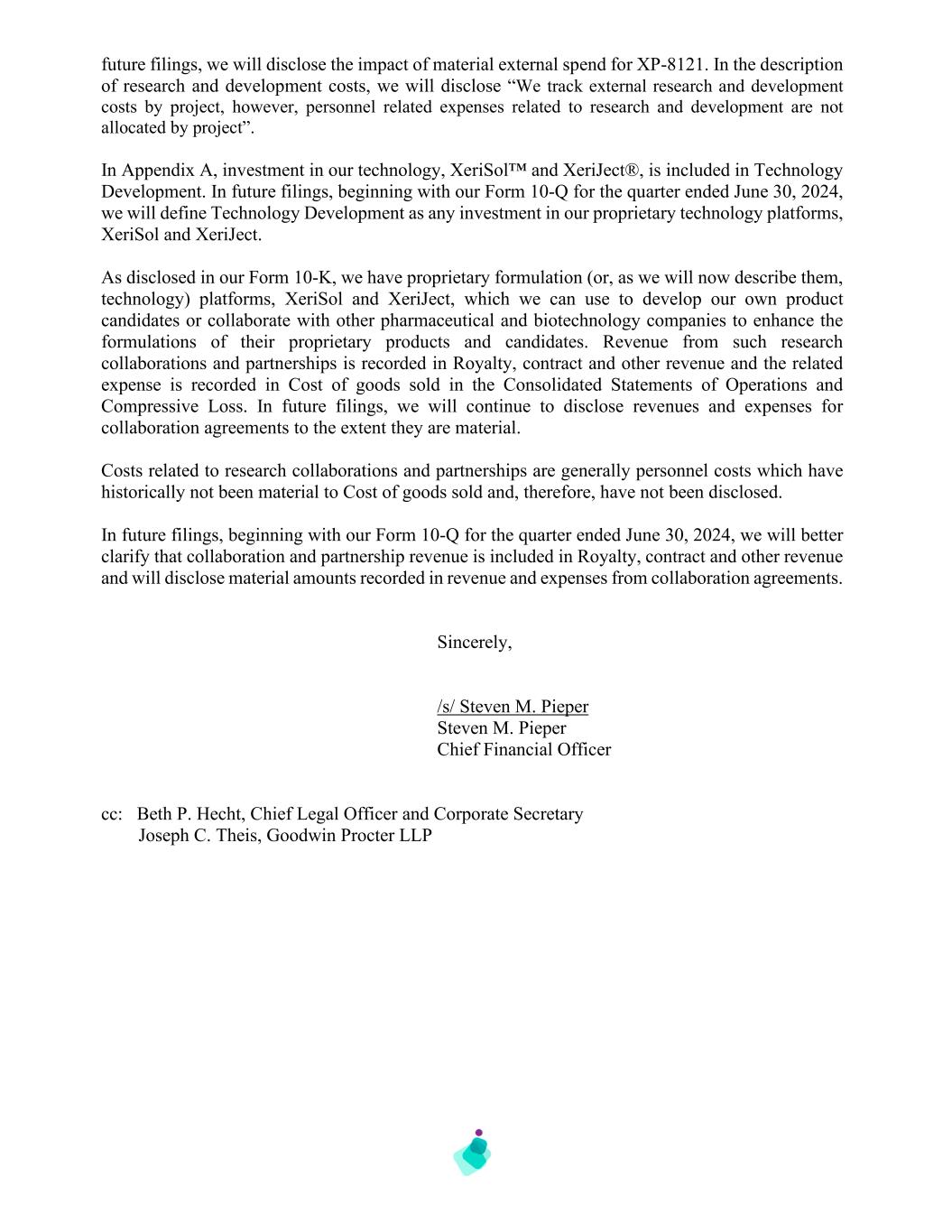 future filings, we will disclose the impact of material external spend for XP-8121. In the description of research and development costs, we will disclose “We track external research and development costs by project, however, personnel related expenses related to research and development are not allocated by project”. In Appendix A, investment in our technology, XeriSol™ and XeriJect®, is included in Technology Development. In future filings, beginning with our Form 10-Q for the quarter ended June 30, 2024, we will define Technology Development as any investment in our proprietary technology platforms, XeriSol and XeriJect. As disclosed in our Form 10-K, we have proprietary formulation (or, as we will now describe them, technology) platforms, XeriSol and XeriJect, which we can use to develop our own product candidates or collaborate with other pharmaceutical and biotechnology companies to enhance the formulations of their proprietary products and candidates. Revenue from such research collaborations and partnerships is recorded in Royalty, contract and other revenue and the related expense is recorded in Cost of goods sold in the Consolidated Statements of Operations and Compressive Loss. In future filings, we will continue to disclose revenues and expenses for collaboration agreements to the extent they are material. Costs related to research collaborations and partnerships are generally personnel costs which have historically not been material to Cost of goods sold and, therefore, have not been disclosed. In future filings, beginning with our Form 10-Q for the quarter ended June 30, 2024, we will better clarify that collaboration and partnership revenue is included in Royalty, contract and other revenue and will disclose material amounts recorded in revenue and expenses from collaboration agreements. Sincerely, /s/ Steven M. Pieper Steven M. Pieper Chief Financial Officer cc: Beth P. Hecht, Chief Legal Officer and Corporate Secretary Joseph C. Theis, Goodwin Procter LLP