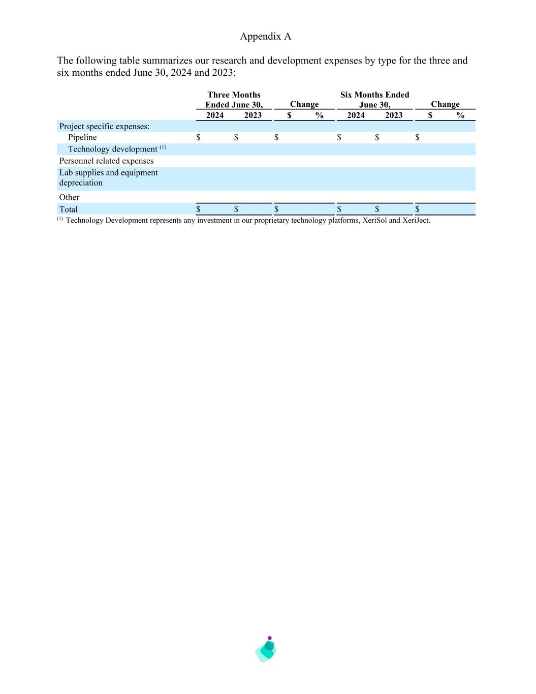 Appendix A The following table summarizes our research and development expenses by type for the three and six months ended June 30, 2024 and 2023: Three Months Ended June 30, Change Six Months Ended June 30, Change 2024 2023 $ % 2024 2023 $ % Project specific expenses: Pipeline $ $ $ $ $ $ Technology development (1) Personnel related expenses Lab supplies and equipment depreciation Other Total $ $ $ $ $ $ (1) Technology Development represents any investment in our proprietary technology platforms, XeriSol and XeriJect.