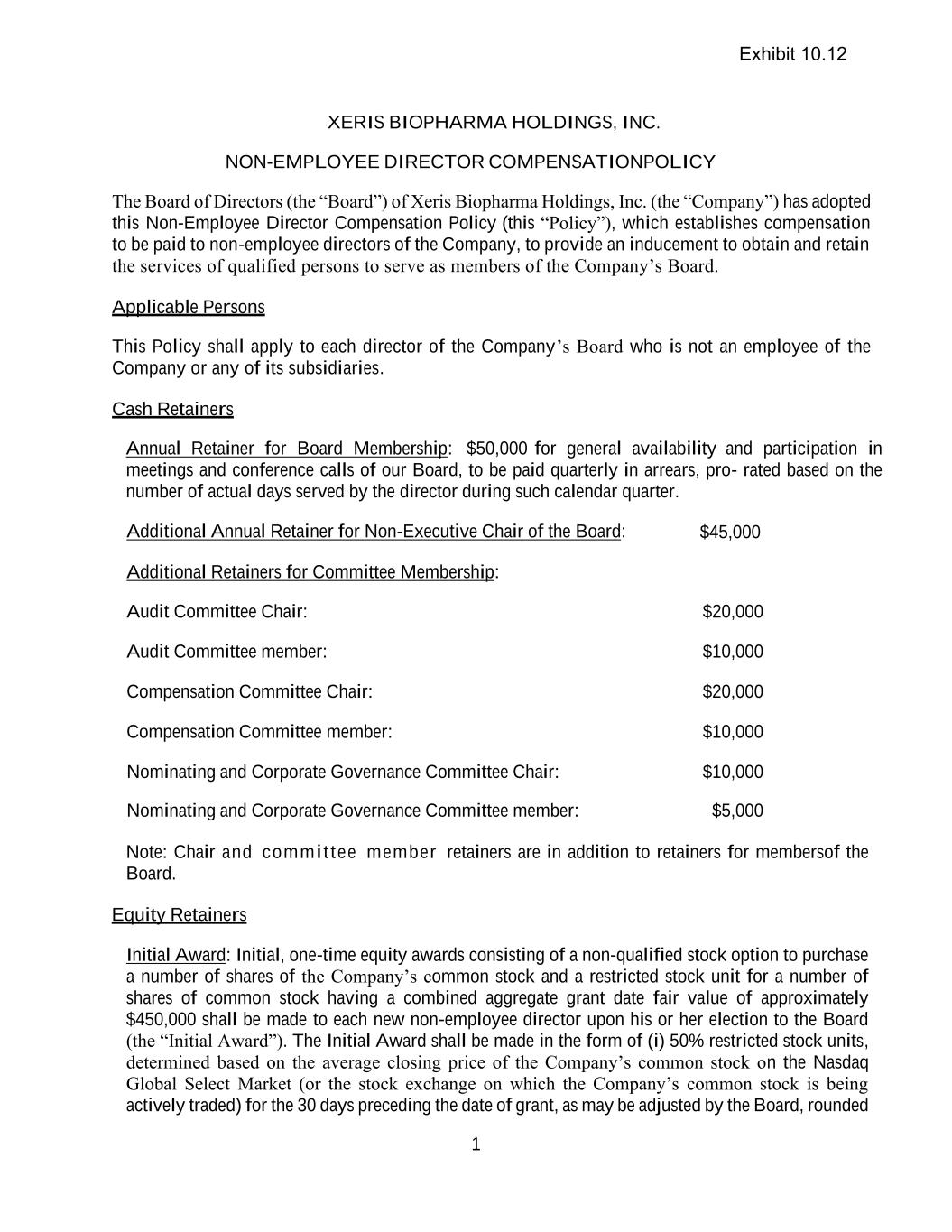 1 XERIS BIOPHARMA HOLDINGS, INC. NON-EMPLOYEE DIRECTOR COMPENSATION POLICY The Board of Directors (the “Board”) of Xeris Biopharma Holdings, Inc. (the “Company”) has adopted this Non-Employee Director Compensation Policy (this “Policy”), which establishes compensation to be paid to non-employee directors of the Company, to provide an inducement to obtain and retain the services of qualified persons to serve as members of the Company’s Board. Applicable Persons This Policy shall apply to each director of the Company’s Board who is not an employee of the Company or any of its subsidiaries. Cash Retainers Annual Retainer for Board Membership: $50,000 for general availability and participation in meetings and conference calls of our Board, to be paid quarterly in arrears, pro- rated based on the number of actual days served by the director during such calendar quarter. Additional Annual Retainer for Non-Executive Chair of the Board: $45,000 Additional Retainers for Committee Membership: Audit Committee Chair: $20,000 Audit Committee member: $10,000 Compensation Committee Chair: $20,000 Compensation Committee member: $10,000 Nominating and Corporate Governance Committee Chair: $10,000 Nominating and Corporate Governance Committee member: $5,000 Note: Chair and commit tee member retainers are in addition to retainers for members of the Board. Equity Retainers Initial Award: Initial, one-time equity awards consisting of a non-qualified stock option to purchase a number of shares of the Company’s common stock and a restricted stock unit for a number of shares of common stock having a combined aggregate grant date fair value of approximately $450,000 shall be made to each new non-employee director upon his or her election to the Board (the “Initial Award”). The Initial Award shall be made in the form of (i) 50% restricted stock units, determined based on the average closing price of the Company’s common stock on the Nasdaq Global Select Market (or the stock exchange on which the Company’s common stock is being actively traded) for the 30 days preceding the date of grant, as may be adjusted by the Board, rounded Exhibit 10.12
