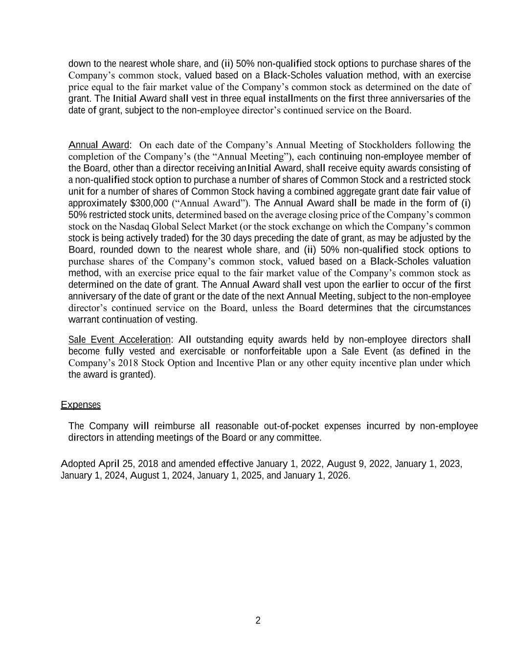 2 down to the nearest whole share, and (ii) 50% non-qualified stock options to purchase shares of the Company’s common stock, valued based on a Black-Scholes valuation method, with an exercise price equal to the fair market value of the Company’s common stock as determined on the date of grant. The Initial Award shall vest in three equal installments on the first three anniversaries of the date of grant, subject to the non-employee director’s continued service on the Board. Annual Award: On each date of the Company’s Annual Meeting of Stockholders following the completion of the Company’s (the “Annual Meeting”), each continuing non-employee member of the Board, other than a director receiving an Initial Award, shall receive equity awards consisting of a non-qualified stock option to purchase a number of shares of Common Stock and a restricted stock unit for a number of shares of Common Stock having a combined aggregate grant date fair value of approximately $300,000 (“Annual Award”). The Annual Award shall be made in the form of (i) 50% restricted stock units, determined based on the average closing price of the Company’s common stock on the Nasdaq Global Select Market (or the stock exchange on which the Company’s common stock is being actively traded) for the 30 days preceding the date of grant, as may be adjusted by the Board, rounded down to the nearest whole share, and (ii) 50% non-qualified stock options to purchase shares of the Company’s common stock, valued based on a Black-Scholes valuation method, with an exercise price equal to the fair market value of the Company’s common stock as determined on the date of grant. The Annual Award shall vest upon the earlier to occur of the first anniversary of the date of grant or the date of the next Annual Meeting, subject to the non-employee director’s continued service on the Board, unless the Board determines that the circumstances warrant continuation of vesting. Sale Event Acceleration: All outstanding equity awards held by non-employee directors shall become fully vested and exercisable or nonforfeitable upon a Sale Event (as defined in the Company’s 2018 Stock Option and Incentive Plan or any other equity incentive plan under which the award is granted). Expenses The Company will reimburse all reasonable out-of-pocket expenses incurred by non- employee directors in attending meetings of the Board or any committee. Adopted April 25, 2018 and amended effective January 1, 2022, August 9, 2022, January 1, 2023, January 1, 2024, August 1, 2024, January 1, 2025, and January 1, 2026.