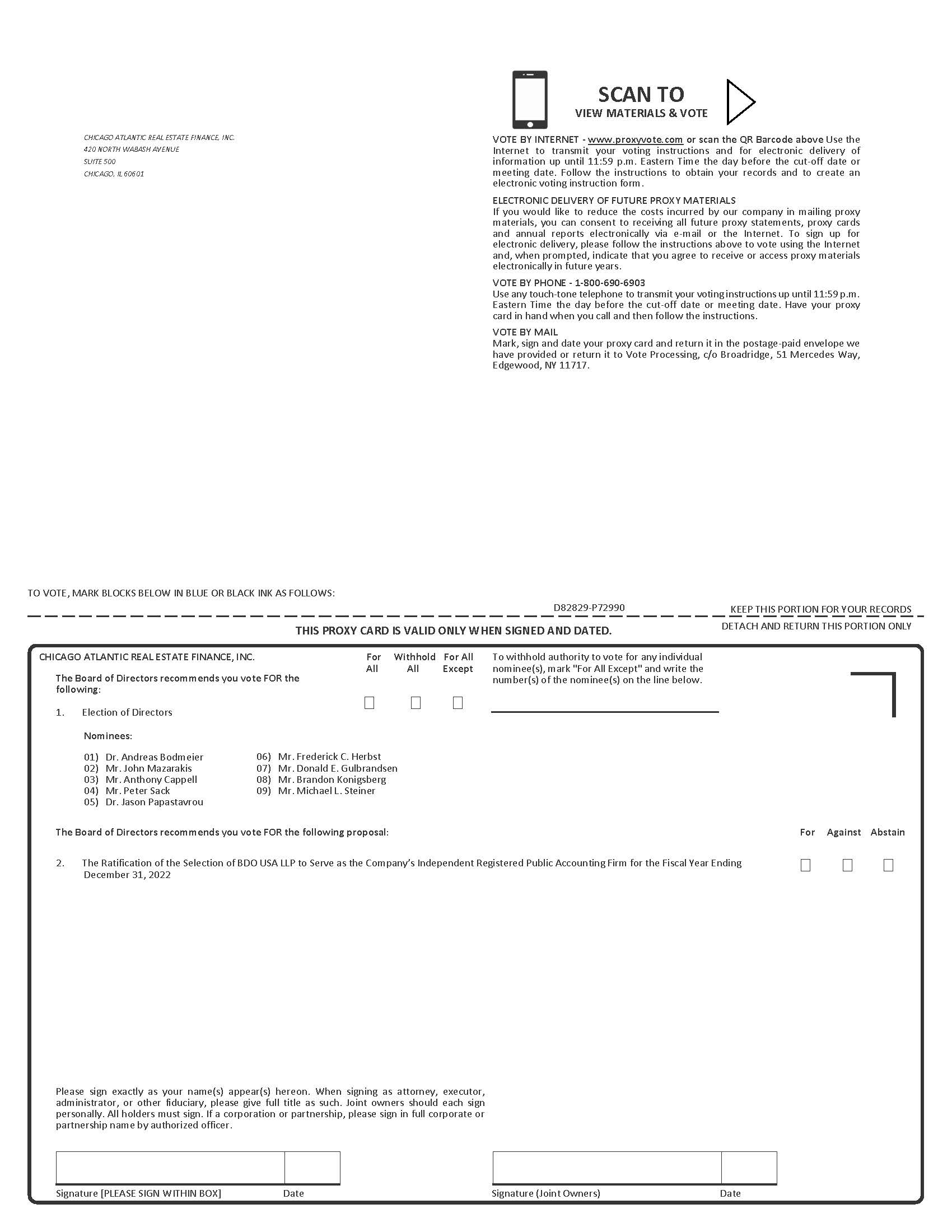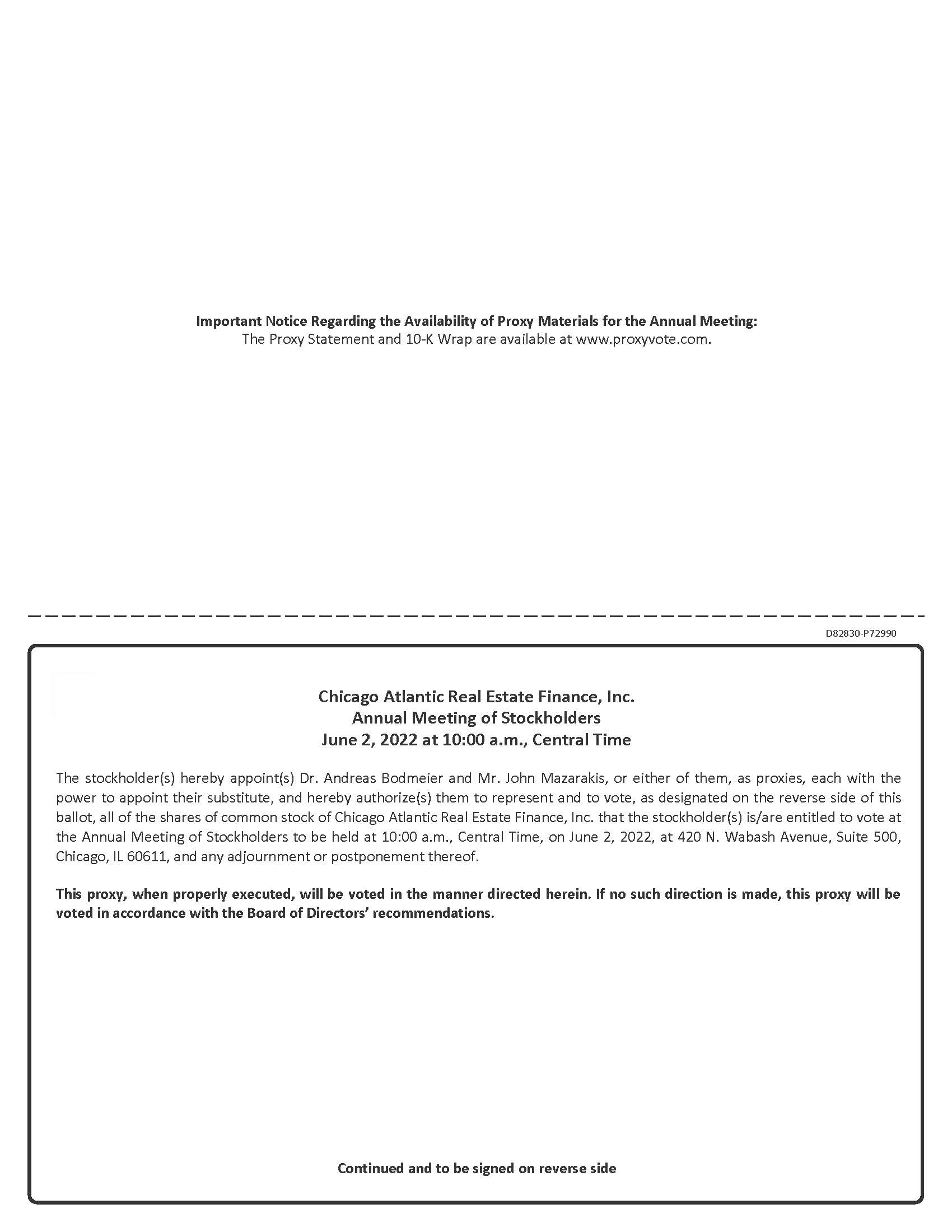 You are cordially invited to attend the 2022 Annual Meeting of Stockholders (the “Annual Meeting”) of Chicago Atlantic Real Estate Finance, Inc. (the “Company”) to be held on June 2, 2022 at 10:00 a.m., Central Time, at the office of the Company, 420 North Wabash Avenue, Suite 500, Chicago, IL 60611.