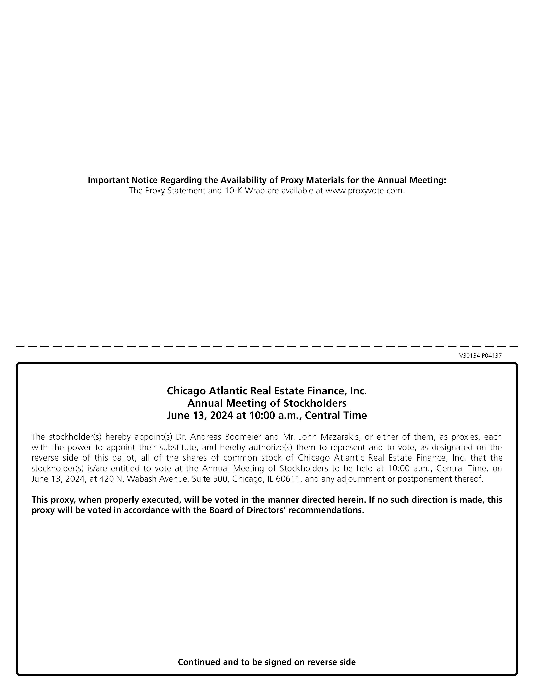 Important Notice Regarding the Availability of Proxy Materials for the Annual Meeting: The Proxy Statement and 10-K Wrap are available at www.proxyvote.com. V30134-P04137 Chicago Atlantic Real Estate Finance, Inc. Annual Meeting of Stockholders June 13, 2024 at 10:00 a.m., Central Time The stockholder(s) hereby appoint(s) Dr. Andreas Bodmeier and Mr. John Mazarakis, or either of them, as proxies, each with the power to appoint their substitute, and hereby authorize(s) them to represent and to vote, as designated on the reverse side of this ballot, all of the shares of common stock of Chicago Atlantic Real Estate Finance, Inc. that the stockholder(s) is/are entitled to vote at the Annual Meeting of Stockholders to be held at 10:00 a.m., Central Time, on June 13, 2024, at 420 N. Wabash Avenue, Suite 500, Chicago, IL 60611, and any adjournment or postponement thereof. This proxy, when properly executed, will be voted in the manner directed herein. If no such direction is made, this proxy will be voted in accordance with the Board of Directors’ recommendations. Continued and to be signed on reverse side