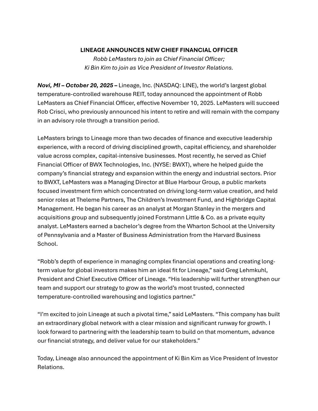 LINEAGE ANNOUNCES NEW CHIEF FINANCIAL OFFICER Robb LeMasters to join as Chief Financial Officer; Ki Bin Kim to join as Vice President of Investor Relations. Novi, MI – October 20, 2025 – Lineage, Inc. (NASDAQ: LINE), the world’s largest global temperature-controlled warehouse REIT, today announced the appointment of Robb LeMasters as Chief Financial Officer, effective November 10, 2025. LeMasters will succeed Rob Crisci, who previously announced his intent to retire and will remain with the company in an advisory role through a transition period. LeMasters brings to Lineage more than two decades of finance and executive leadership experience, with a record of driving disciplined growth, capital efficiency, and shareholder value across complex, capital-intensive businesses. Most recently, he served as Chief Financial Officer of BWX Technologies, Inc. (NYSE: BWXT), where he helped guide the company’s financial strategy and expansion within the energy and industrial sectors. Prior to BWXT, LeMasters was a Managing Director at Blue Harbour Group, a public markets focused investment firm which concentrated on driving long-term value creation, and held senior roles at Theleme Partners, The Children’s Investment Fund, and Highbridge Capital Management. He began his career as an analyst at Morgan Stanley in the mergers and acquisitions group and subsequently joined Forstmann Little & Co. as a private equity analyst. LeMasters earned a bachelor’s degree from the Wharton School at the University of Pennsylvania and a Master of Business Administration from the Harvard Business School. “Robb’s depth of experience in managing complex financial operations and creating long- term value for global investors makes him an ideal fit for Lineage,” said Greg Lehmkuhl, President and Chief Executive Officer of Lineage. “His leadership will further strengthen our team and support our strategy to grow as the world’s most trusted, connected temperature-controlled warehousing and logistics partner.” “I’m excited to join Lineage at such a pivotal time,” said LeMasters. “This company has built an extraordinary global network with a clear mission and significant runway for growth. I look forward to partnering with the leadership team to build on that momentum, advance our financial strategy, and deliver value for our stakeholders.” Today, Lineage also announced the appointment of Ki Bin Kim as Vice President of Investor Relations.